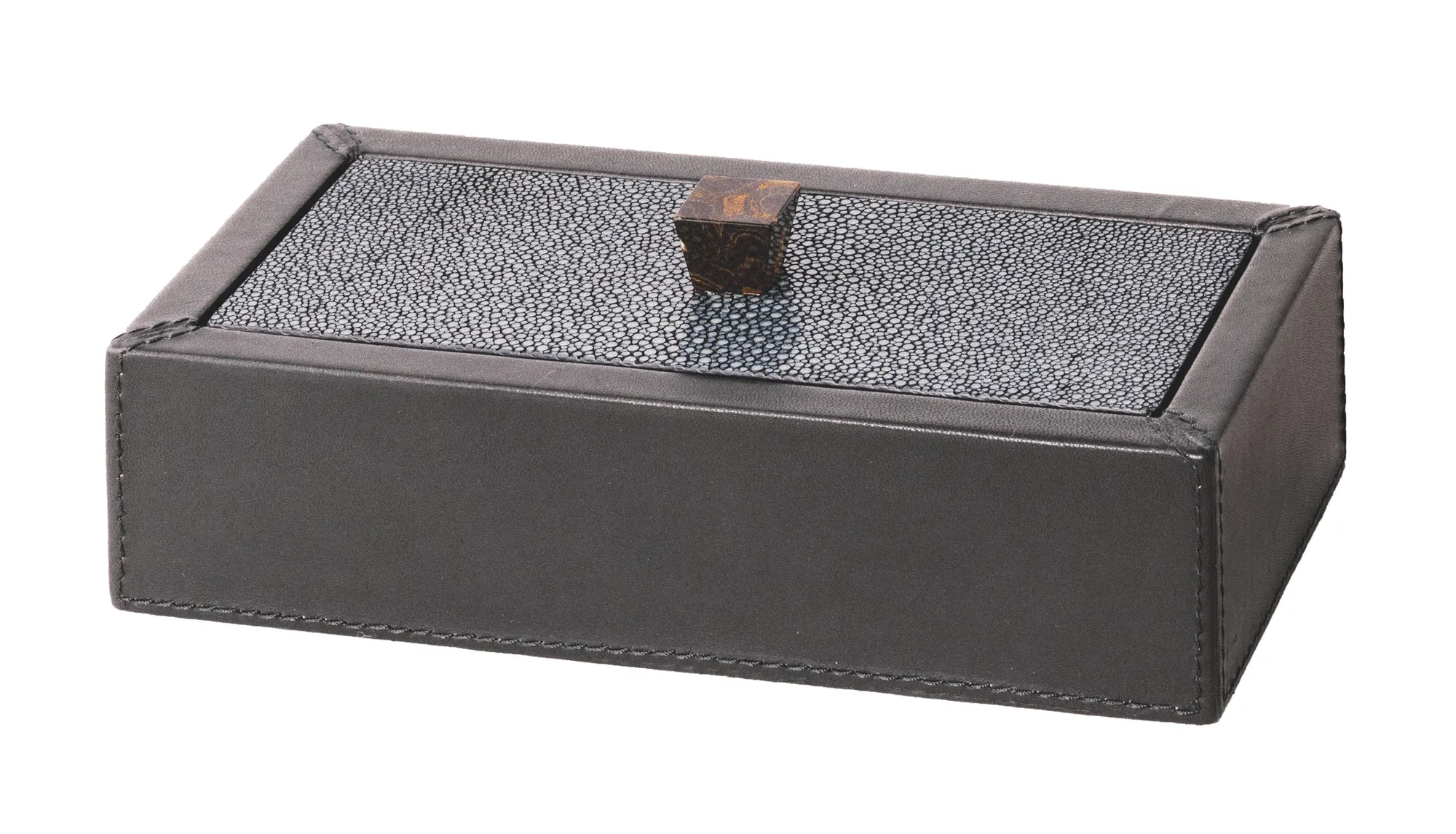 Leather covered wood structure with bronzite / lapis lazuli / malachite knob: natural, semi-precious stones. Each stone is different from the others. Removable lid.