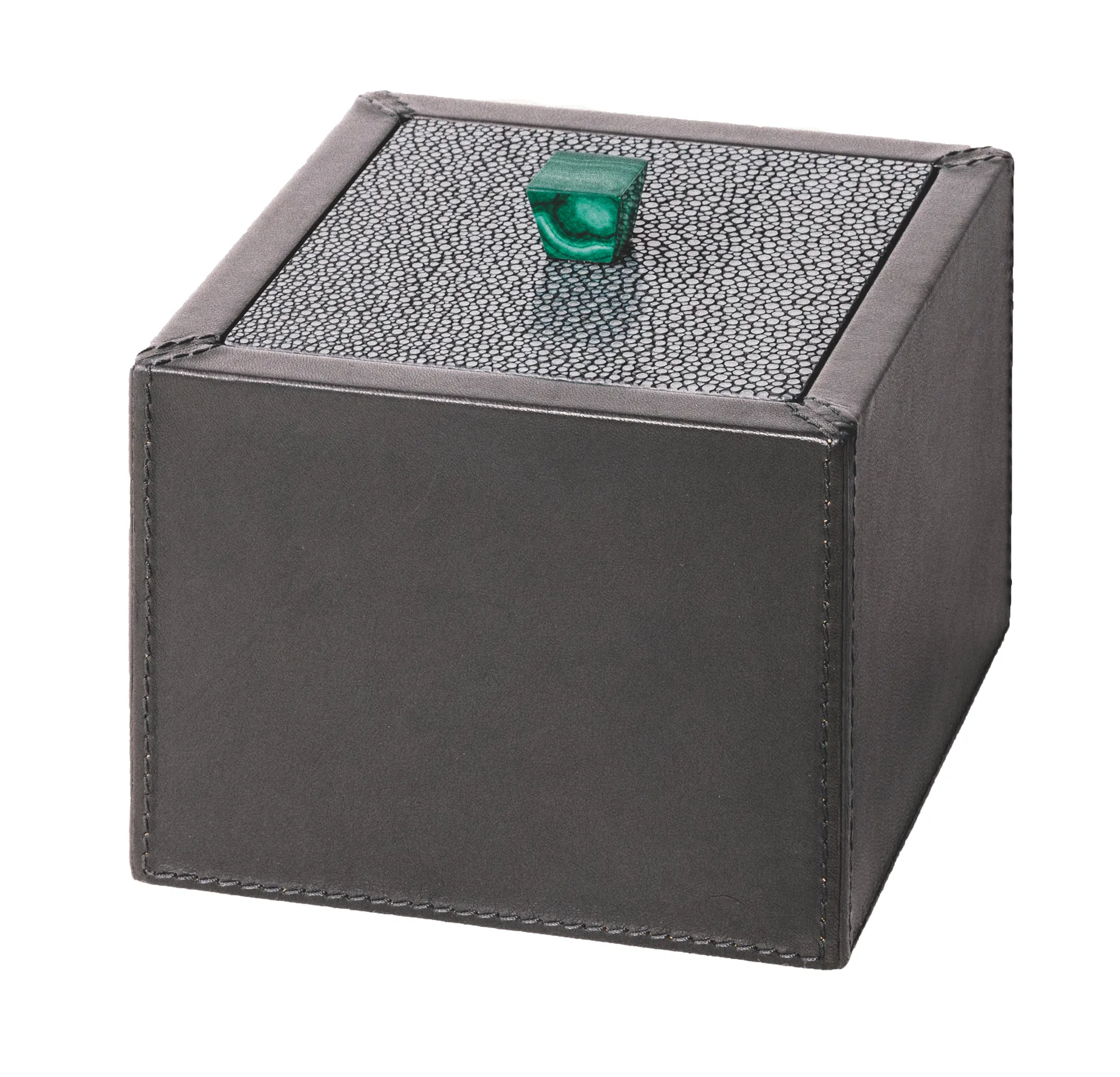 Leather covered wood structure with bronzite / lapis lazuli / malachite knob: natural, semi-precious stones. Each stone is different from the others. Removable lid.