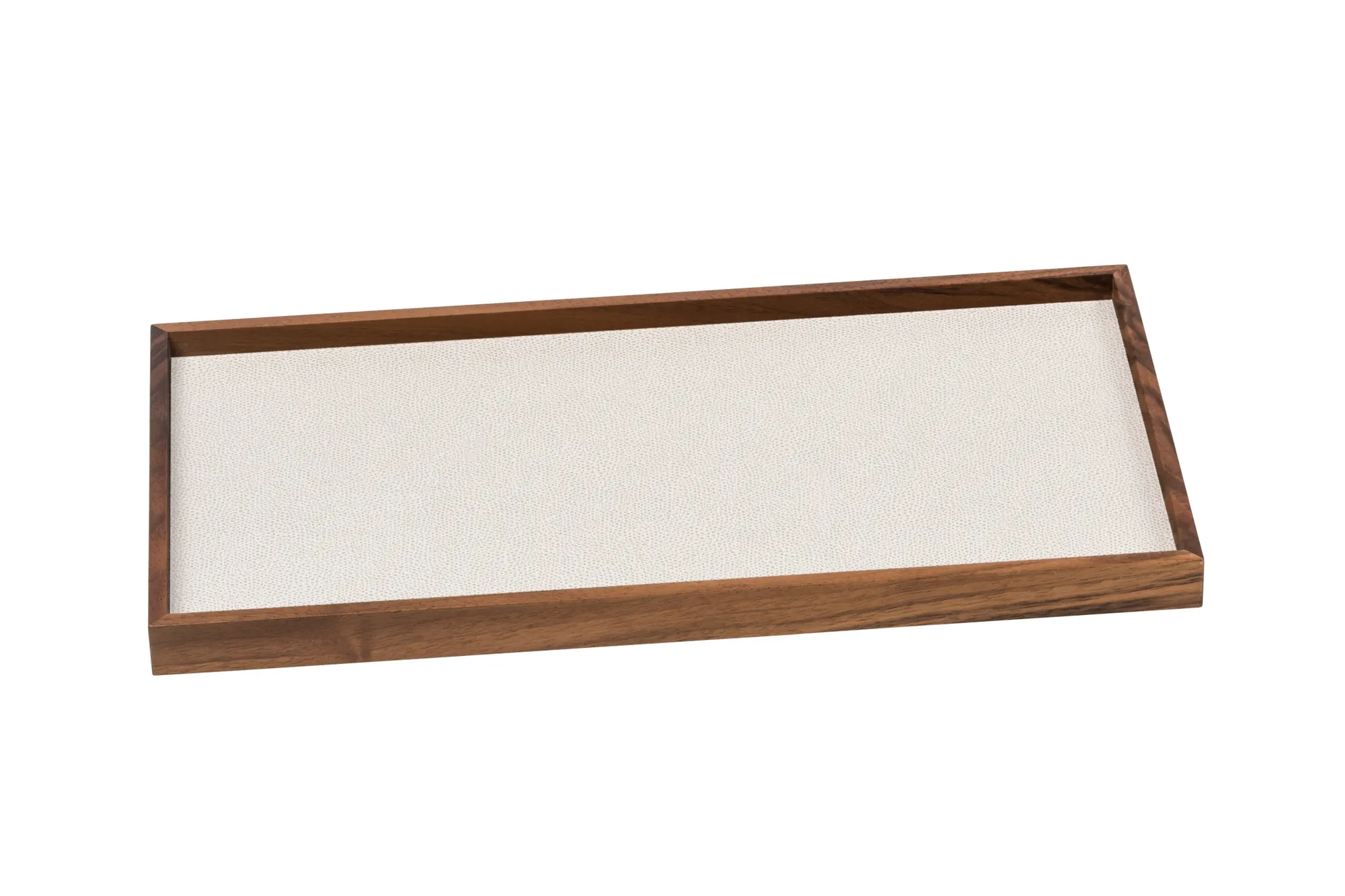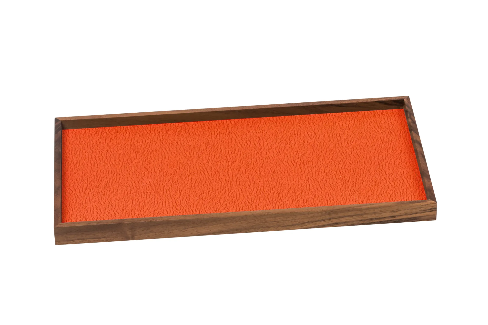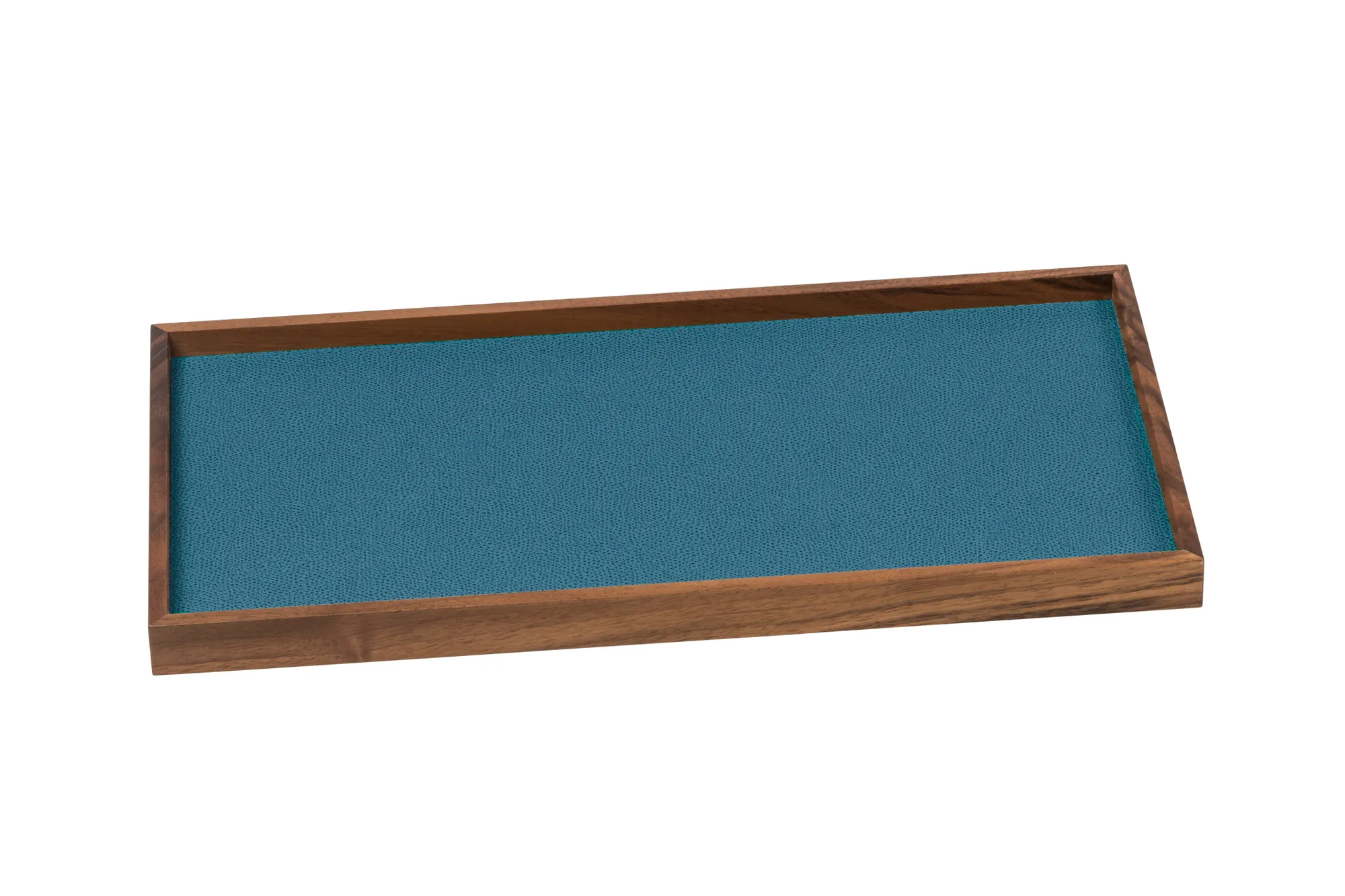 Phorma is a series of wooden trays with a leather lining in geometric shapes that fit inside each other. Like a game, you can get as many configurations as you wish, always creating different designs. The three-dimensions optical effect is implemented by the edges contrasting wooden finishes, which can be in natural walnut or wenge stained walnut.