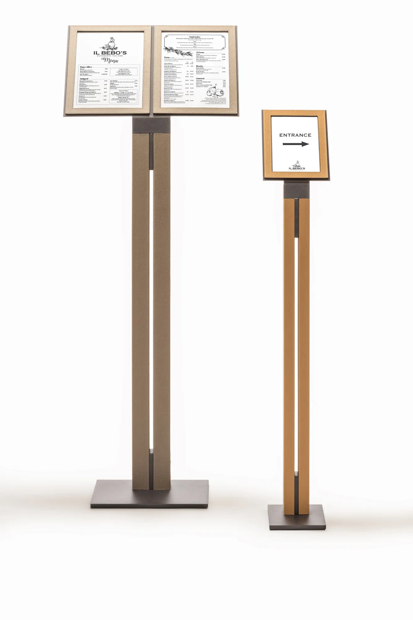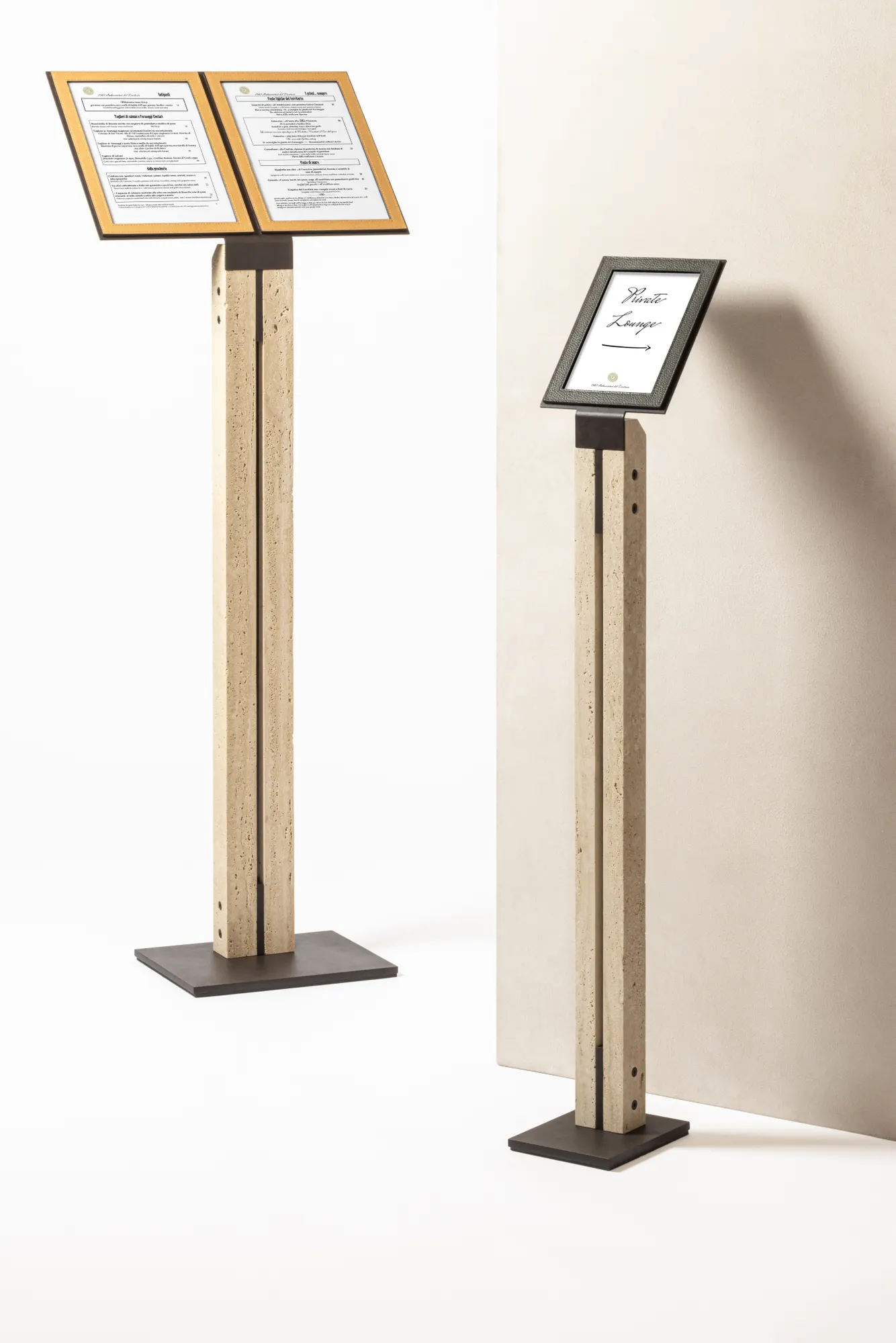 Pillar is an exquisite collection of frames and menu stands that elegantly blend sophistication with contemporary design. Each piece features a meticulously crafted metal frame featuring luxurious all-leather accents or an elegant combination of leather and travertine. Available in two heights and either single or double configuration, this series' stands offer exceptional versatility for any display. Perfect for showcasing restaurant menus or spa and hospitality information, "Pillar" redefines presentation. The distinctive monolithic column-like base, reminiscent of classic essential architecture, imparts a sense of timeless strength and elegance, making this collection an ideal addition to both modern and classic interiors. Design by Simone Fanciullacci.
