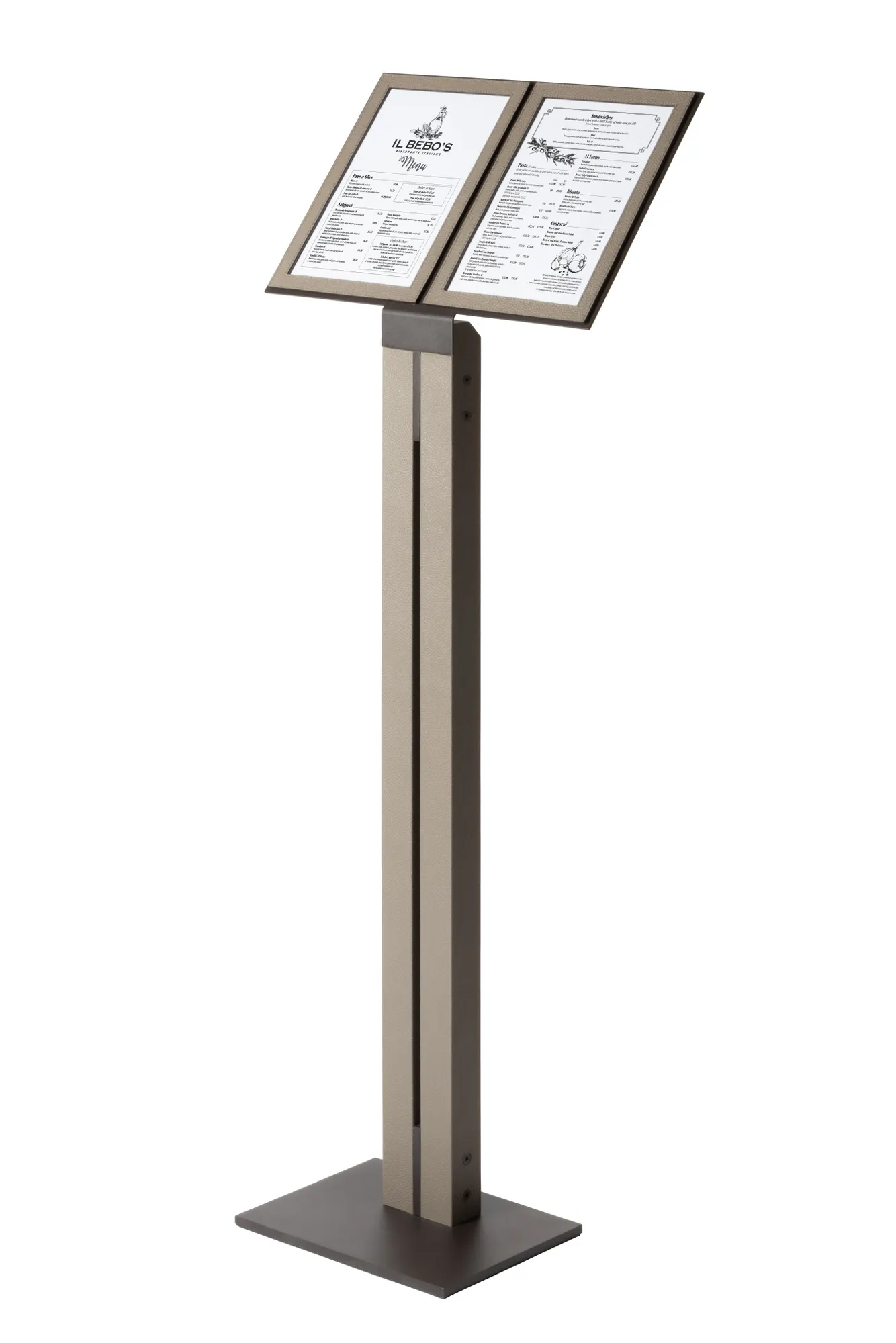 Pillar is an exquisite collection of frames and menu stands that elegantly blend sophistication with contemporary design. Each piece features a meticulously crafted metal frame featuring luxurious all-leather accents or an elegant combination of leather and travertine. Available in two heights and either single or double configuration, this series' stands offer exceptional versatility for any display. Perfect for showcasing restaurant menus or spa and hospitality information, "Pillar" redefines presentation. The distinctive monolithic column-like base, reminiscent of classic essential architecture, imparts a sense of timeless strength and elegance, making this collection an ideal addition to both modern and classic interiors. Design by Simone Fanciullacci.