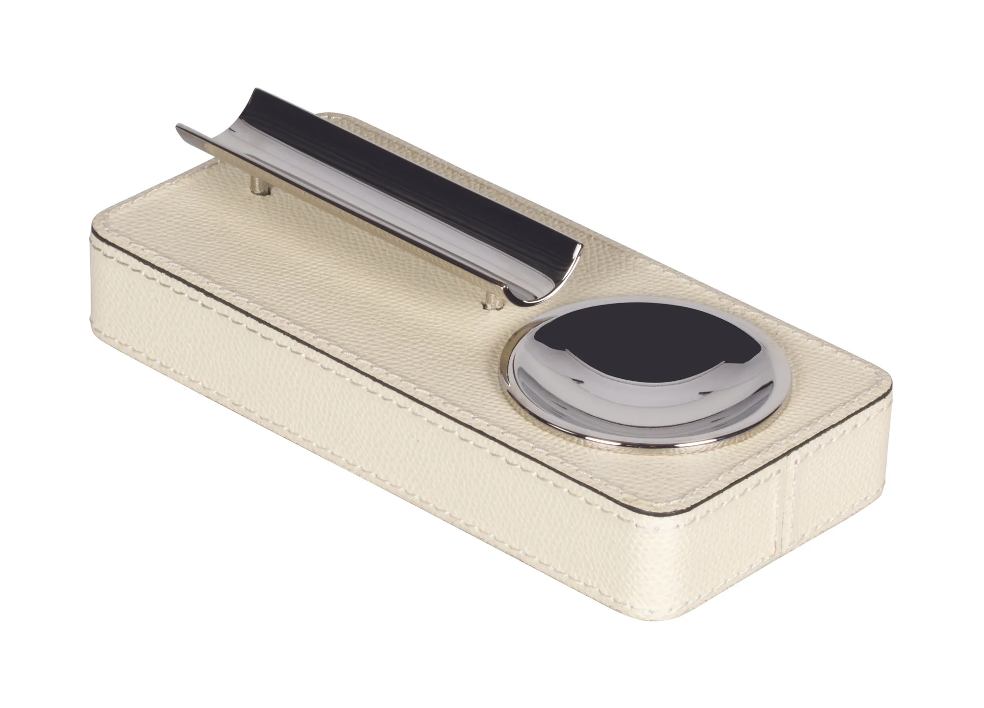 Leather covered wood structure with chrome metal basin and cigar holder.