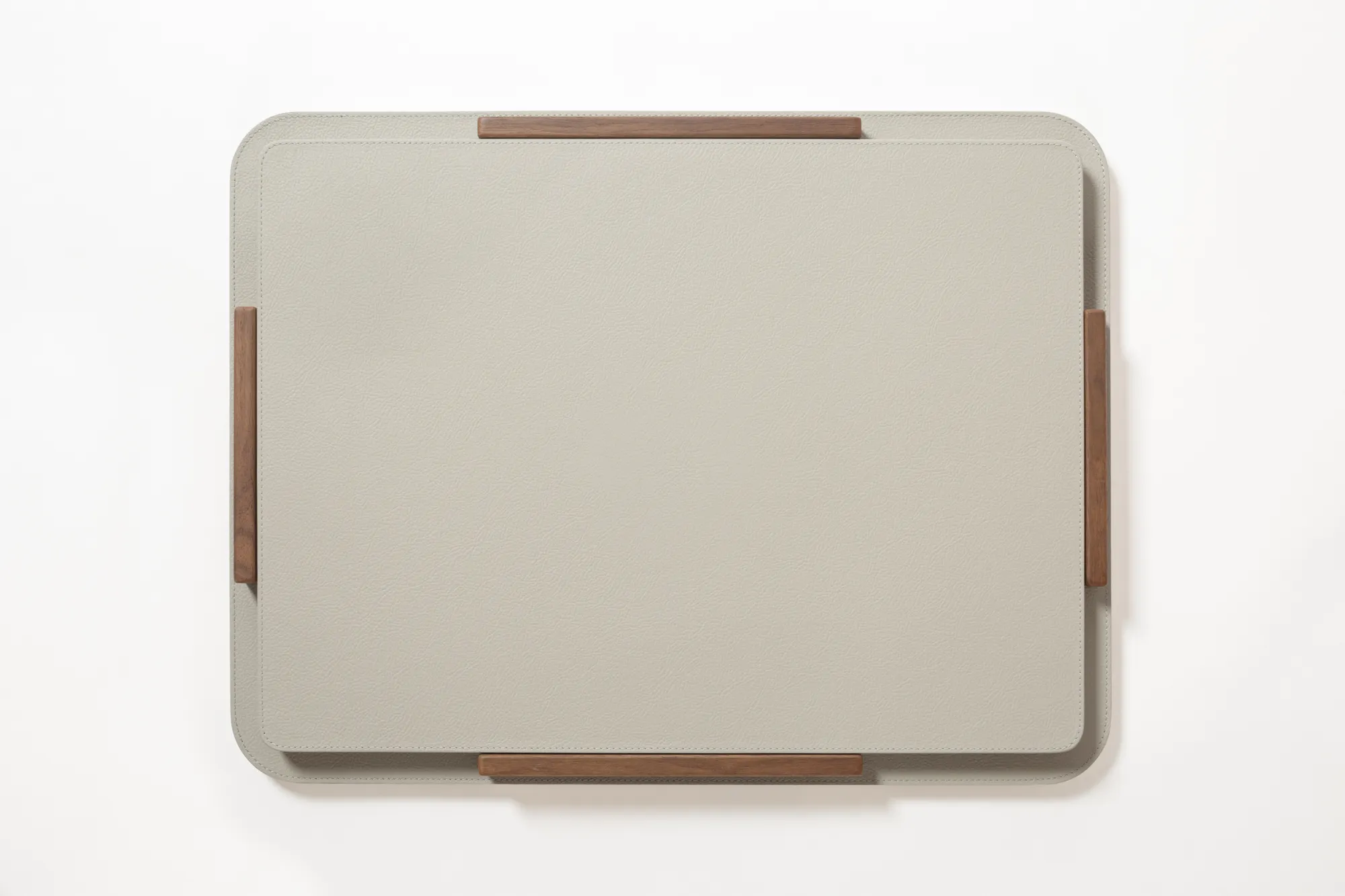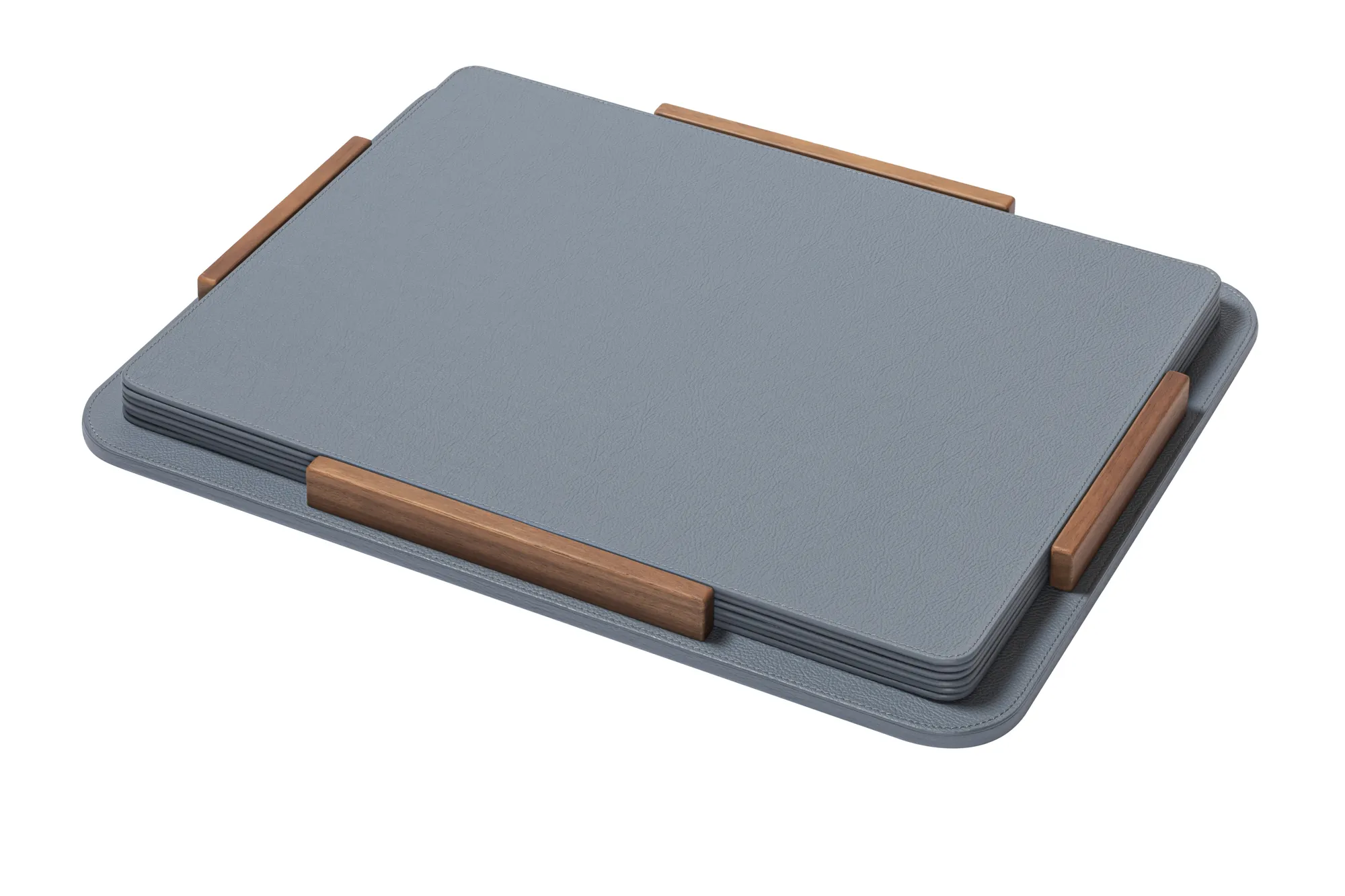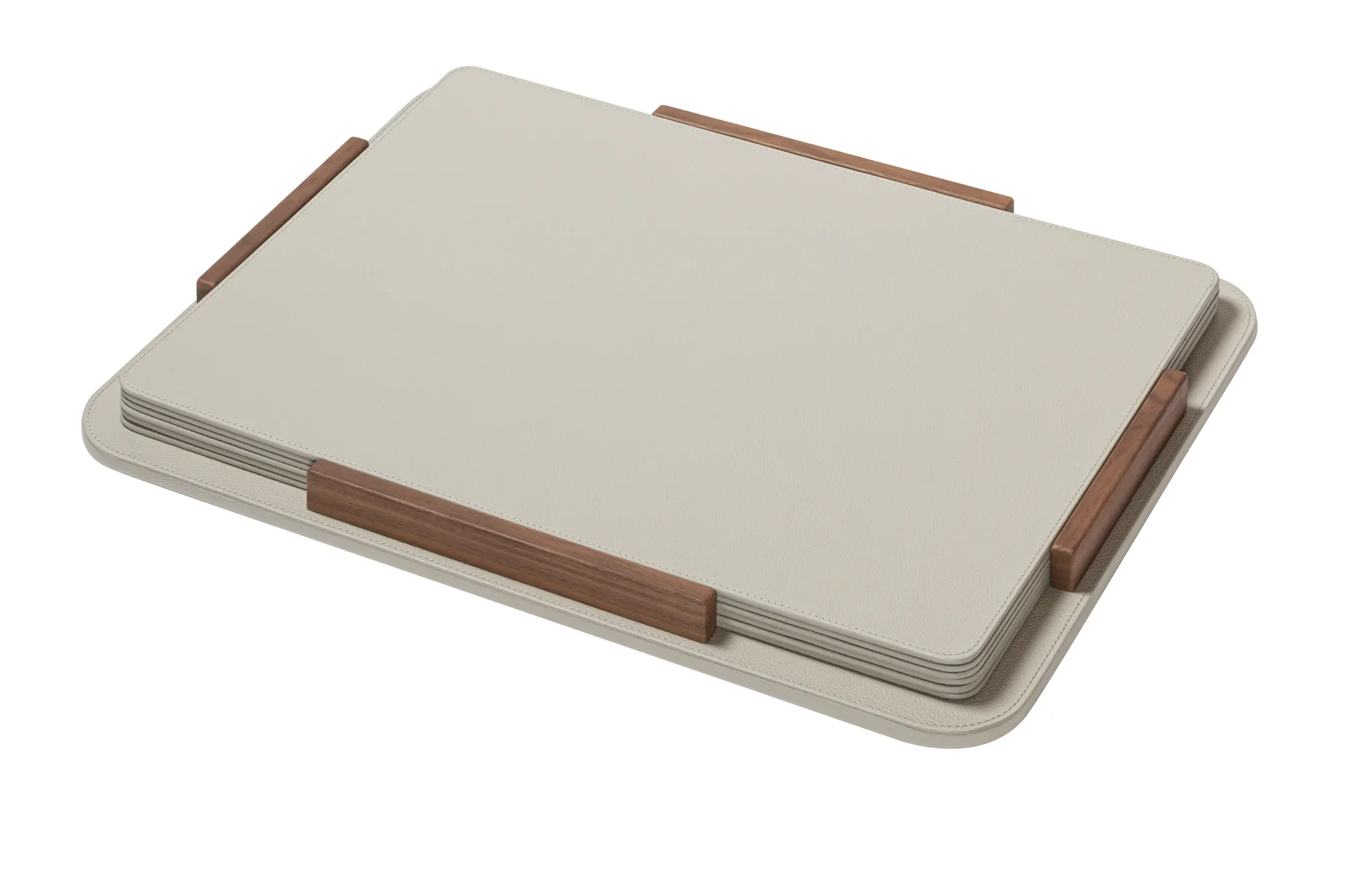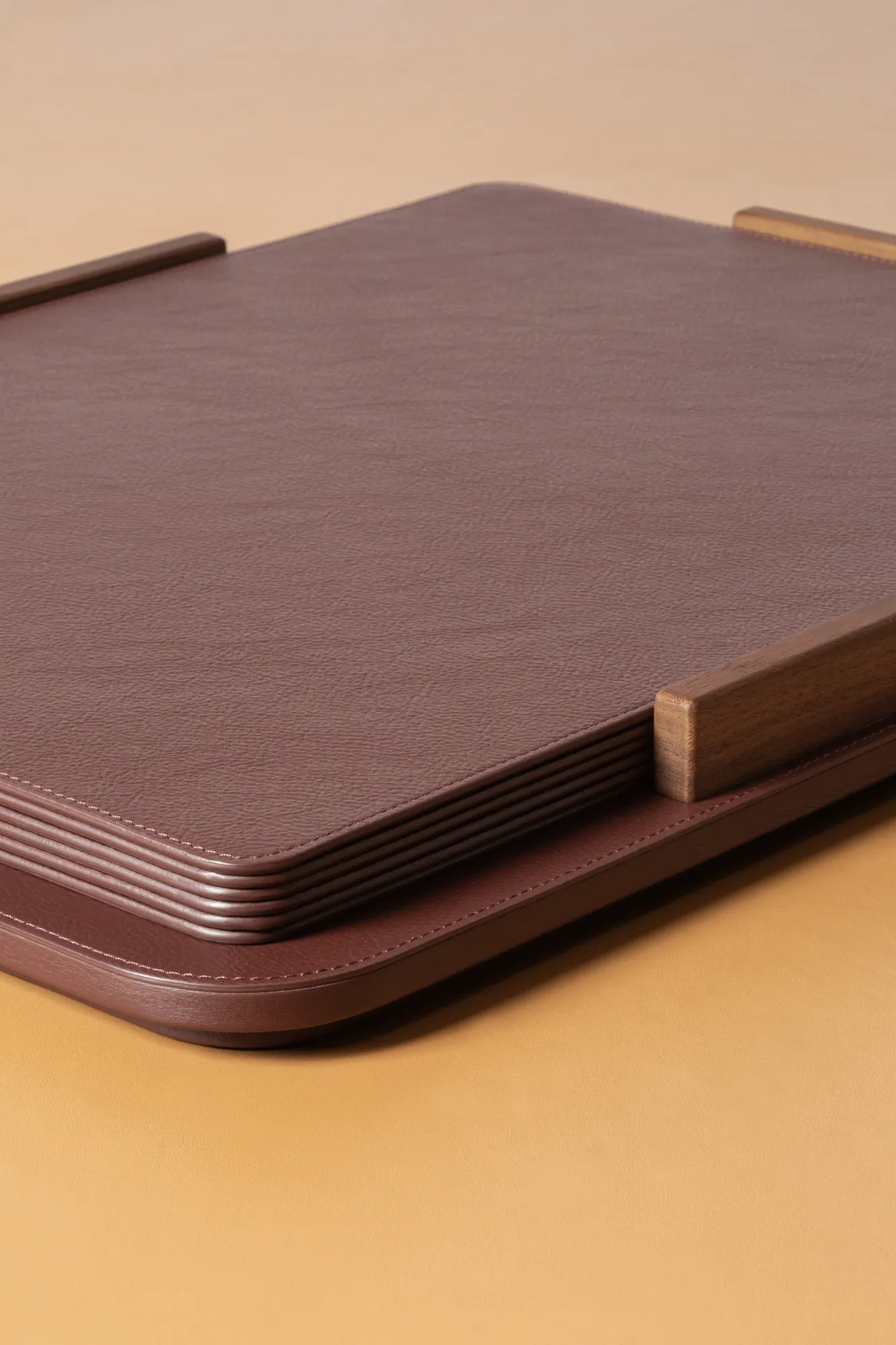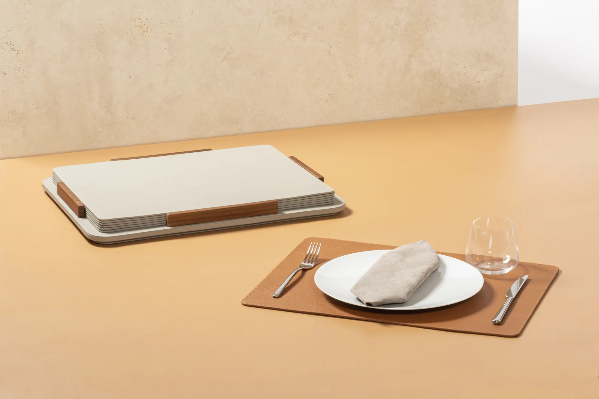 All-leather placemats. Leather-covered placemat holder with walnut wood inserts. The complete set contains: - x6 leather placemats - x1 leather placemat holder Entirely made in Pelle Frau®.