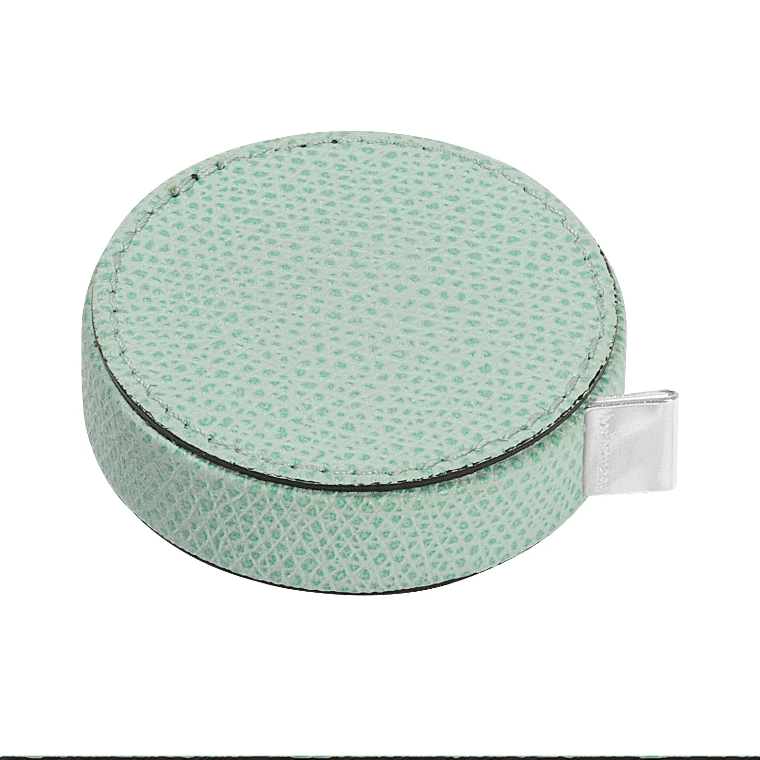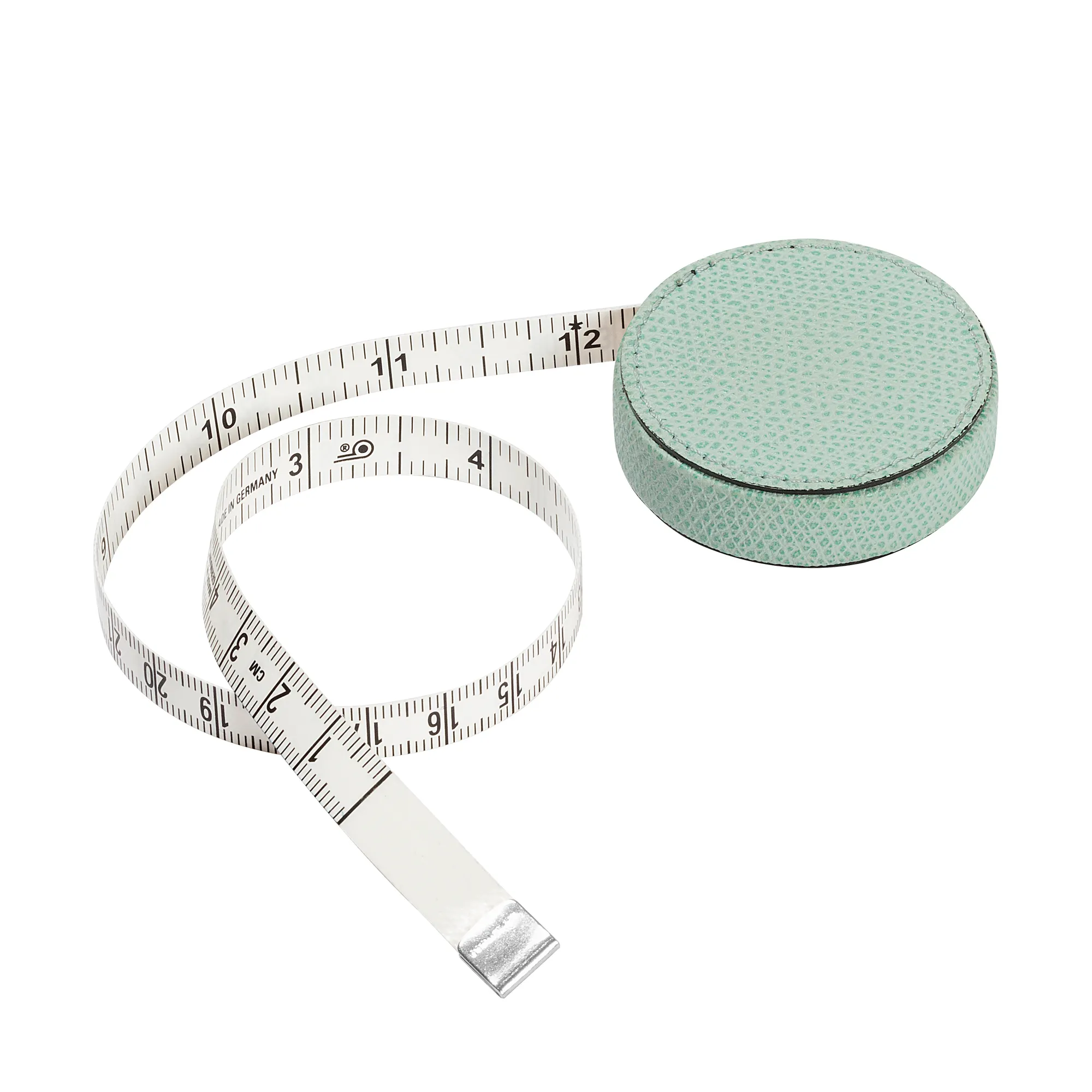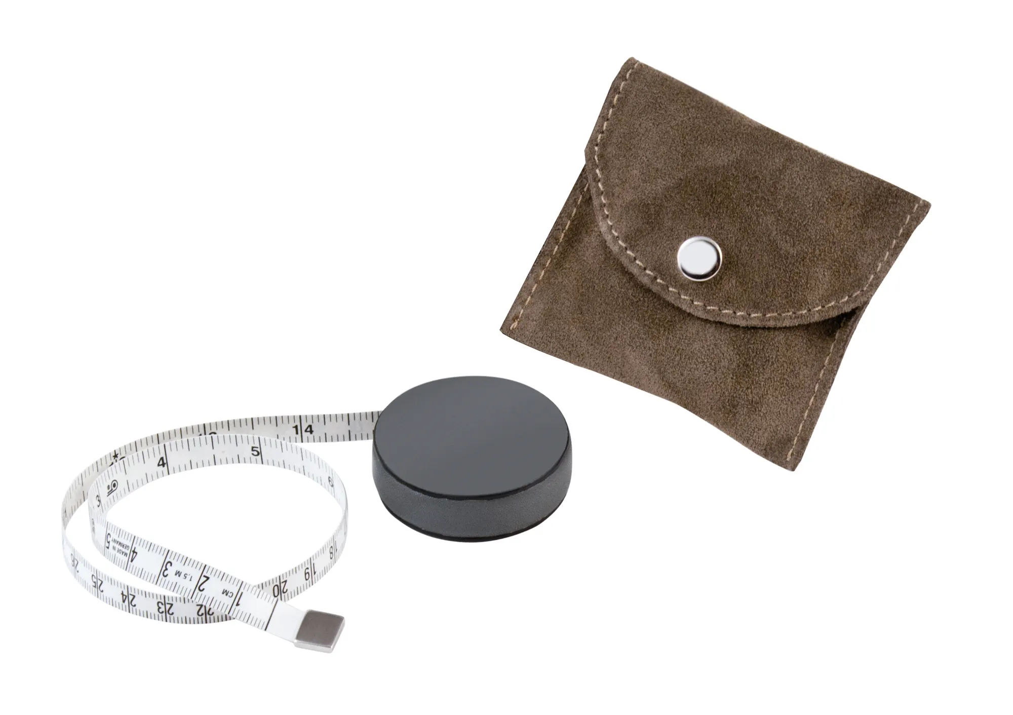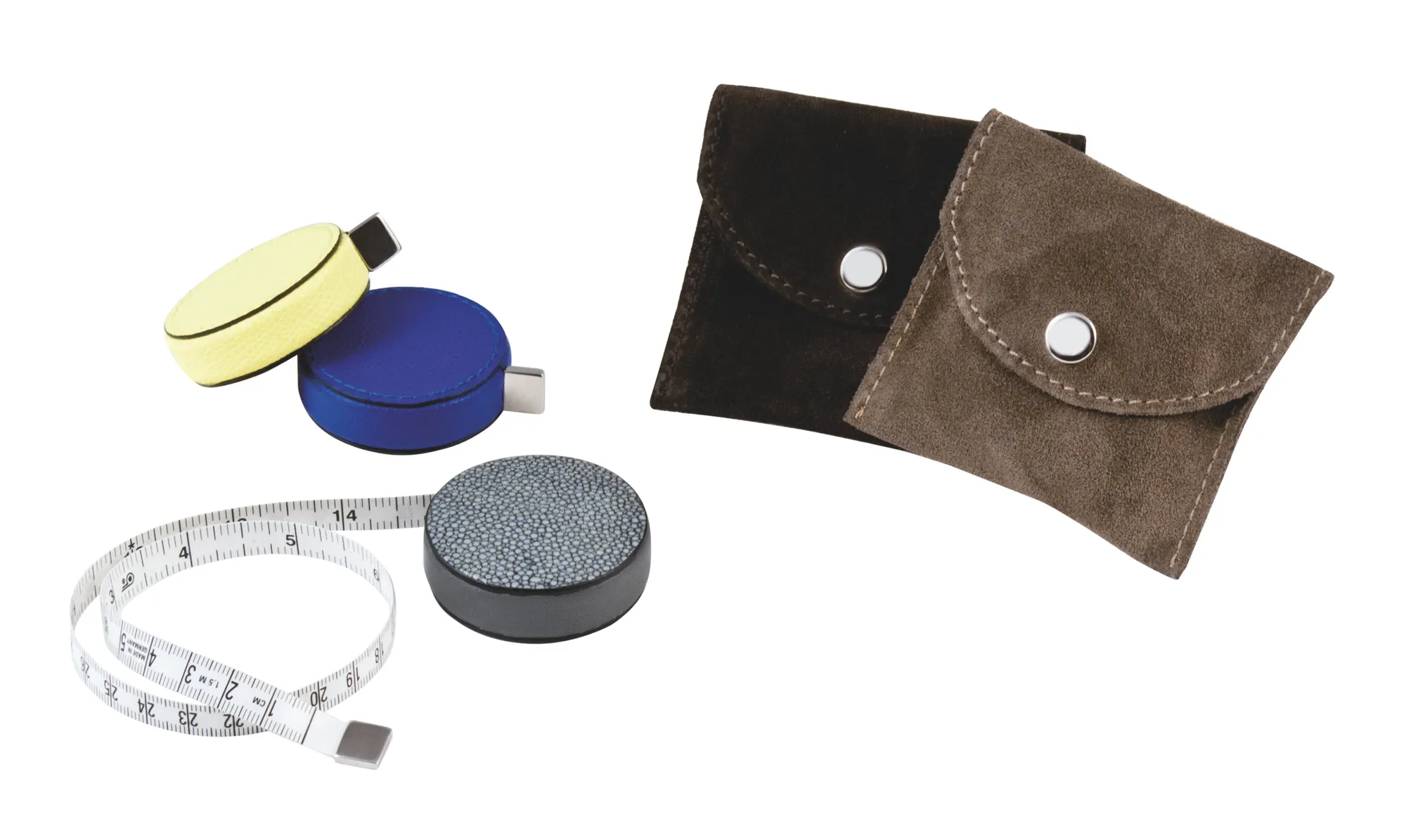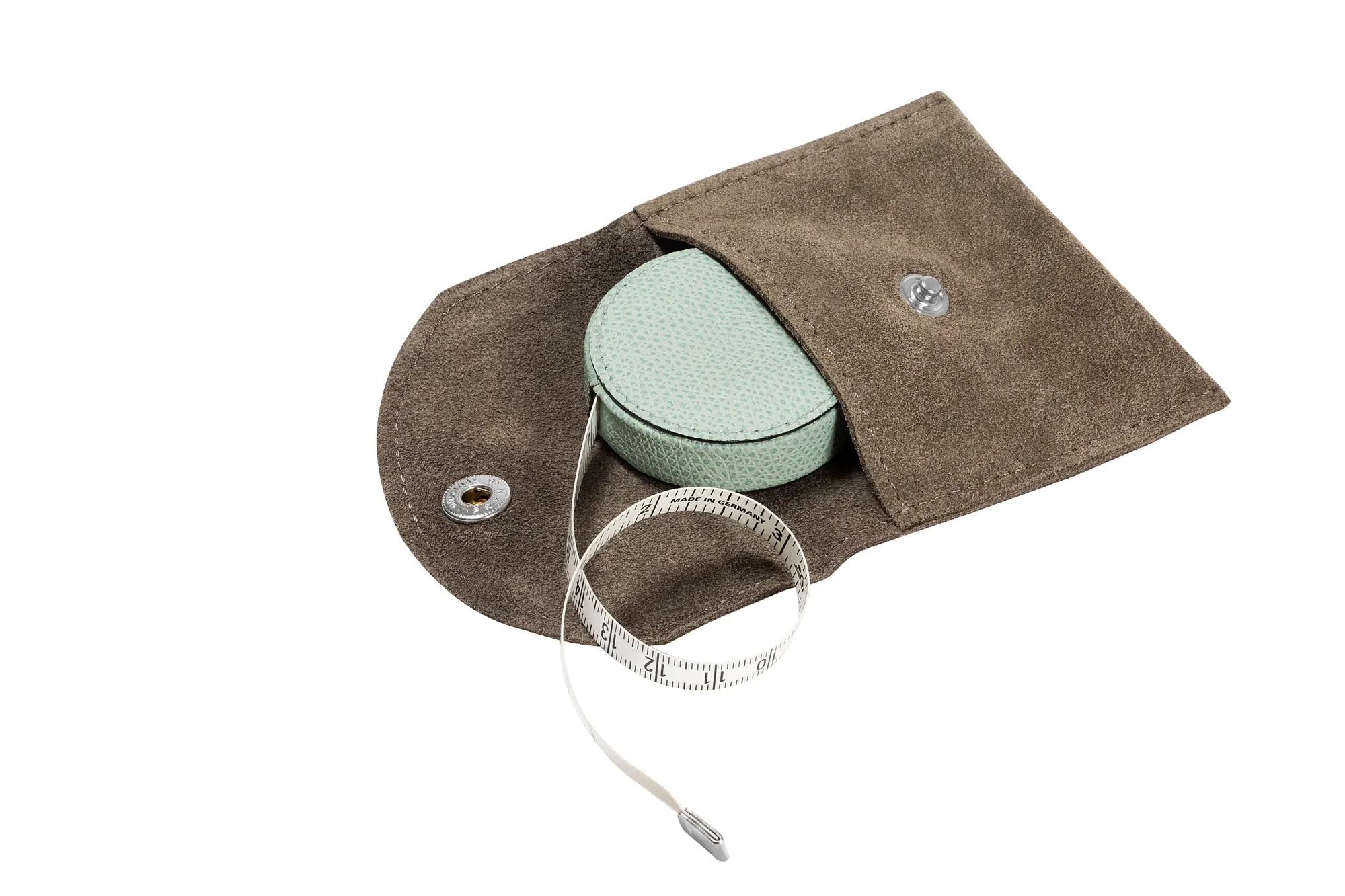 Leather covered german quality pocket roller tape measure. Comes together with a suede pouch.