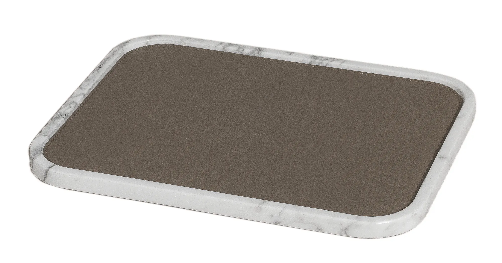 Marble piece with leather insert and bottom in suede. Each piece offers a unique stone pattern. Custom sizes available on request.