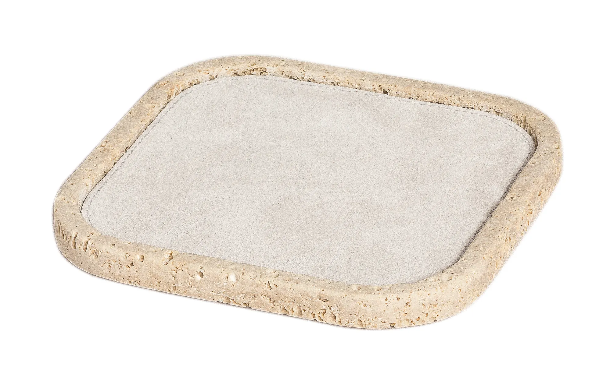 Marble piece with leather insert and bottom in suede. Each piece offers a unique stone pattern. Custom sizes available on request.