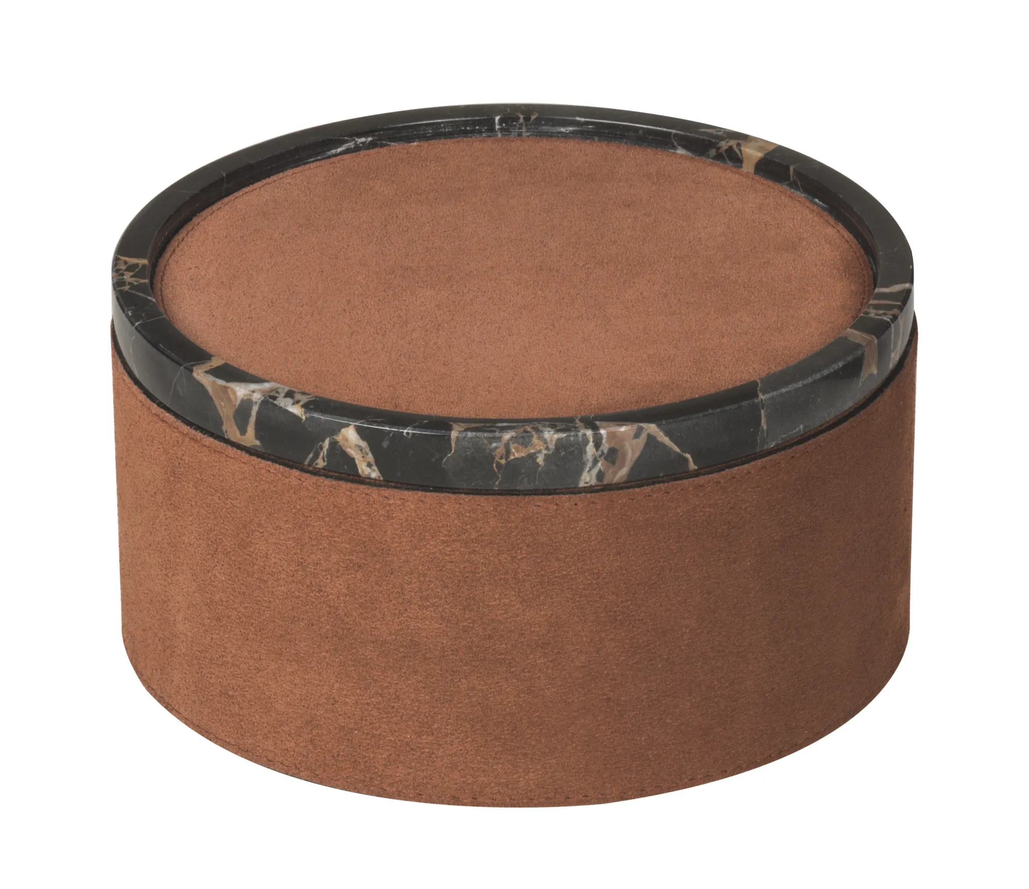 Leather-covered wooden structure with a marble frame applied to the lid, which also works as valet tray. Available in five different finishes. A double level base with different dimensions makes this piece stackable.