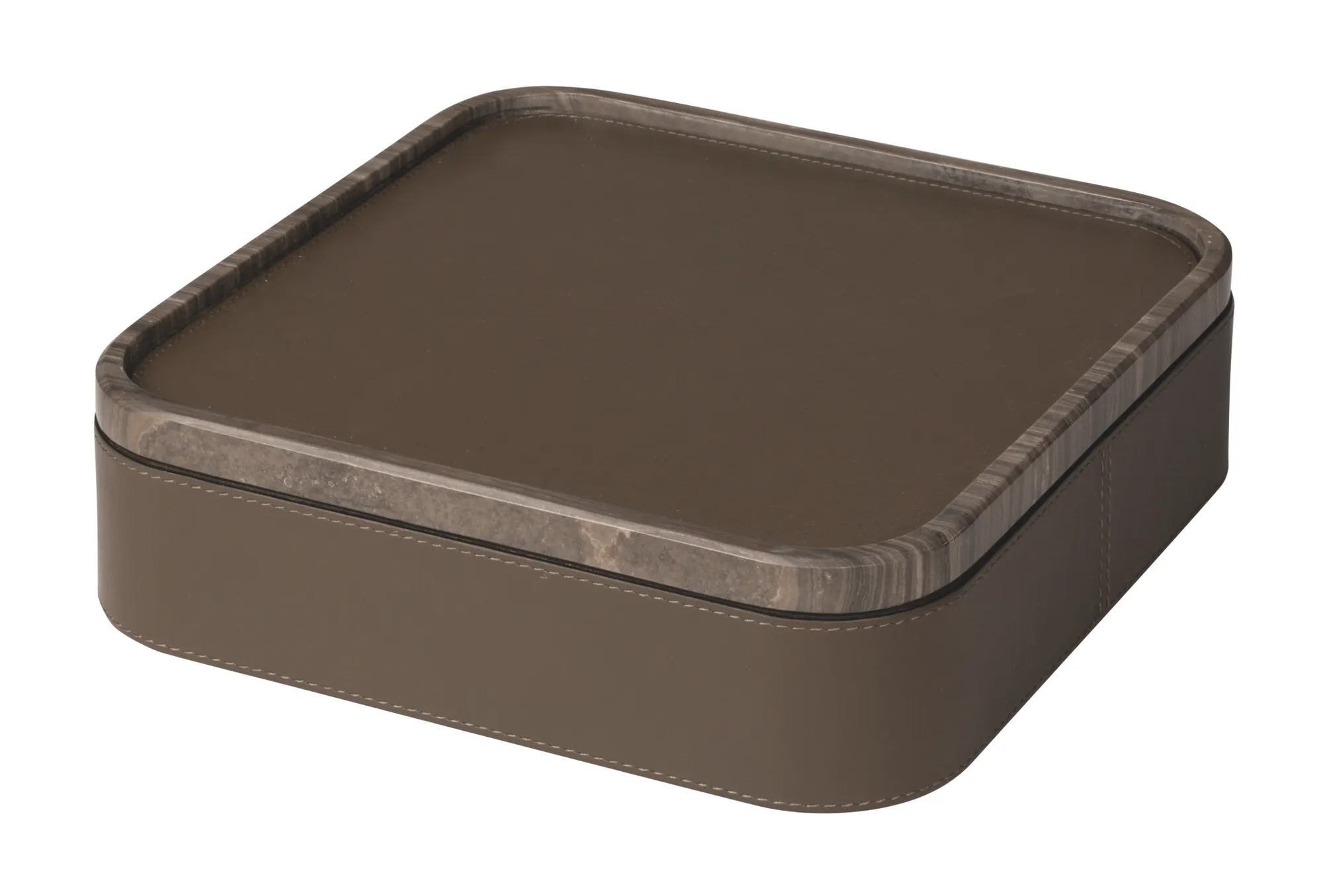 Leather-covered wooden structure with a marble frame applied to the lid, which also works as valet tray. Available in five different finishes. A double level base with different dimensions makes this piece stackable.