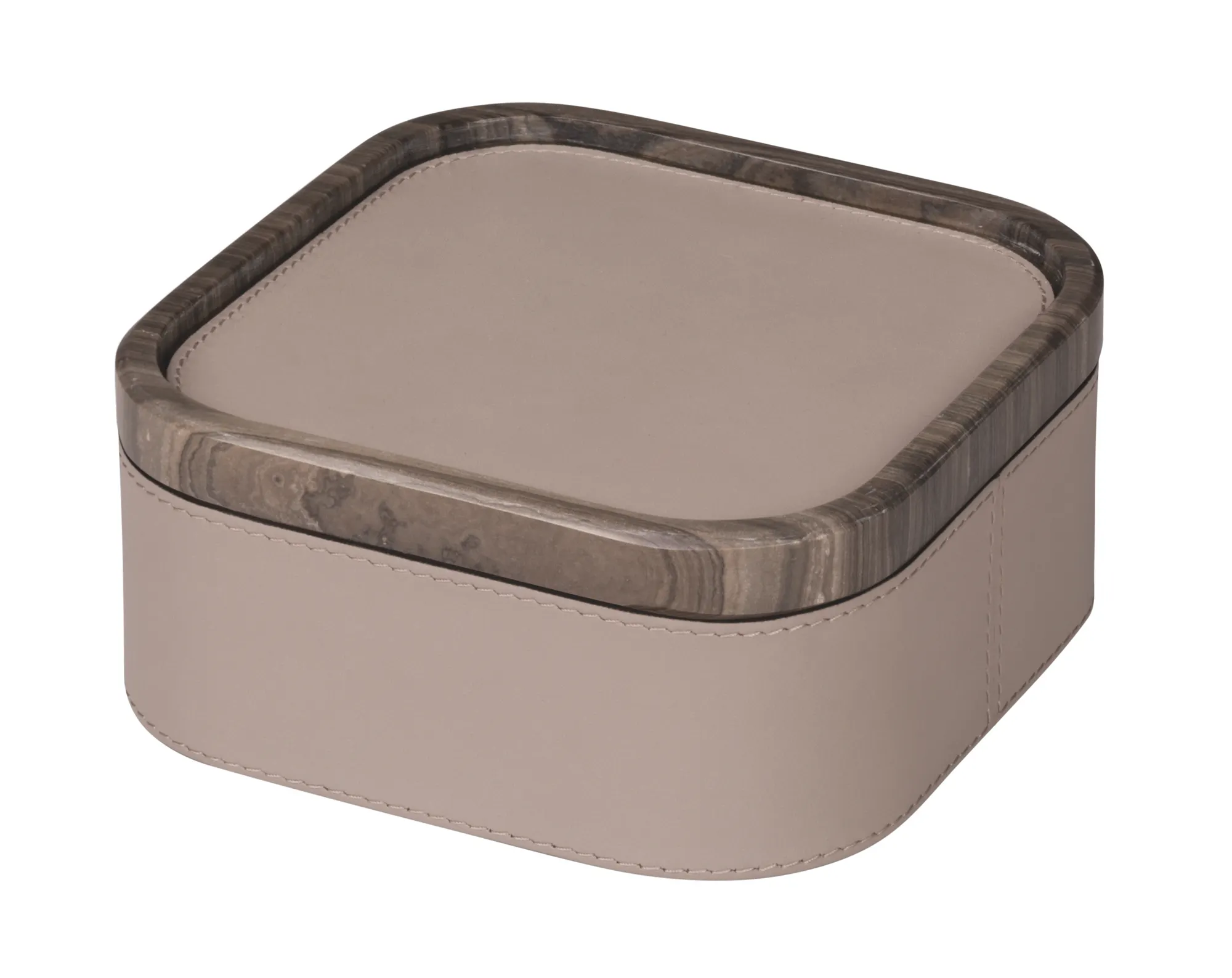 Leather-covered wooden structure with a marble frame applied to the lid, which also works as valet tray. Available in five different finishes. A double level base with different dimensions makes this piece stackable.