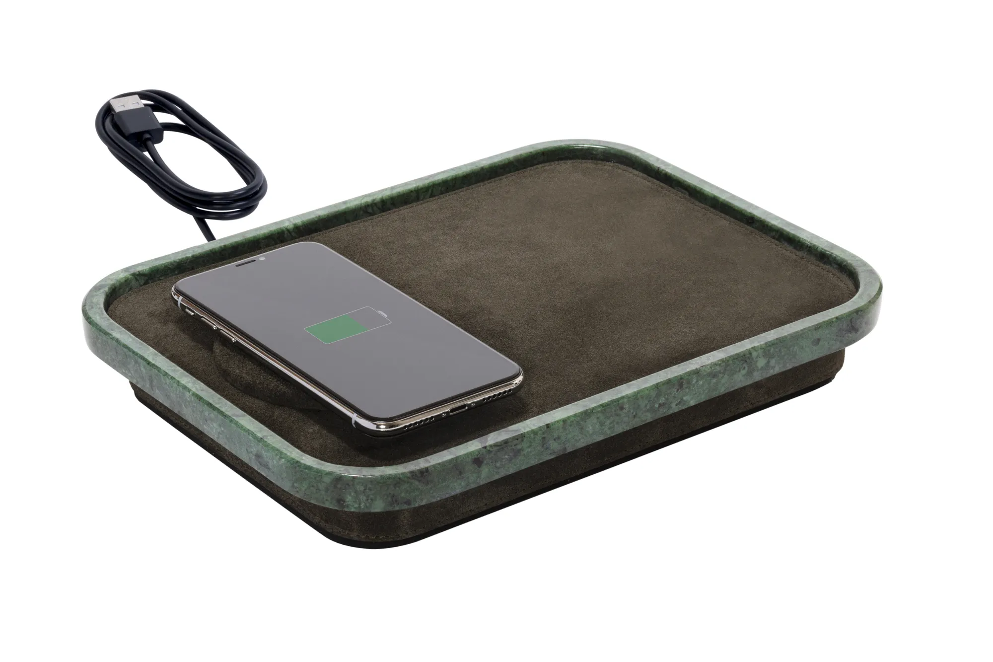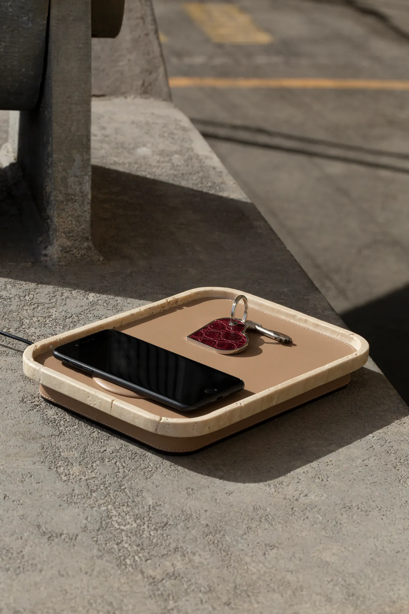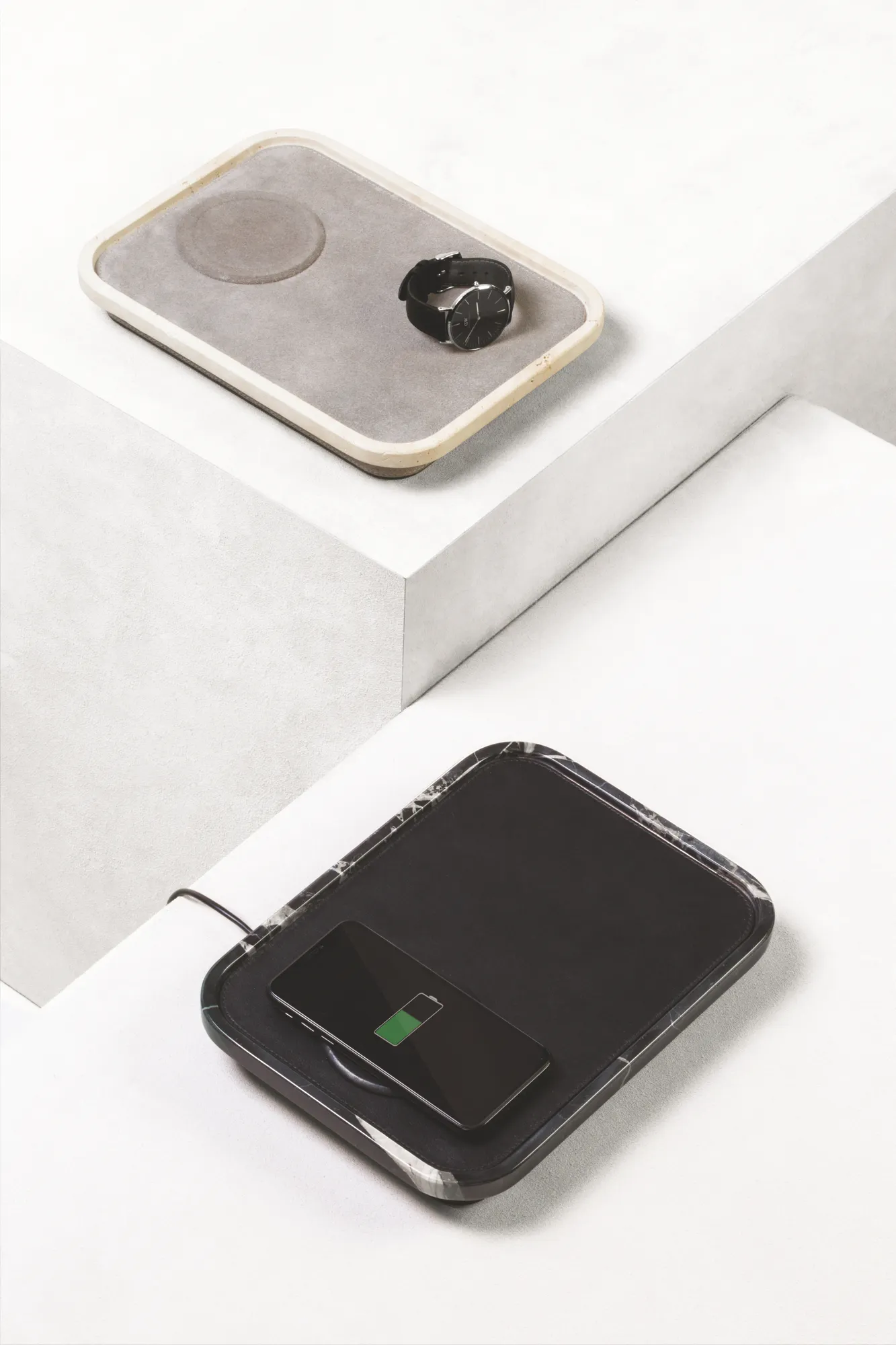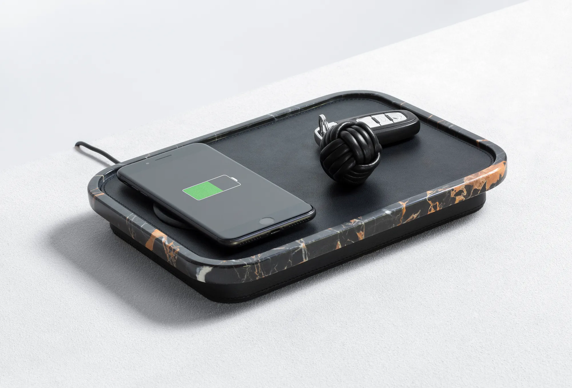 Leather-covered wooden structure with a marble frame available in five different finishes. A wireless Certified Qi standard charger, adopted by the largest mobile devices manufacturers, is integrated on the top. This product can be used as a valet tray as well. Supplied with USB type A cord (2.5 m) + mobile charger with 4 plugs: 2P Euro / BS / US / Australia-C.