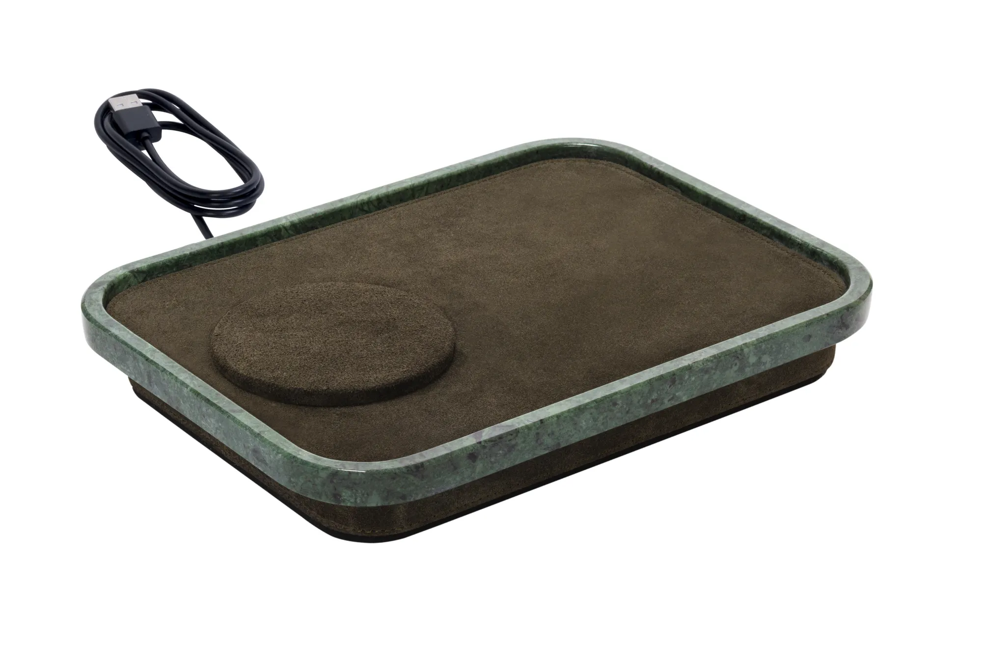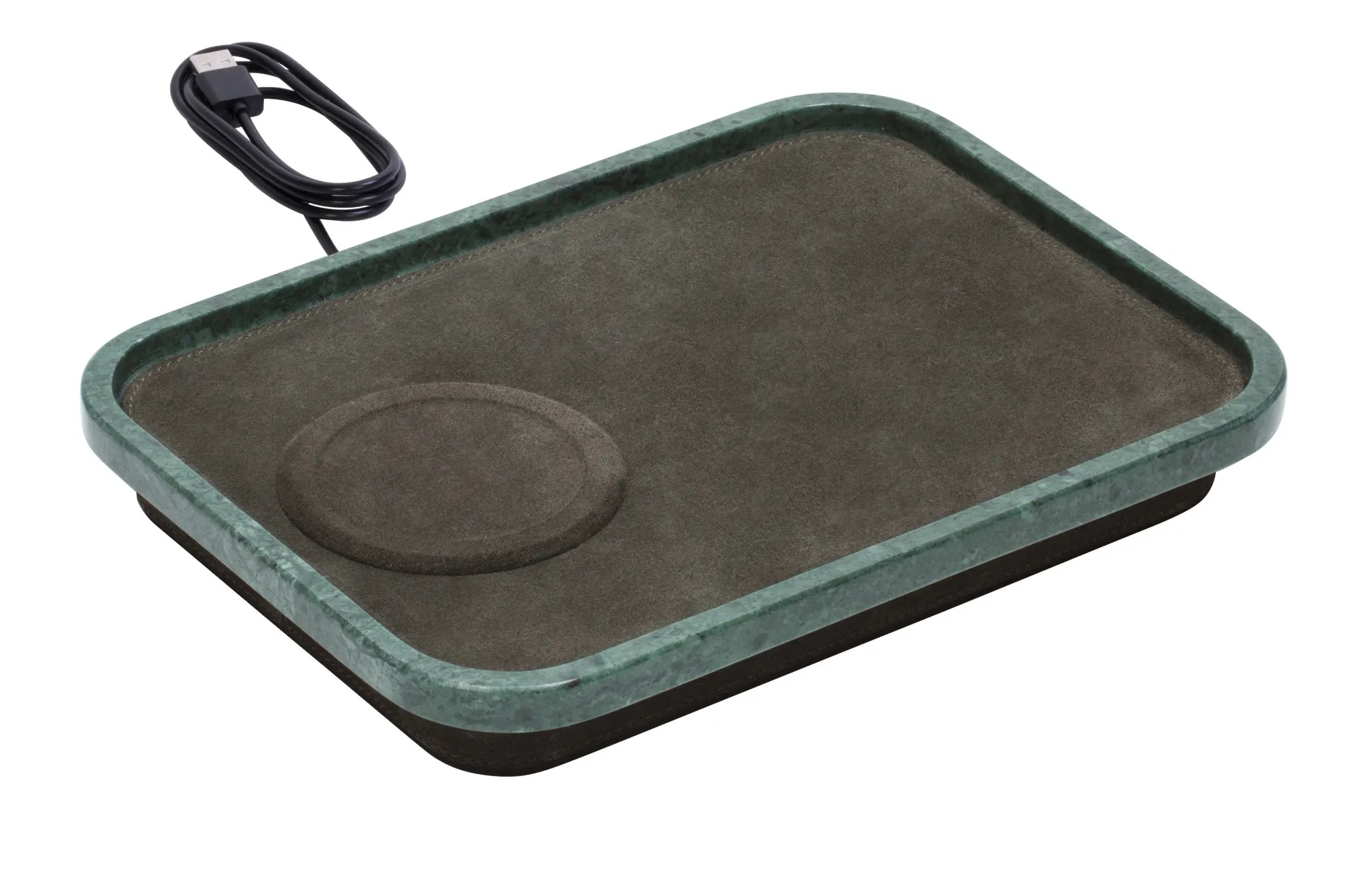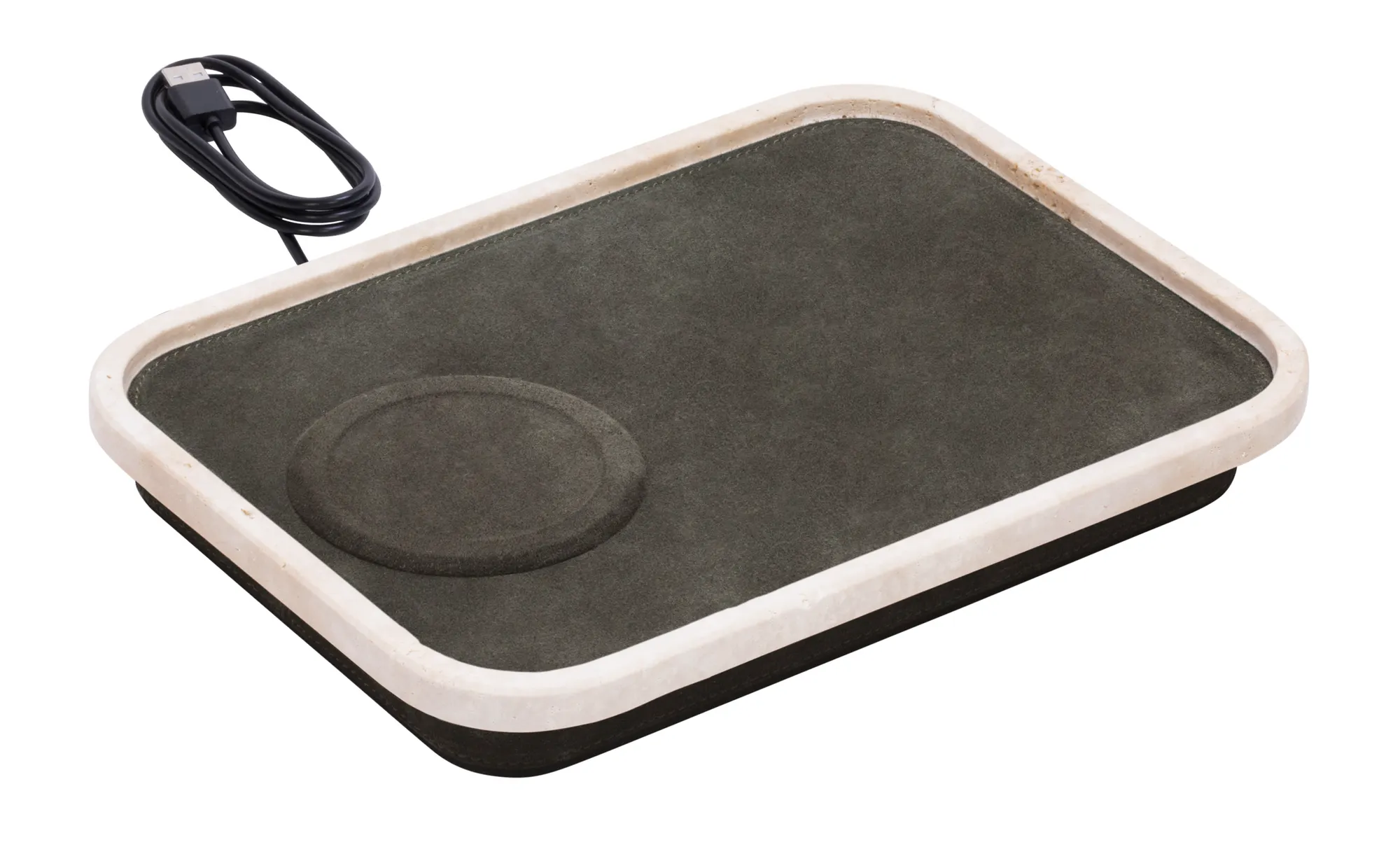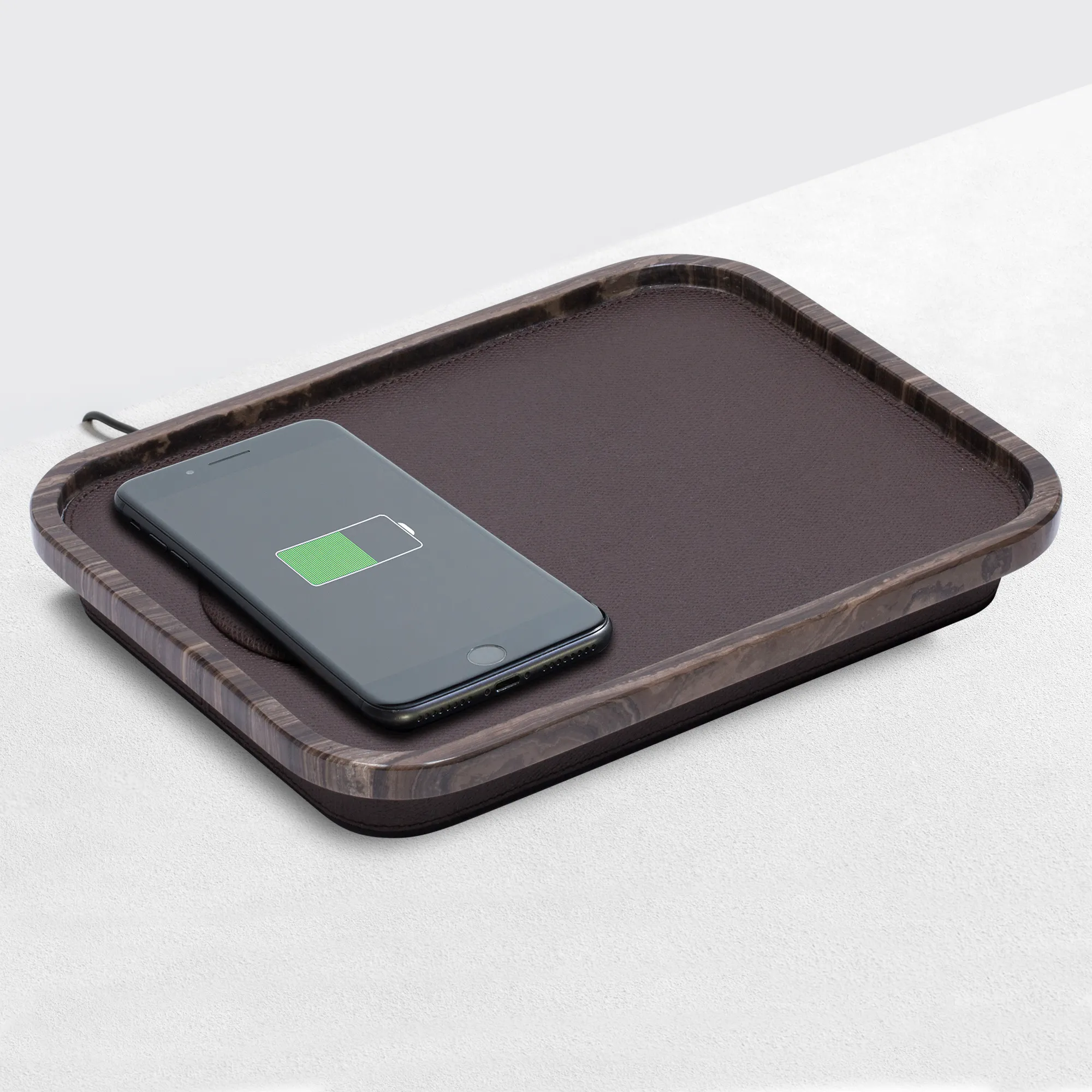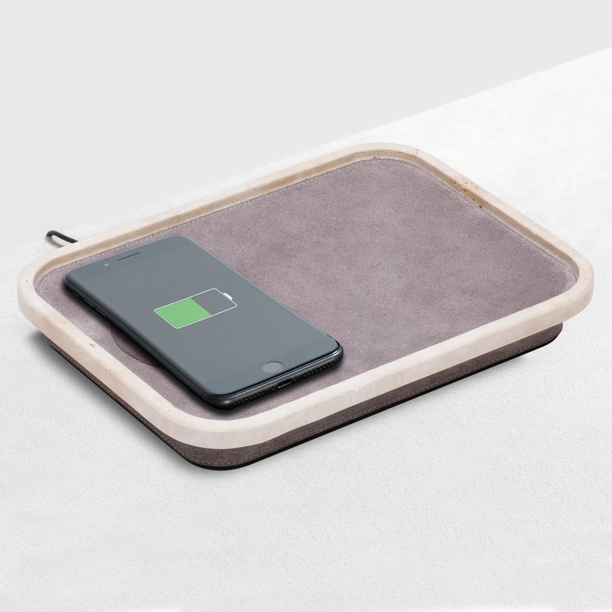 Leather-covered wooden structure with a marble frame available in five different finishes. A wireless Certified Qi standard charger, adopted by the largest mobile devices manufacturers, is integrated on the top. This product can be used as a valet tray as well. Supplied with USB type A cord (2.5 m) + mobile charger with 4 plugs: 2P Euro / BS / US / Australia-C.