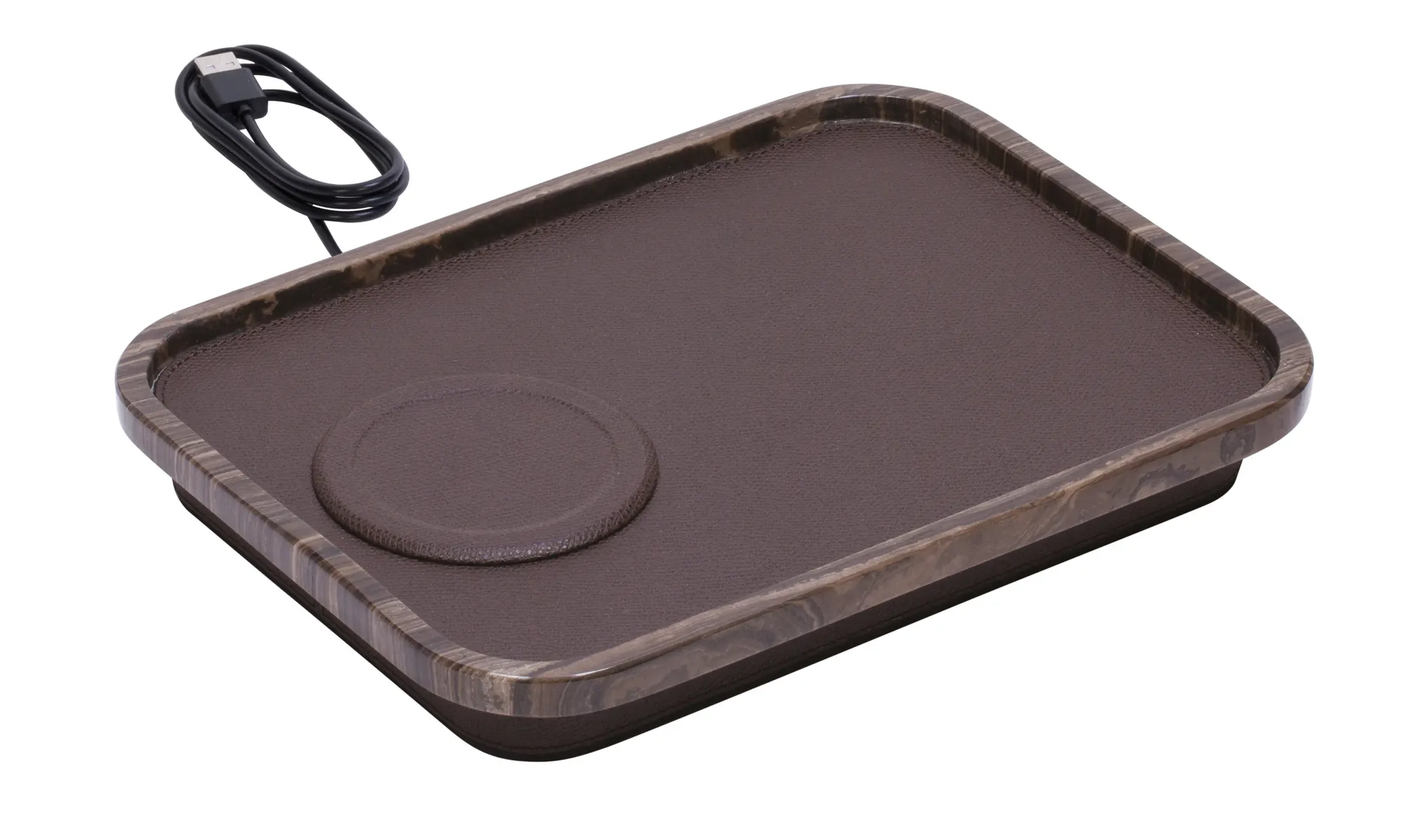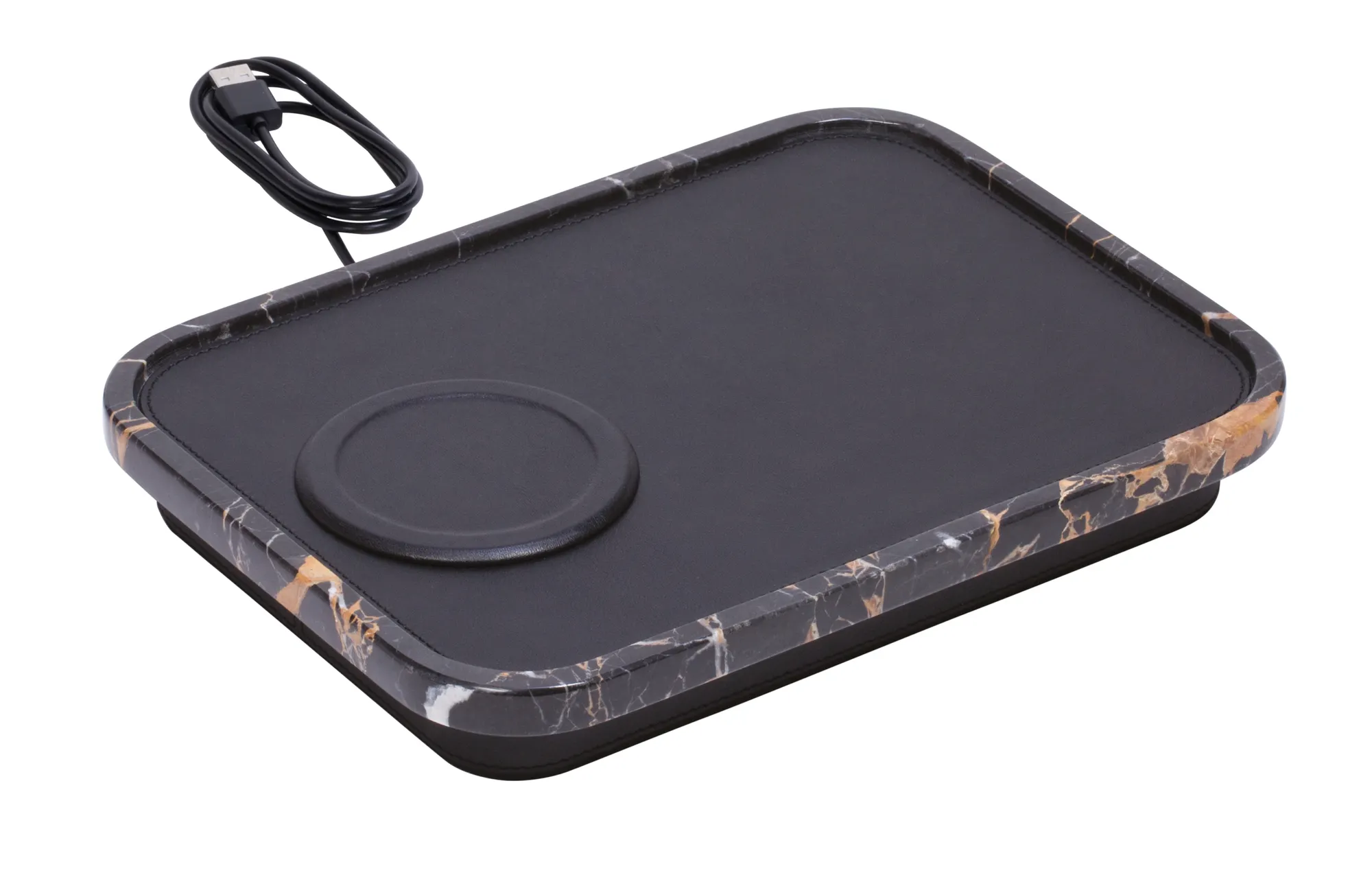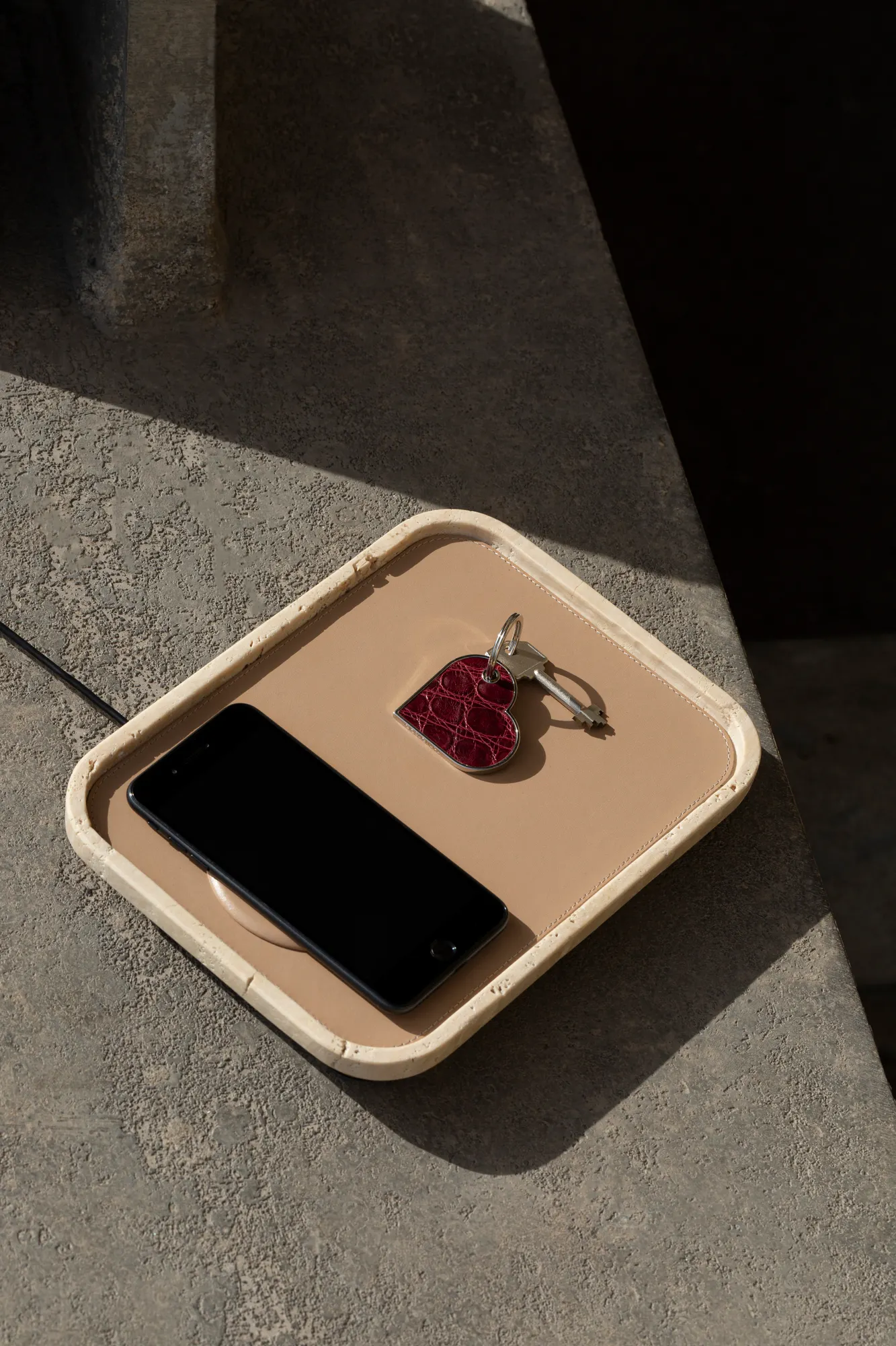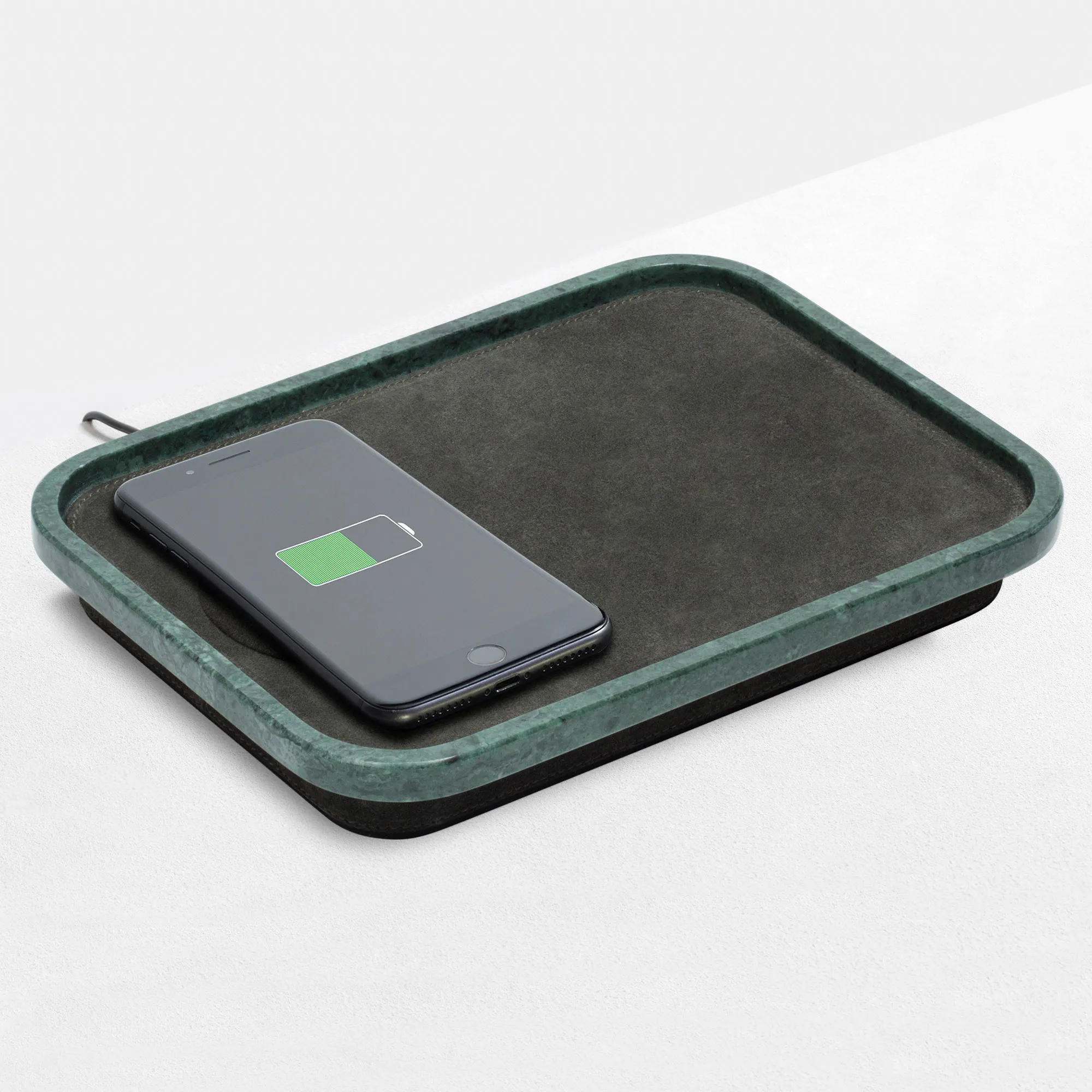 Leather-covered wooden structure with a marble frame available in five different finishes. A wireless Certified Qi standard charger, adopted by the largest mobile devices manufacturers, is integrated on the top. This product can be used as a valet tray as well. Supplied with USB type A cord (2.5 m) + mobile charger with 4 plugs: 2P Euro / BS / US / Australia-C.
