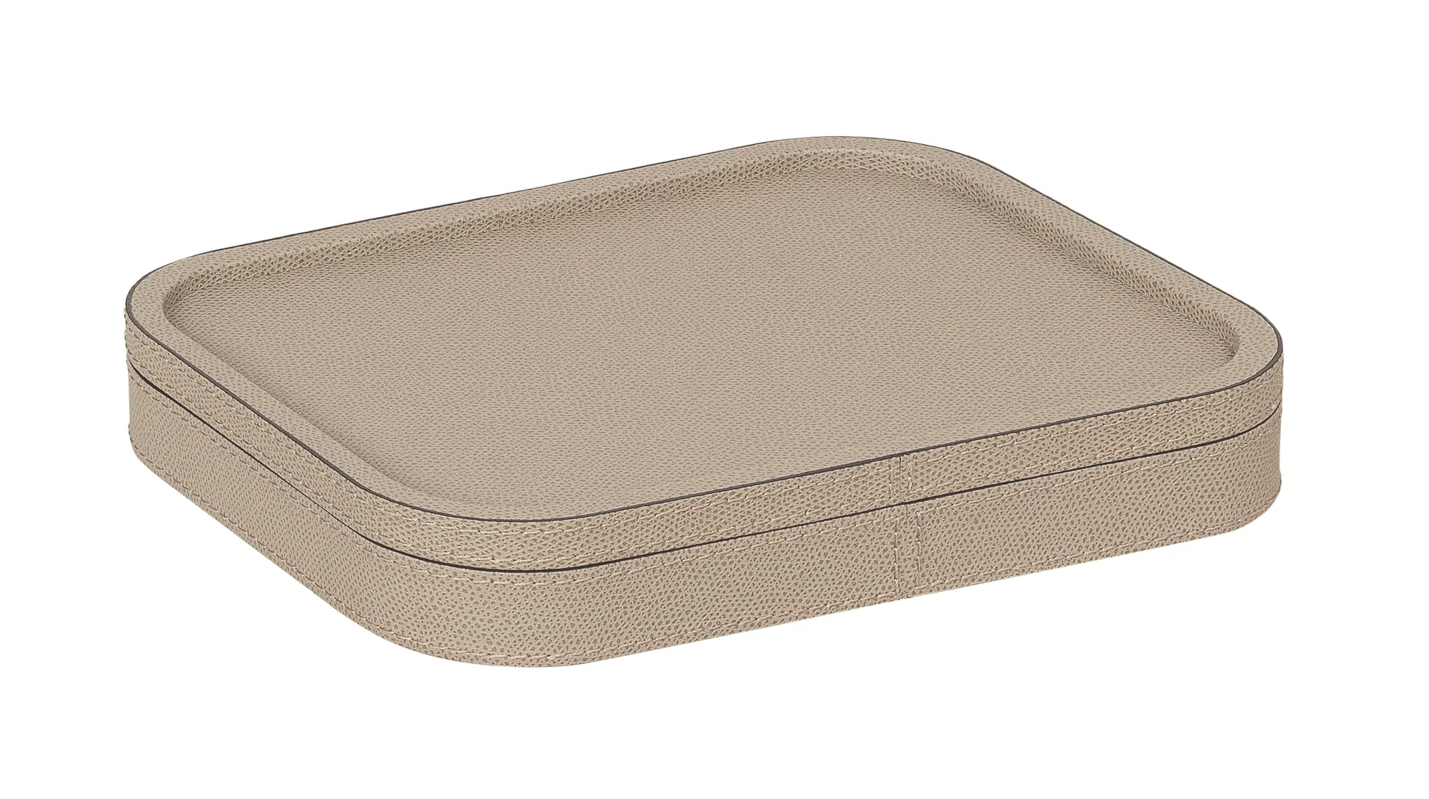 Leather covered wood structure. A double level base with different dimensions makes this piece stackable.