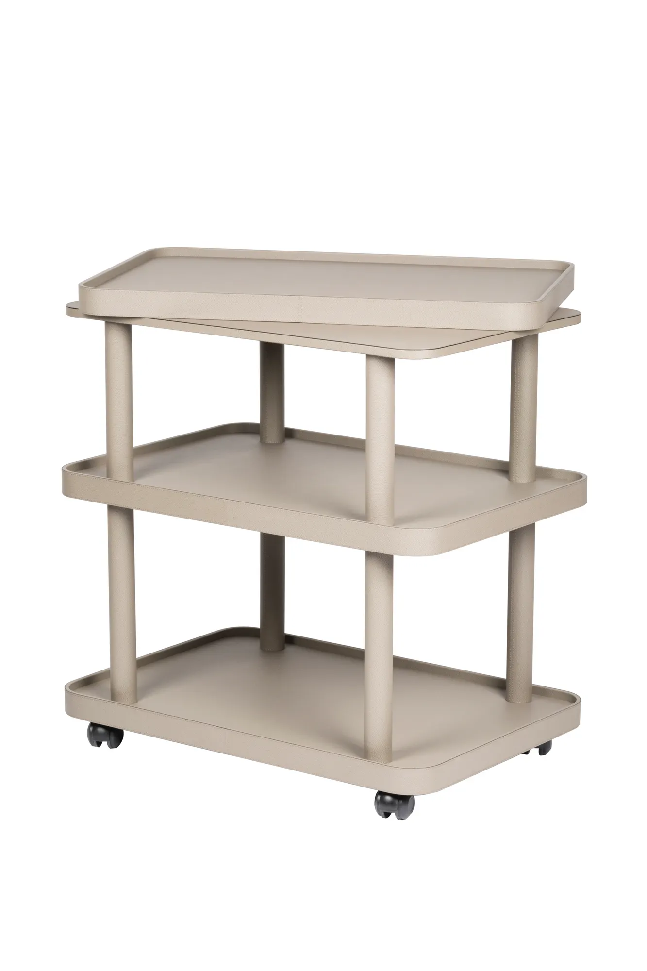 Leather covered four-wheel wood structure. Perfect to serve breakfast or as brunch table. Removable top tray.