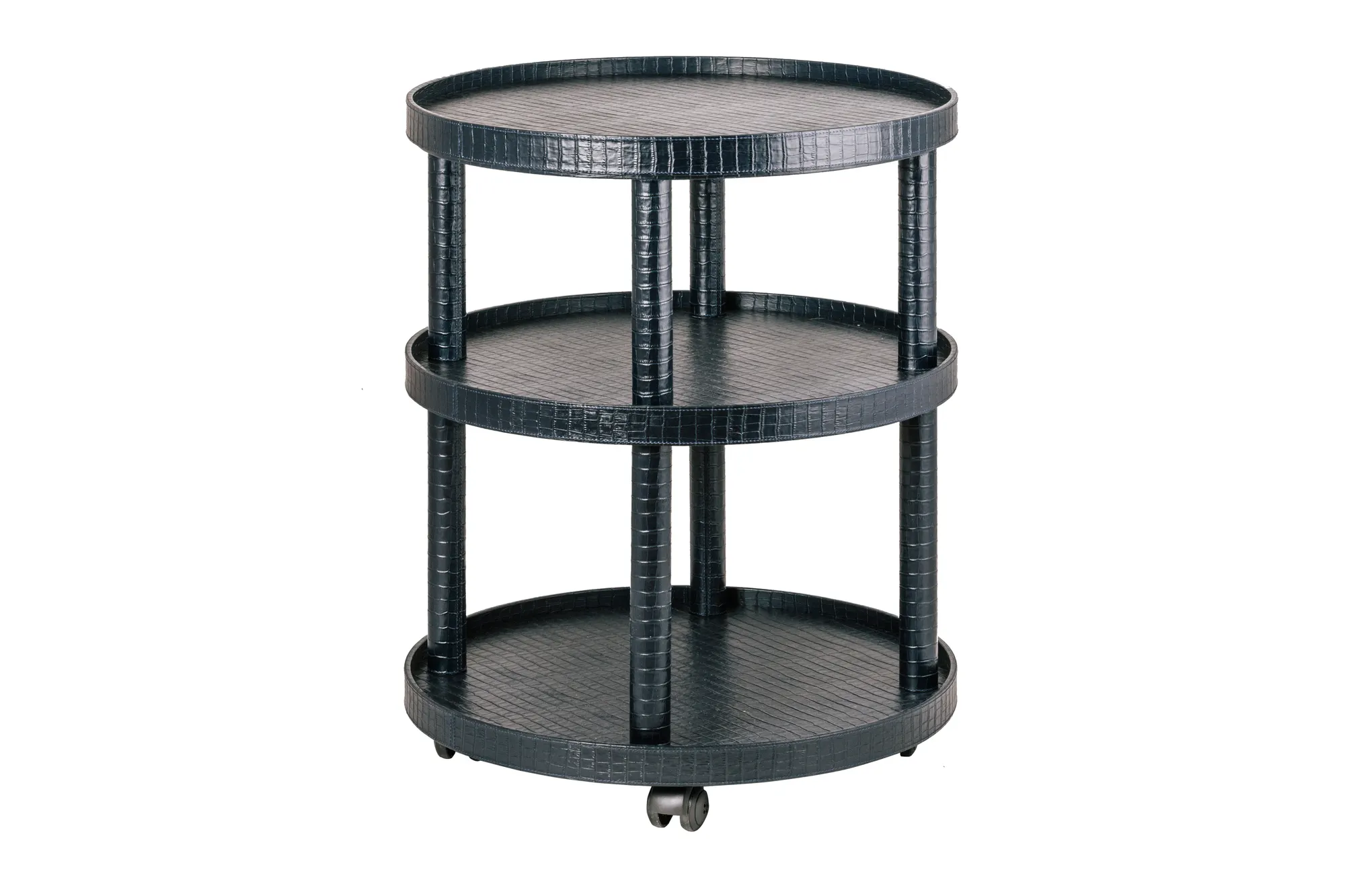 Leather covered four-wheel wood structure. Removable top tray.