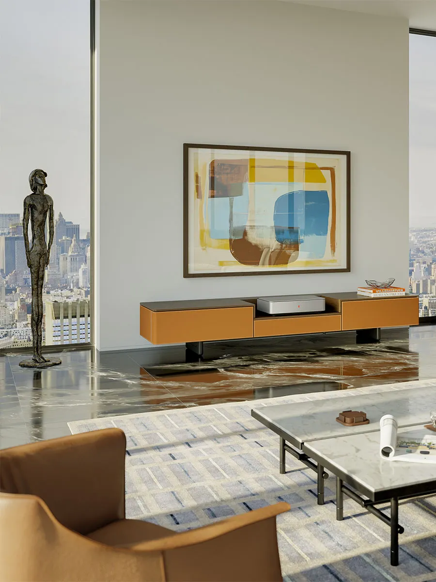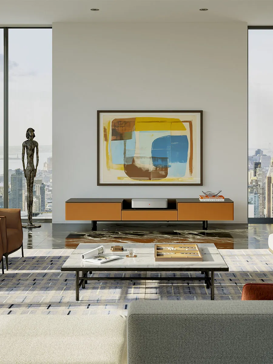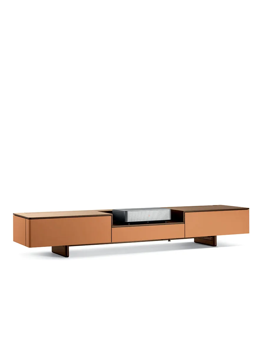 Designed by Roberto Lazzeroni in 2018, Fidelio Multimedia Cabinet was conceived as a perfect furnishing accessory to accommodate televisions and stereo systems. Today, the new home cinema version comes with a new functionality, collaborating with the prestigious company Leica, to create an ultra-versatile design cabinet and therefore offer an exclusive cinema experience directly at home.