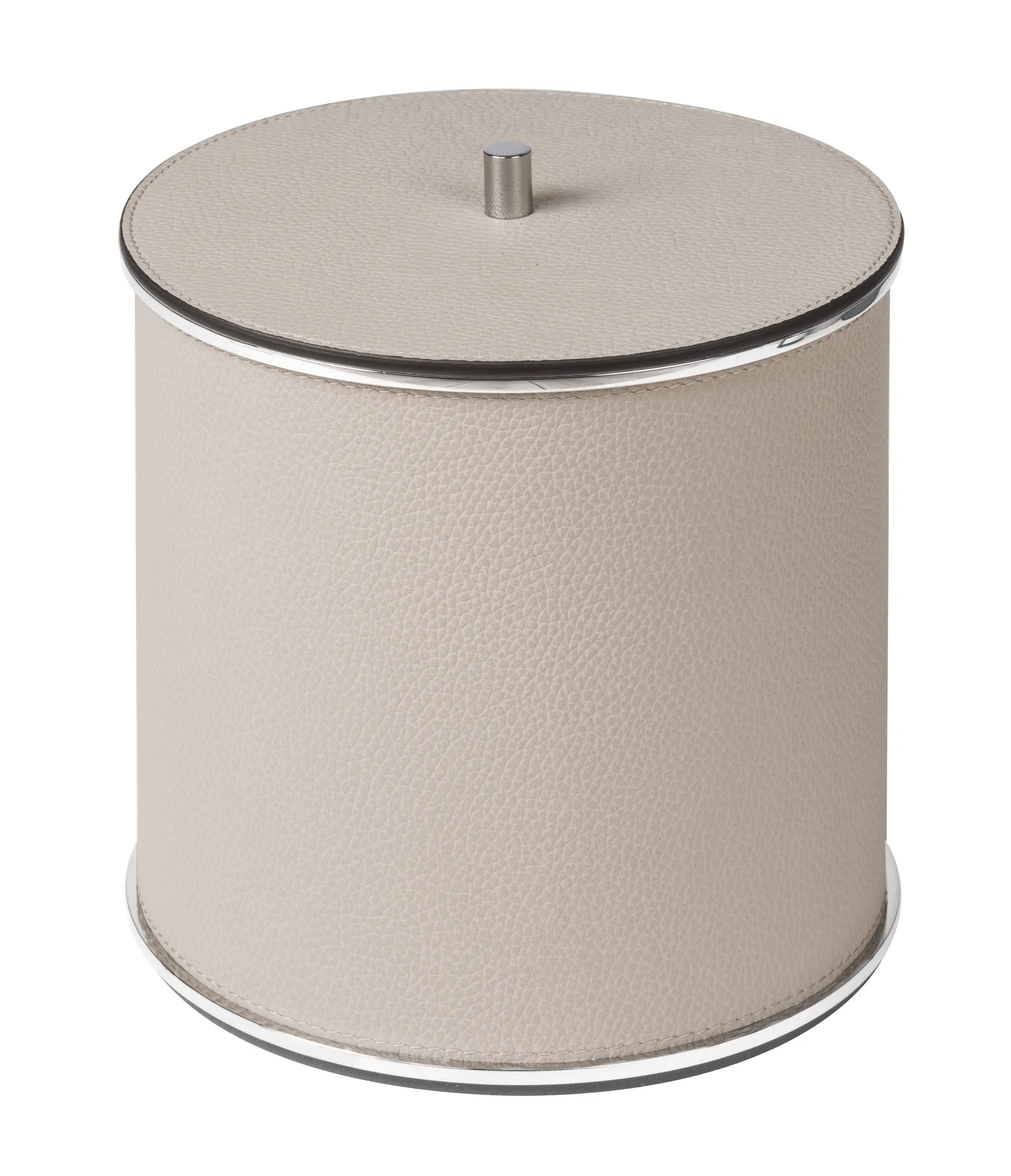 Partially leather-covered insulated double-chamber brass and stainless steel structure. Provided with lid.