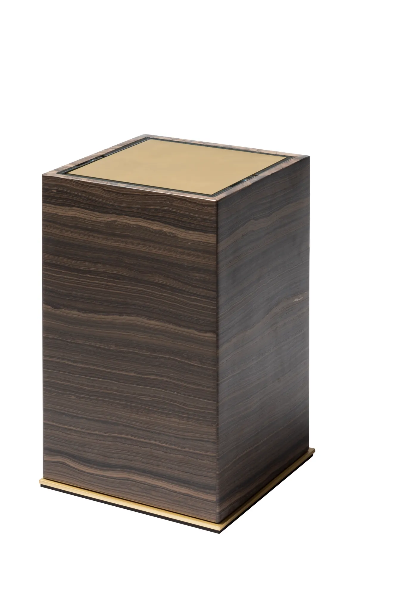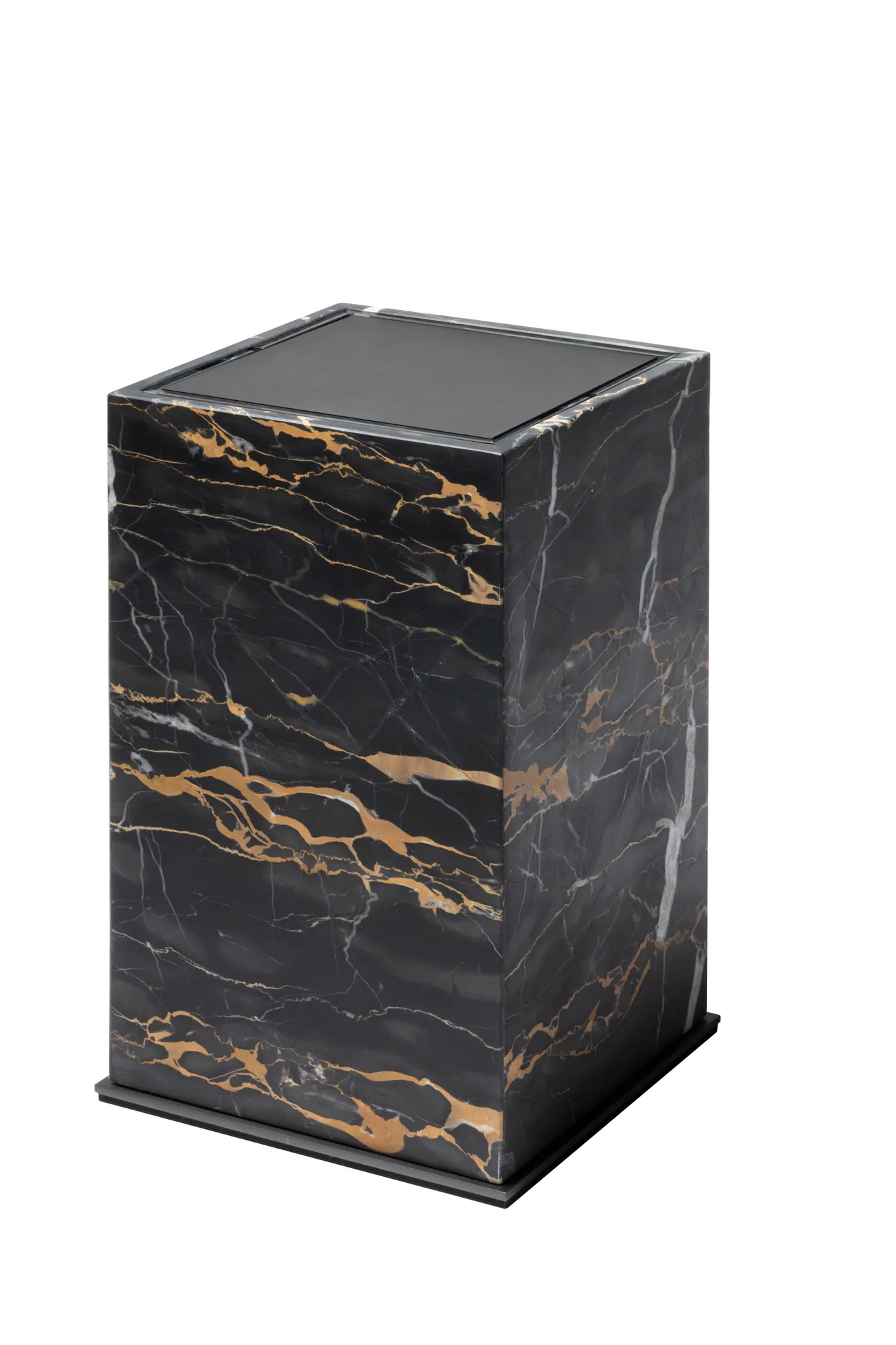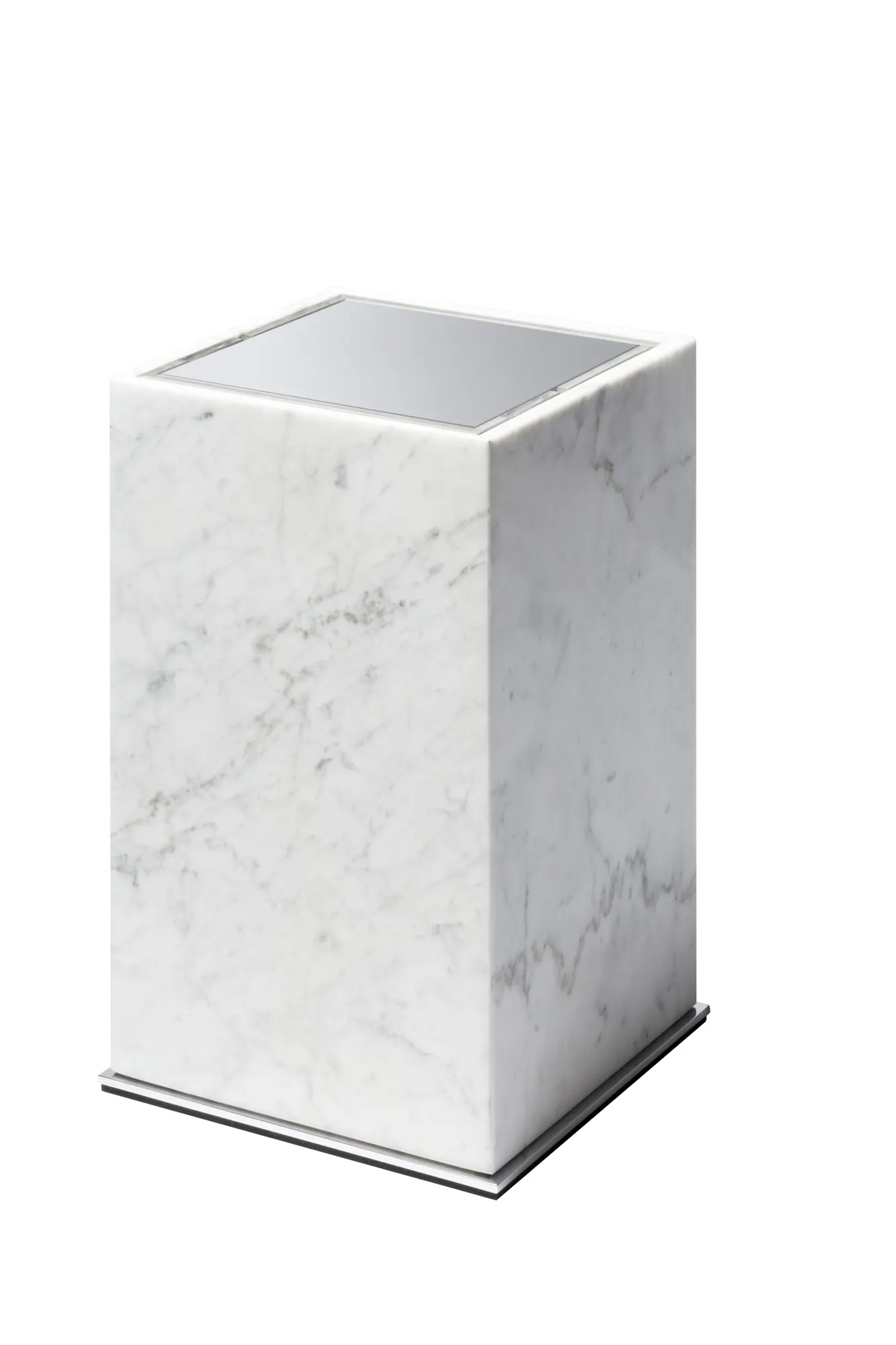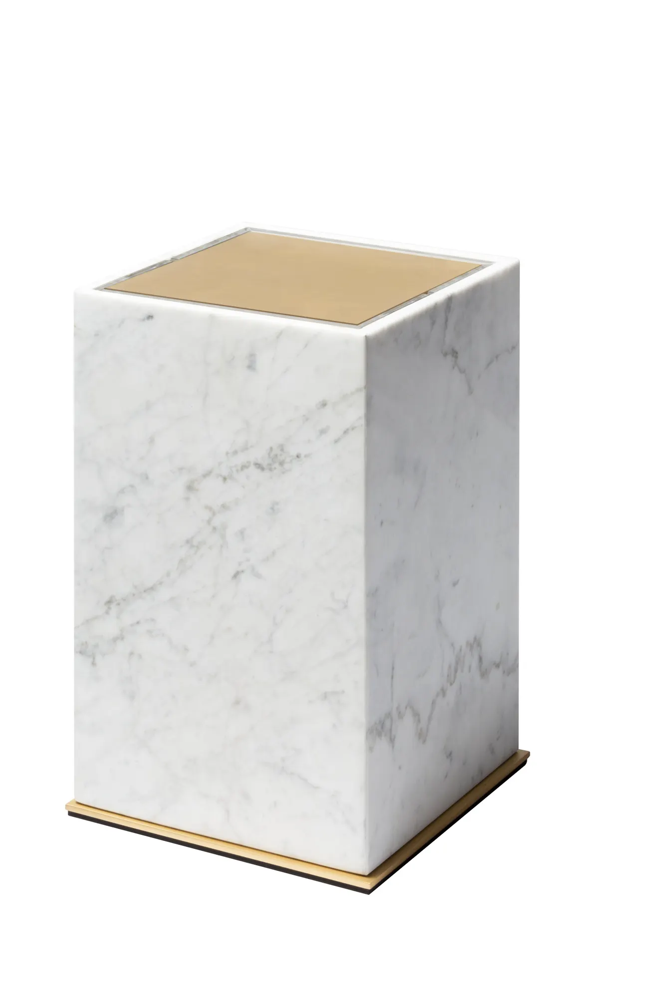 Marble structure with brass base frame. The removable metal tilting lid with leather insert and plexiglass inner structure ensure an easy cleaning. Non-slip waterproof rubber base underneath.