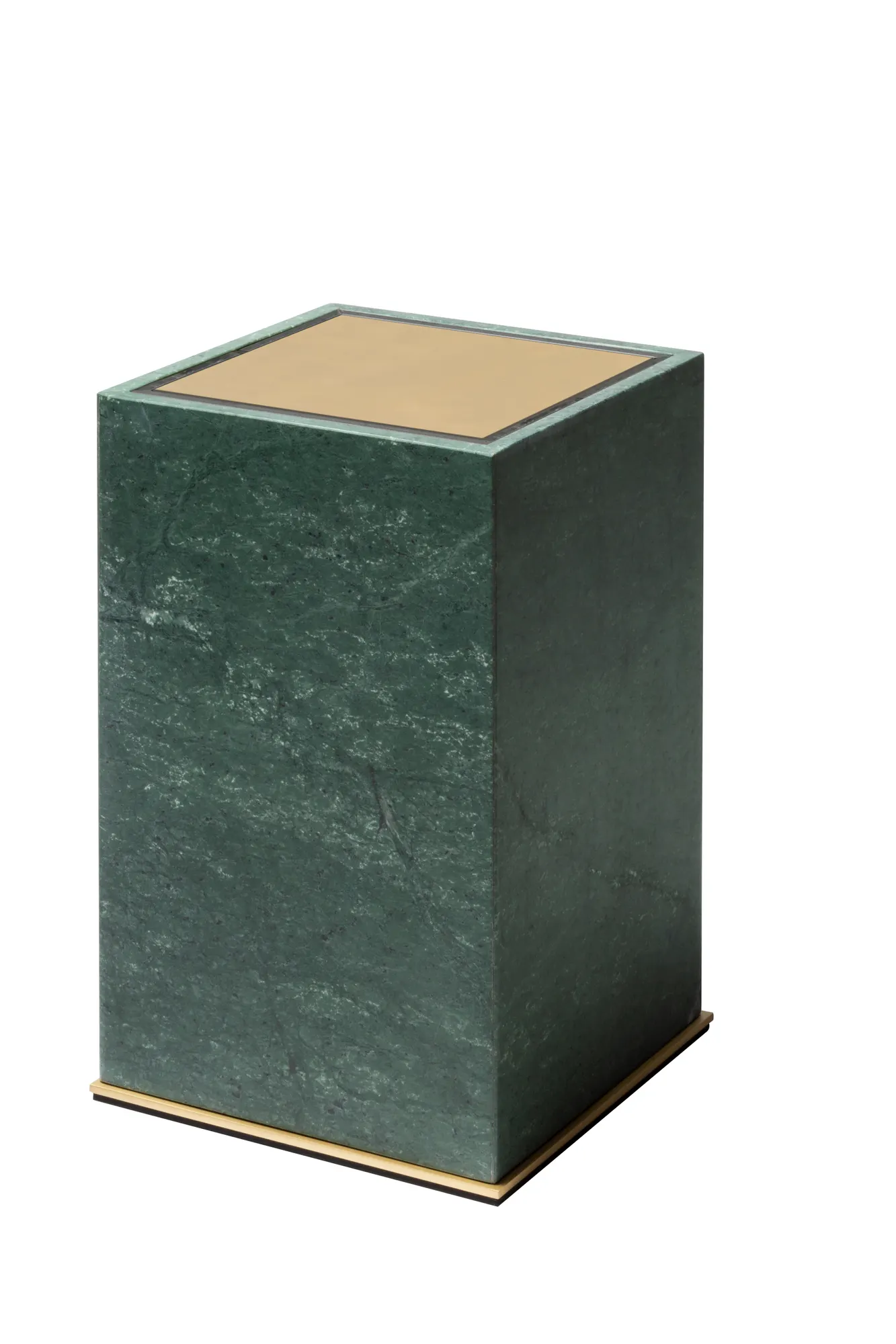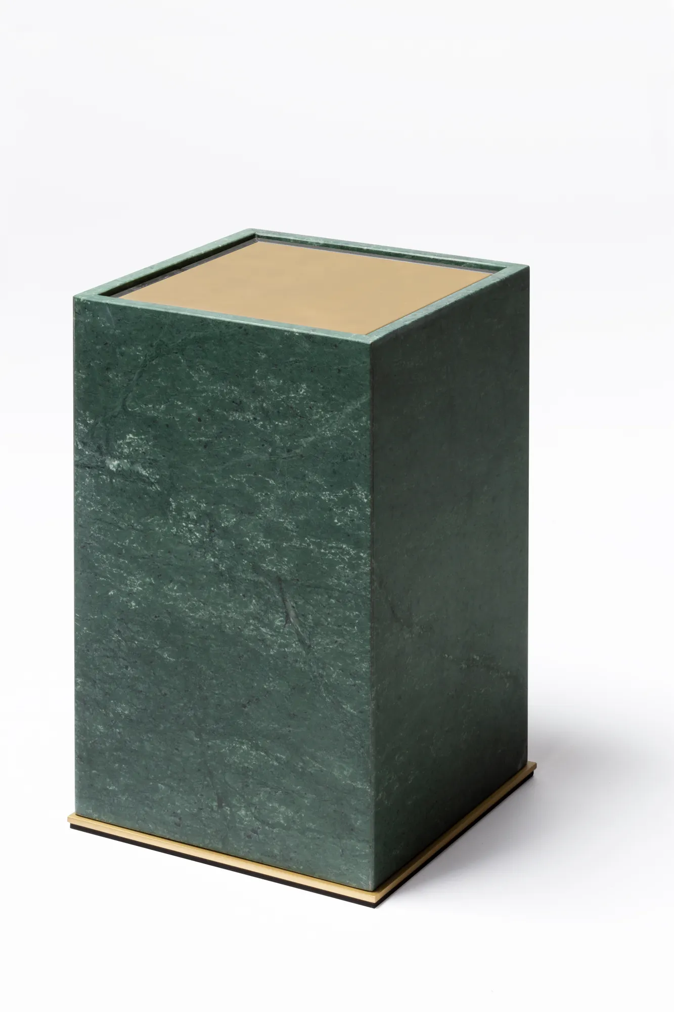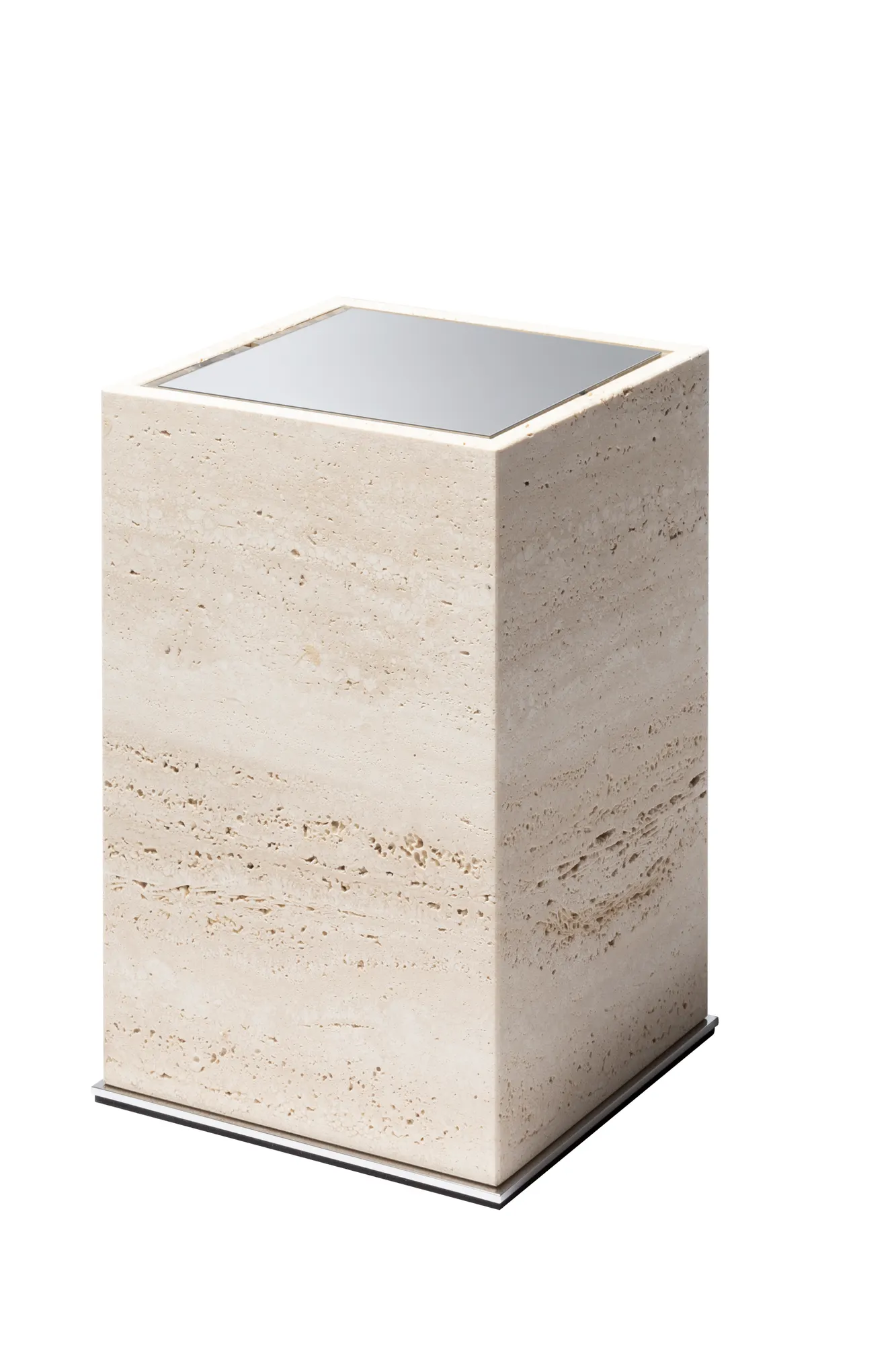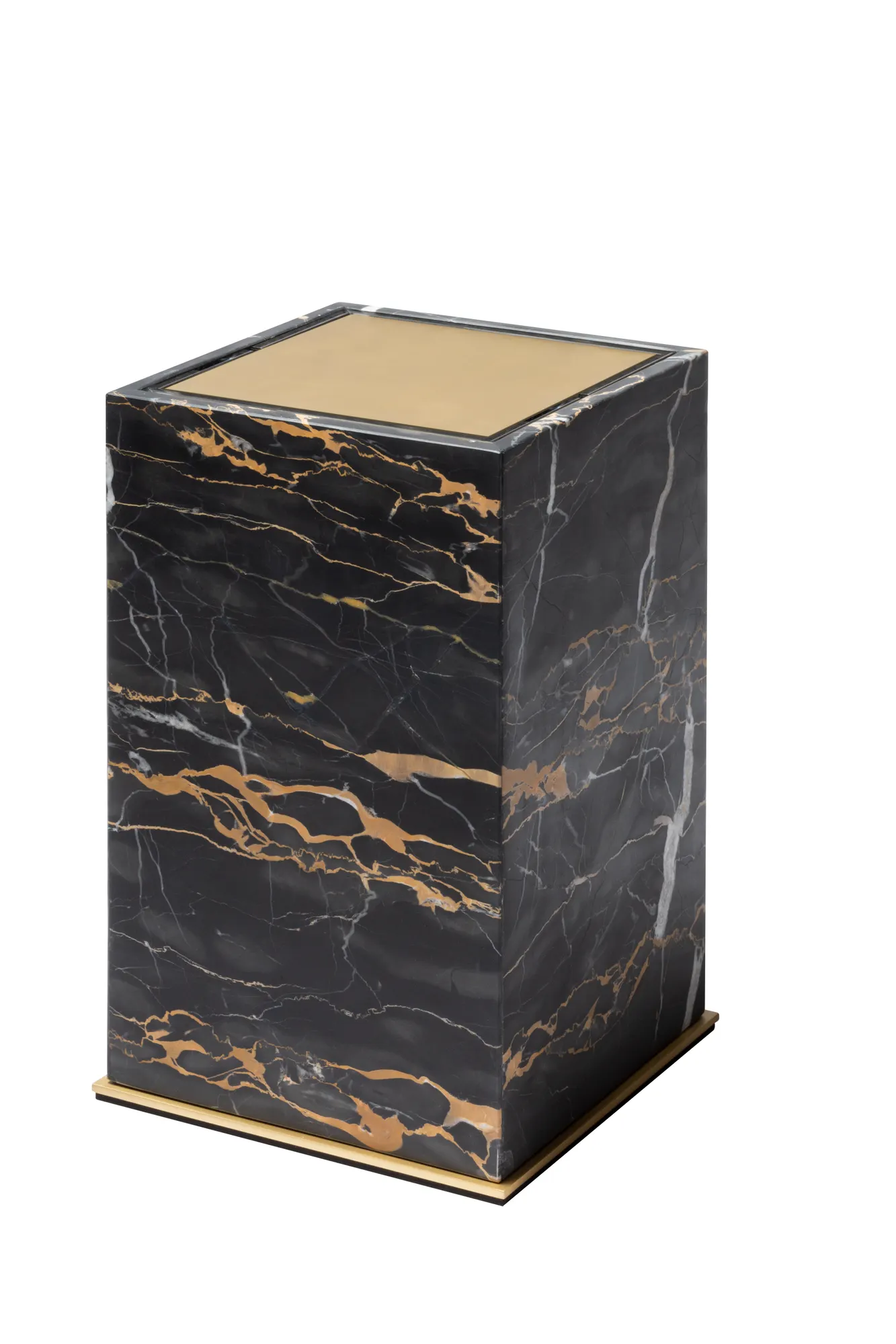 Marble structure with brass base frame. The removable metal tilting lid with leather insert and plexiglass inner structure ensure an easy cleaning. Non-slip waterproof rubber base underneath.