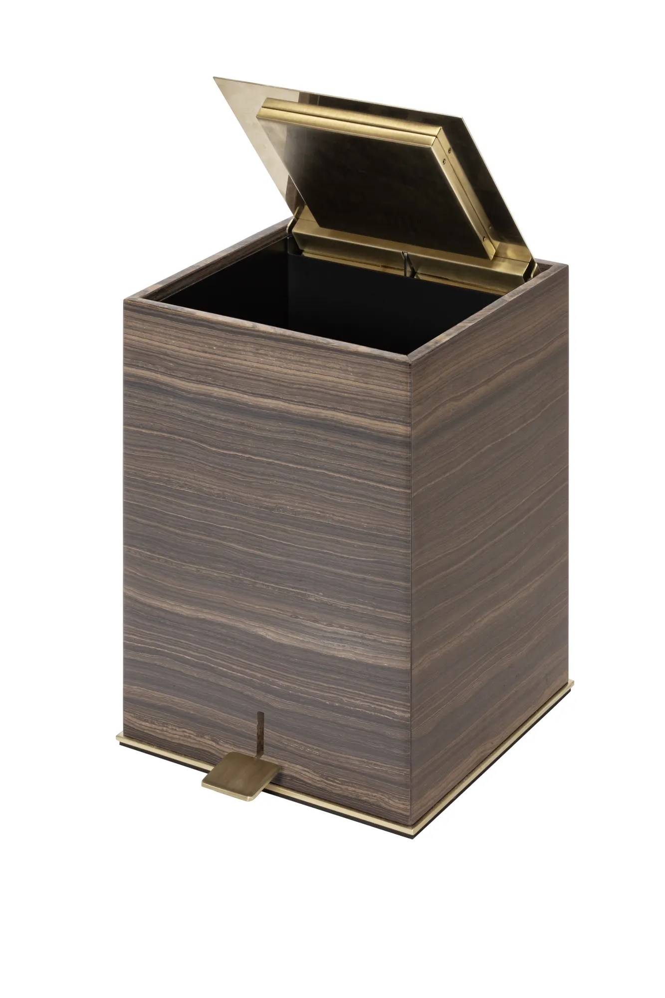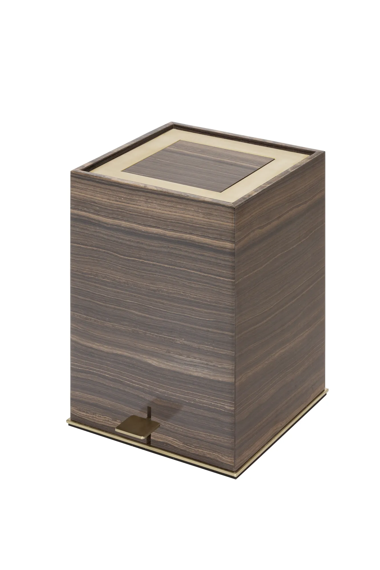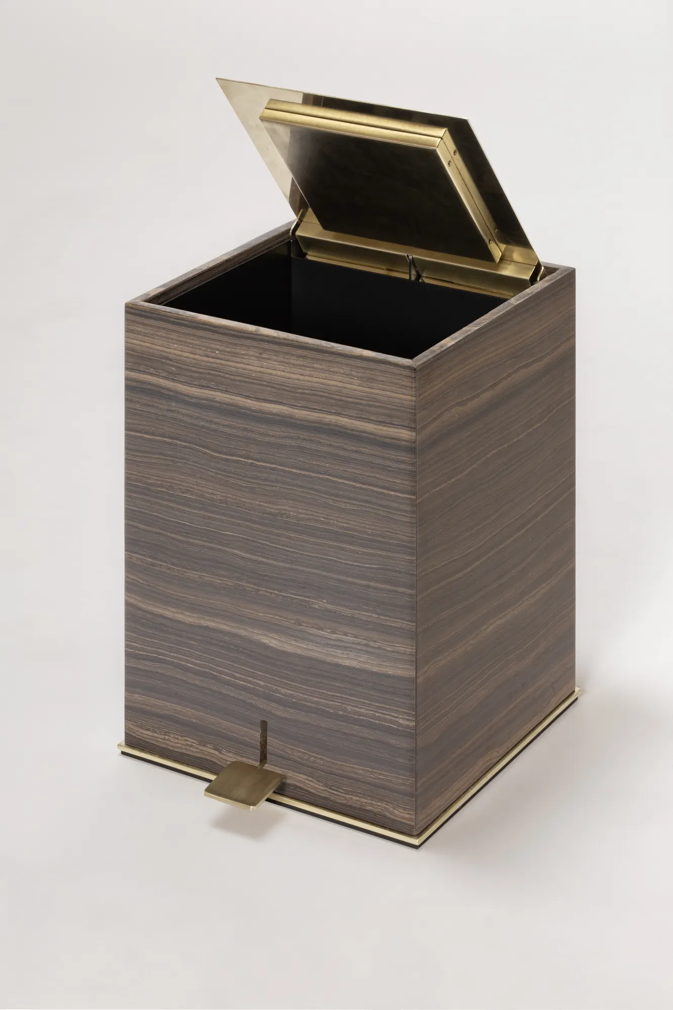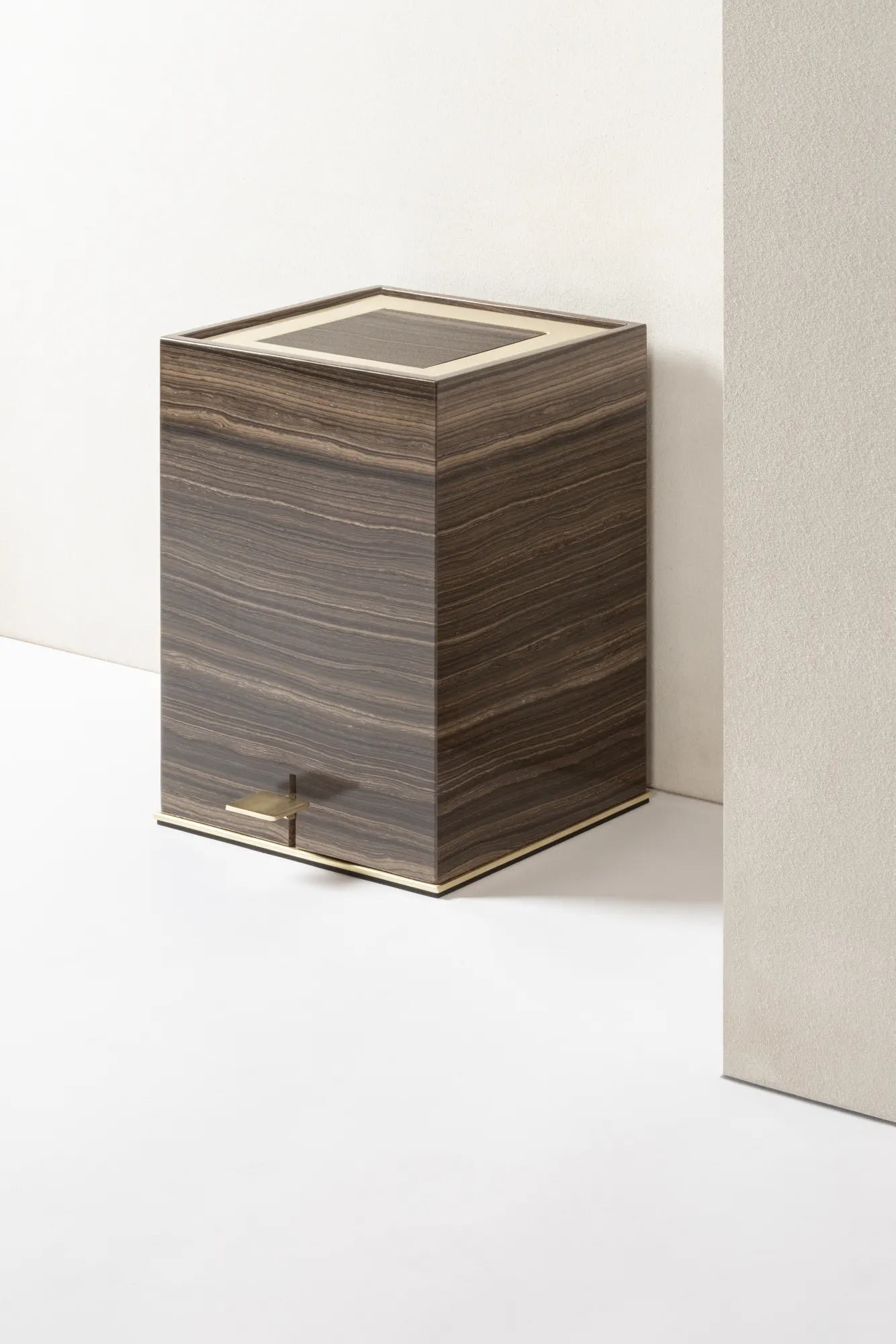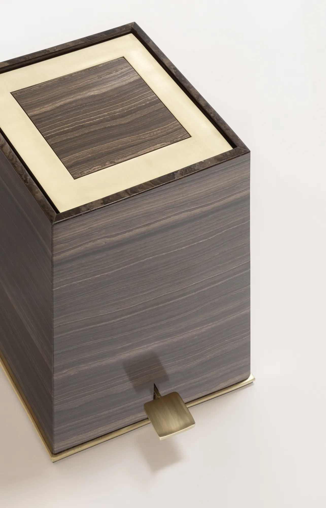 Marble structure with brass decorative lid frame, base frame and pedal, all available in three finishes of choice. Provided with a metal inner container. Non-slip waterproof rubber base underneath.