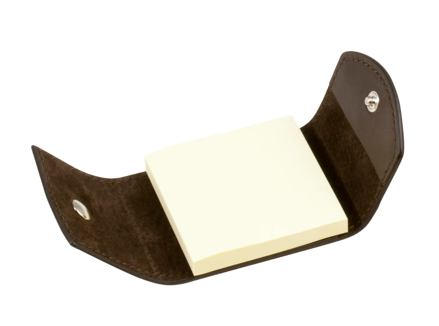 Leather cover. Suede and leather lining. Leather covered heavy weighted wood structure. Large model comes with pen holder and pen. Provided with a pocket to attach notepads (cm 10 x 15) and pen holder.