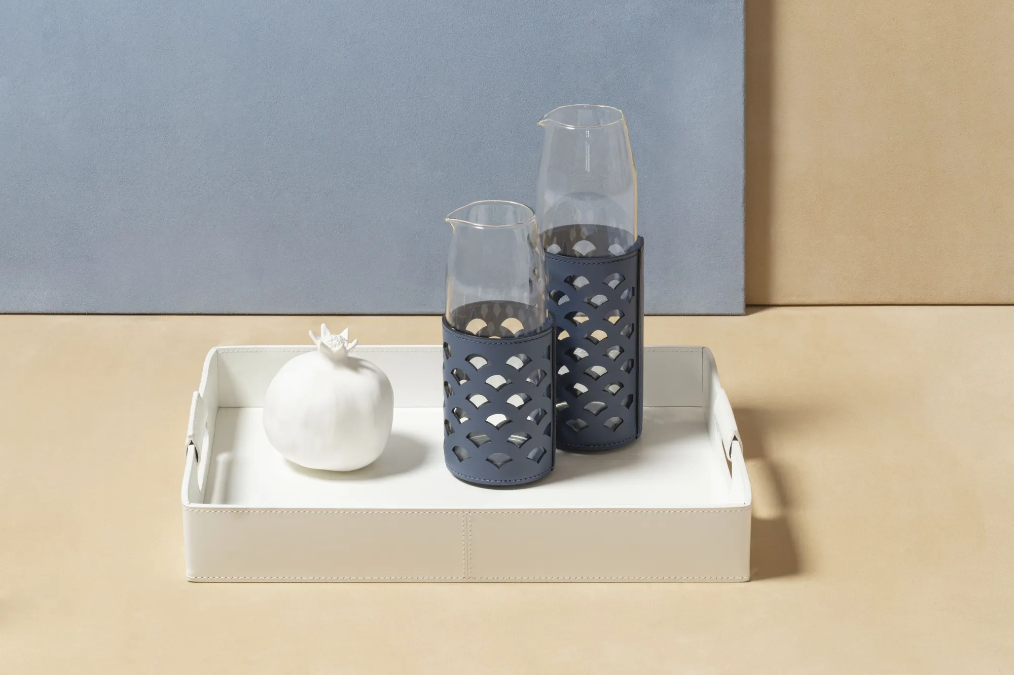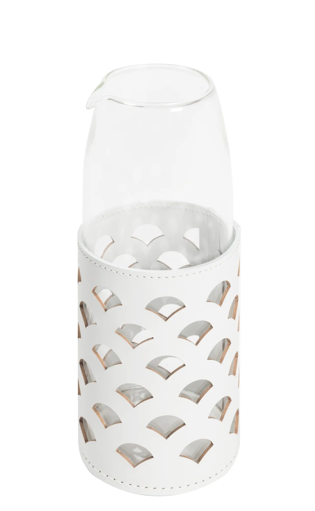 Transparent borosilicate glass partially dressed in finest regenerated leather with water-resistant and UV-resistant finish. Non-slip waterproof rubber base underneath. Removable cover for easy cleaning.