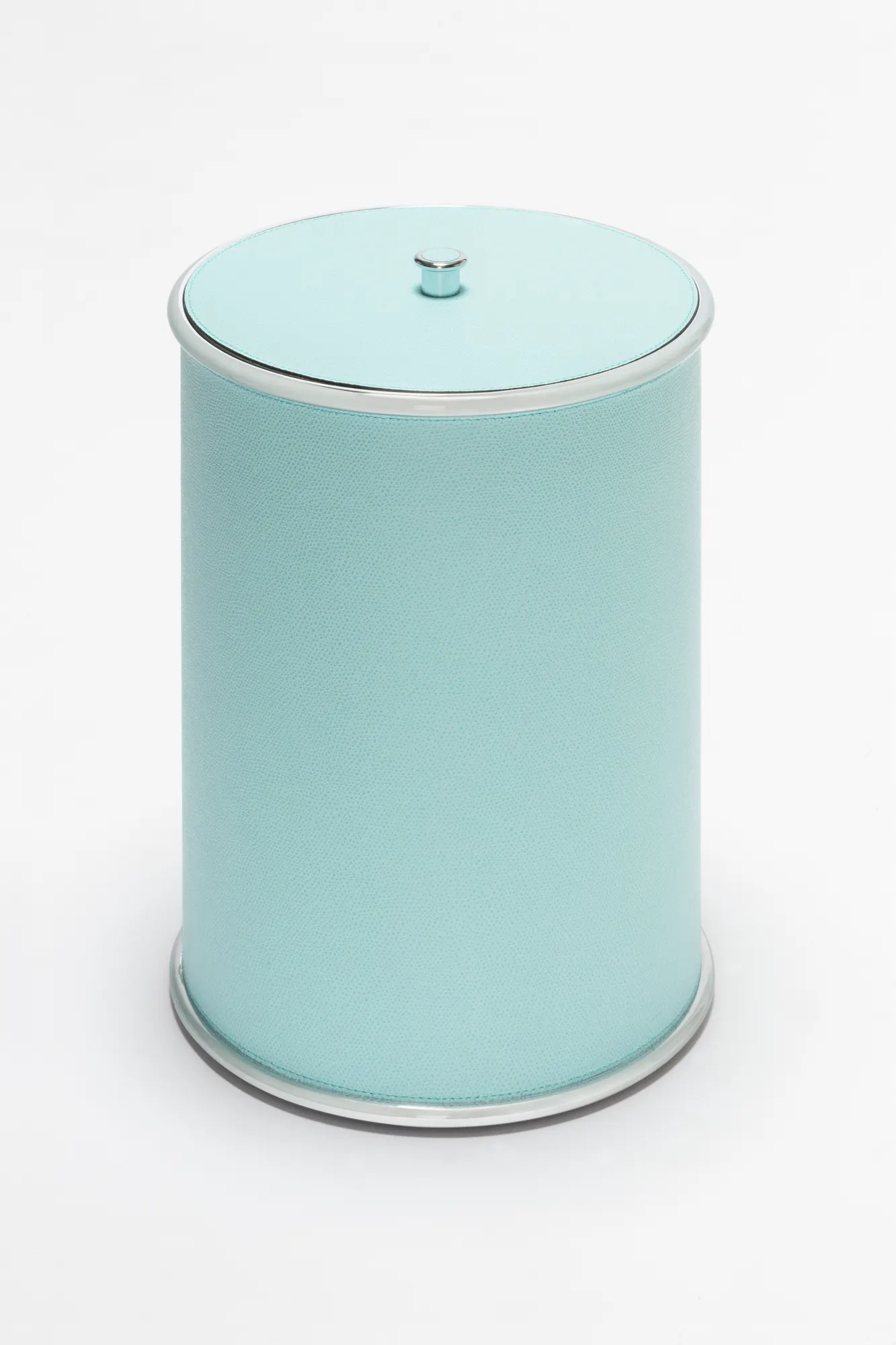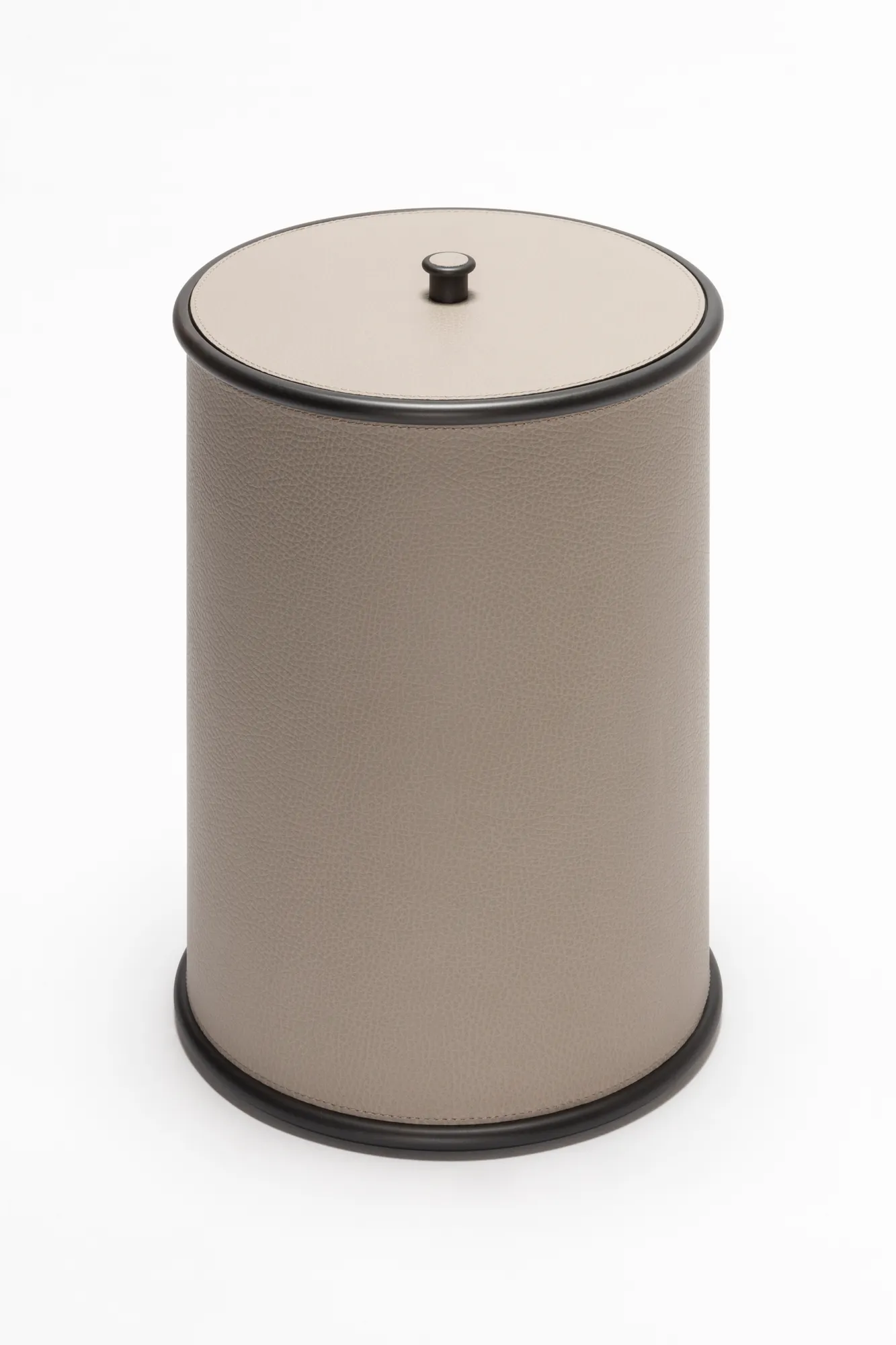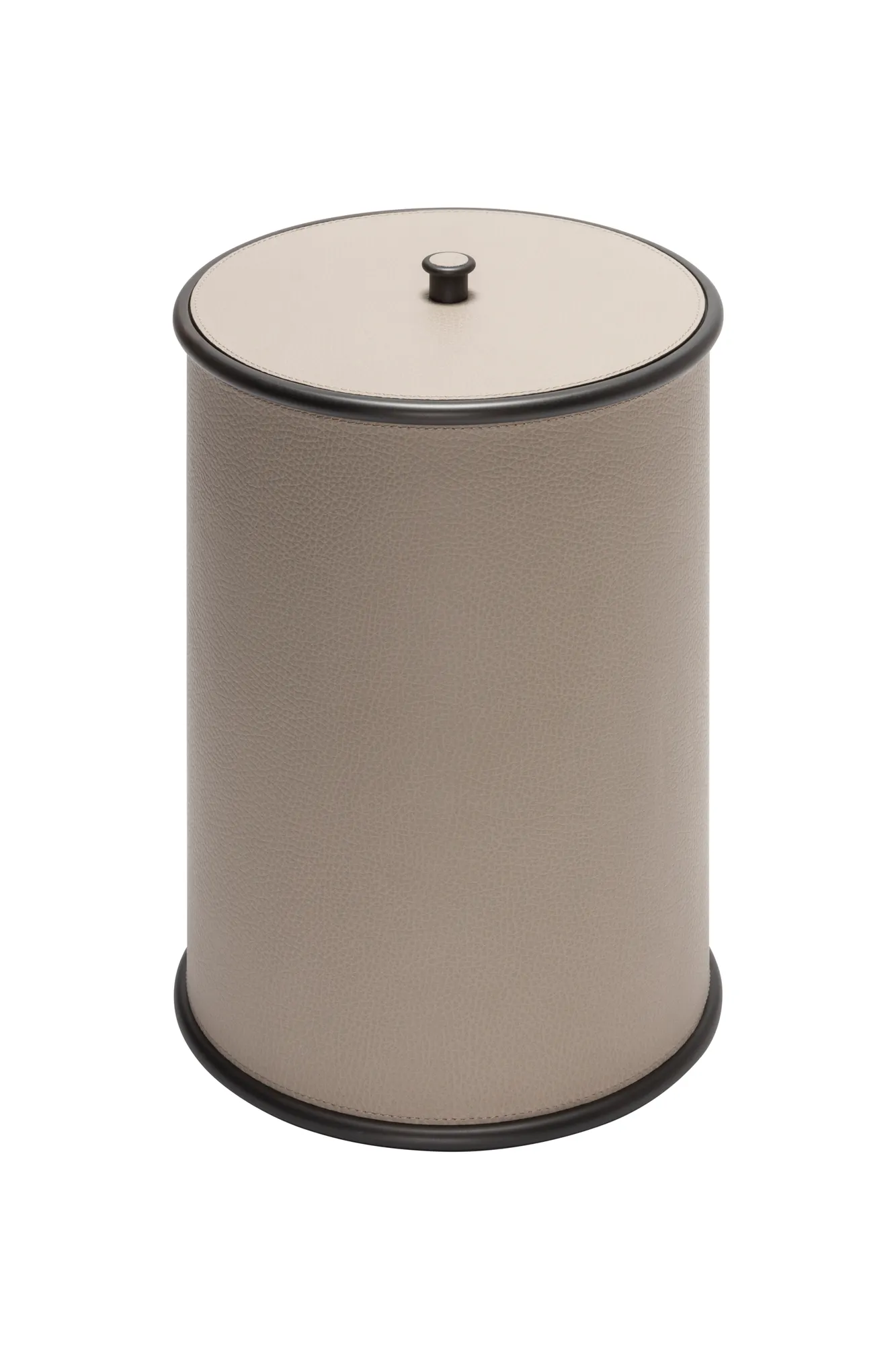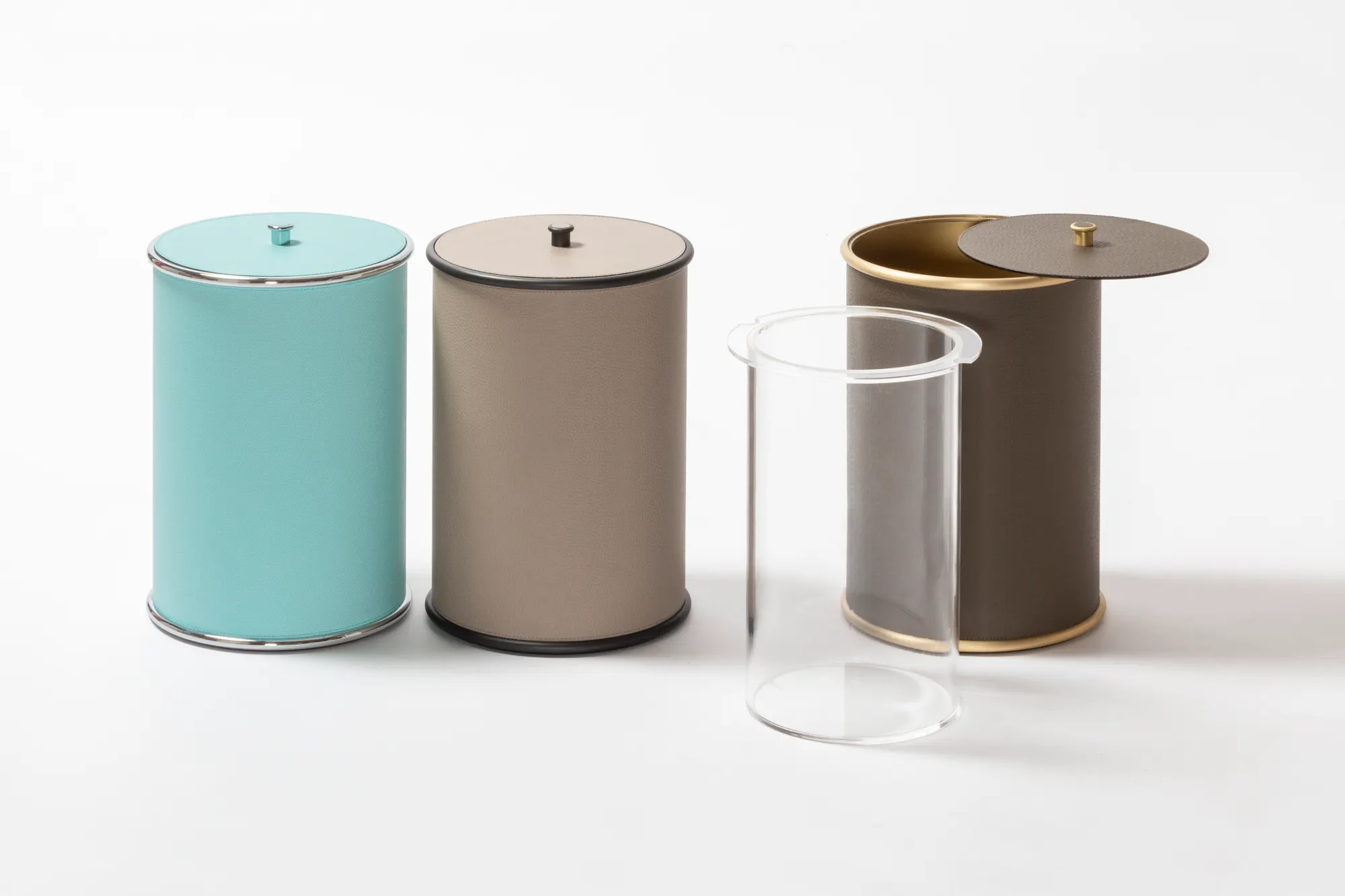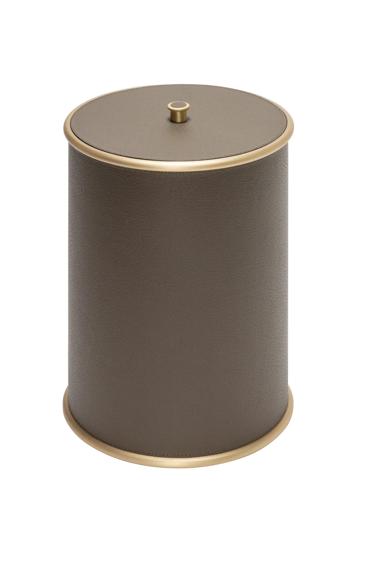 Ravello is a minimal bathroom collection ideal for any setting. The rigid cylindrical main volumes are rendered softer by the smooth decorative rounded edges, while the finest Italian leather, with its velvety texture, is combined with one among three finishes of choice (polished chrome, brushed bronze and brushed brass) for a naturally elegant resulting design. Partially leather-covered metal structure provided with removable inner plexiglass container. Non-slip waterproof rubber base underneath.