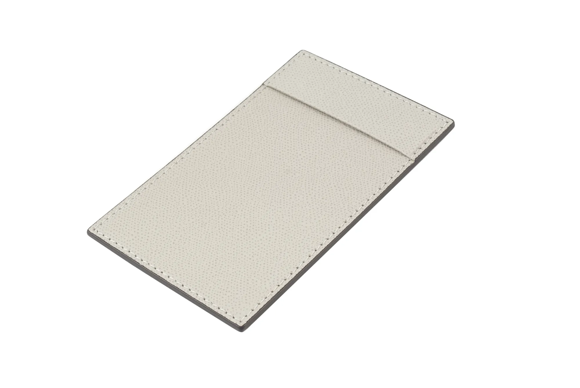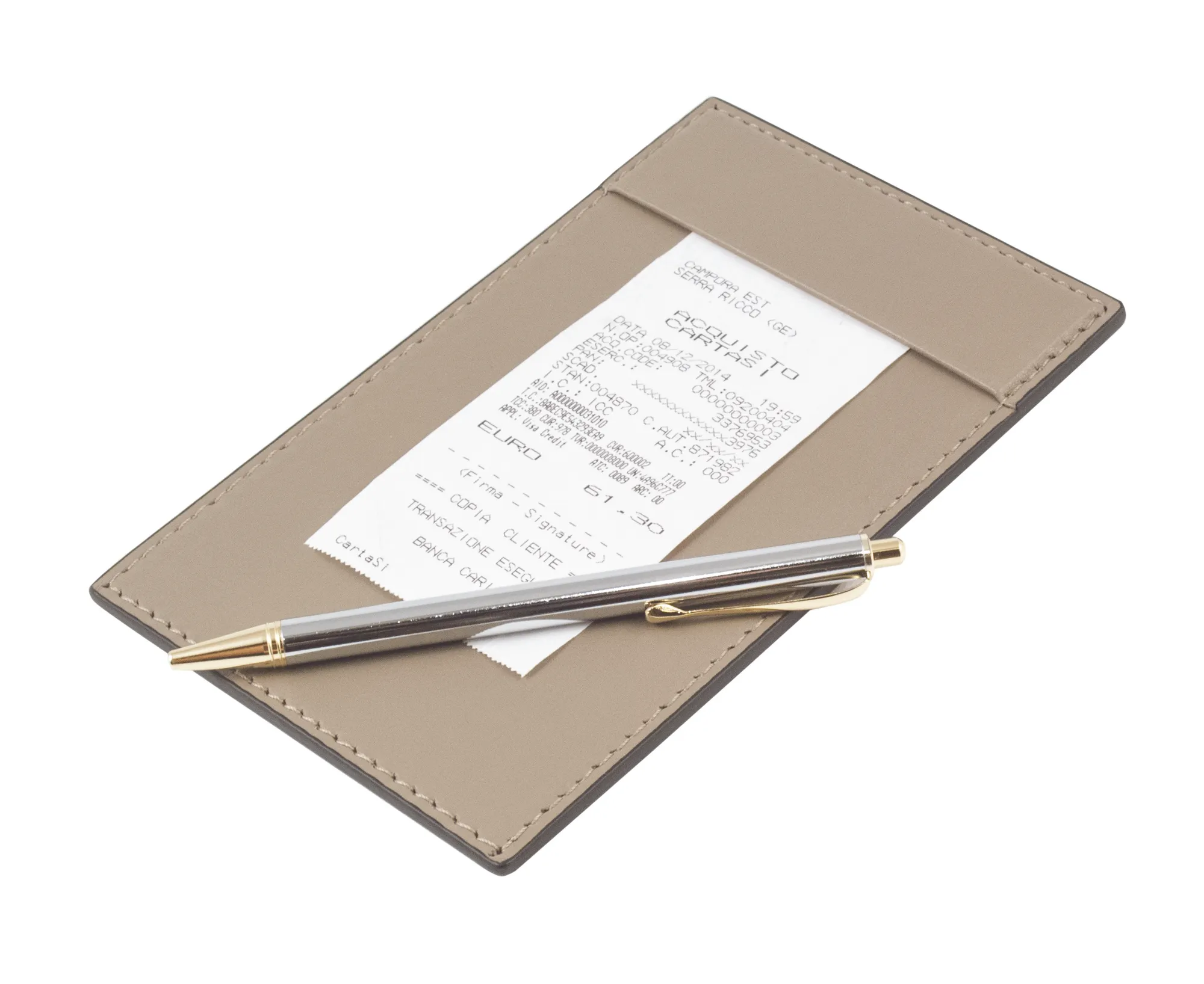 Leather covered rigid structure with pocket for receipts and credit cards.