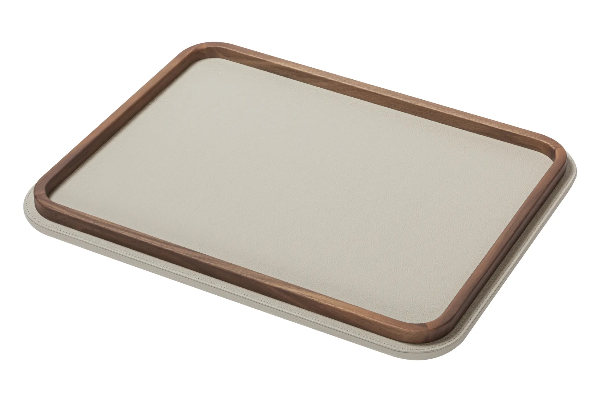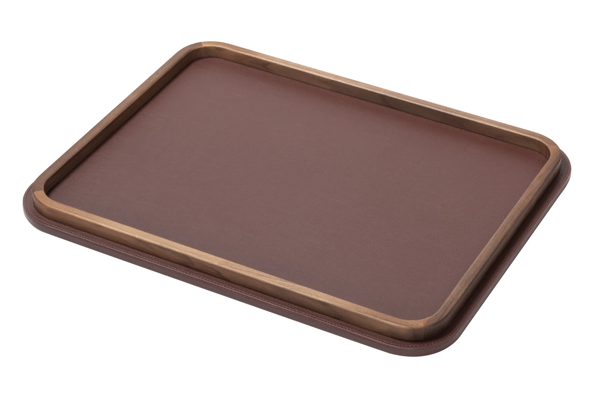 Leather-covered trays with rounded corners. It features a walnut wood frame. Entirely made in Pelle Frau®.