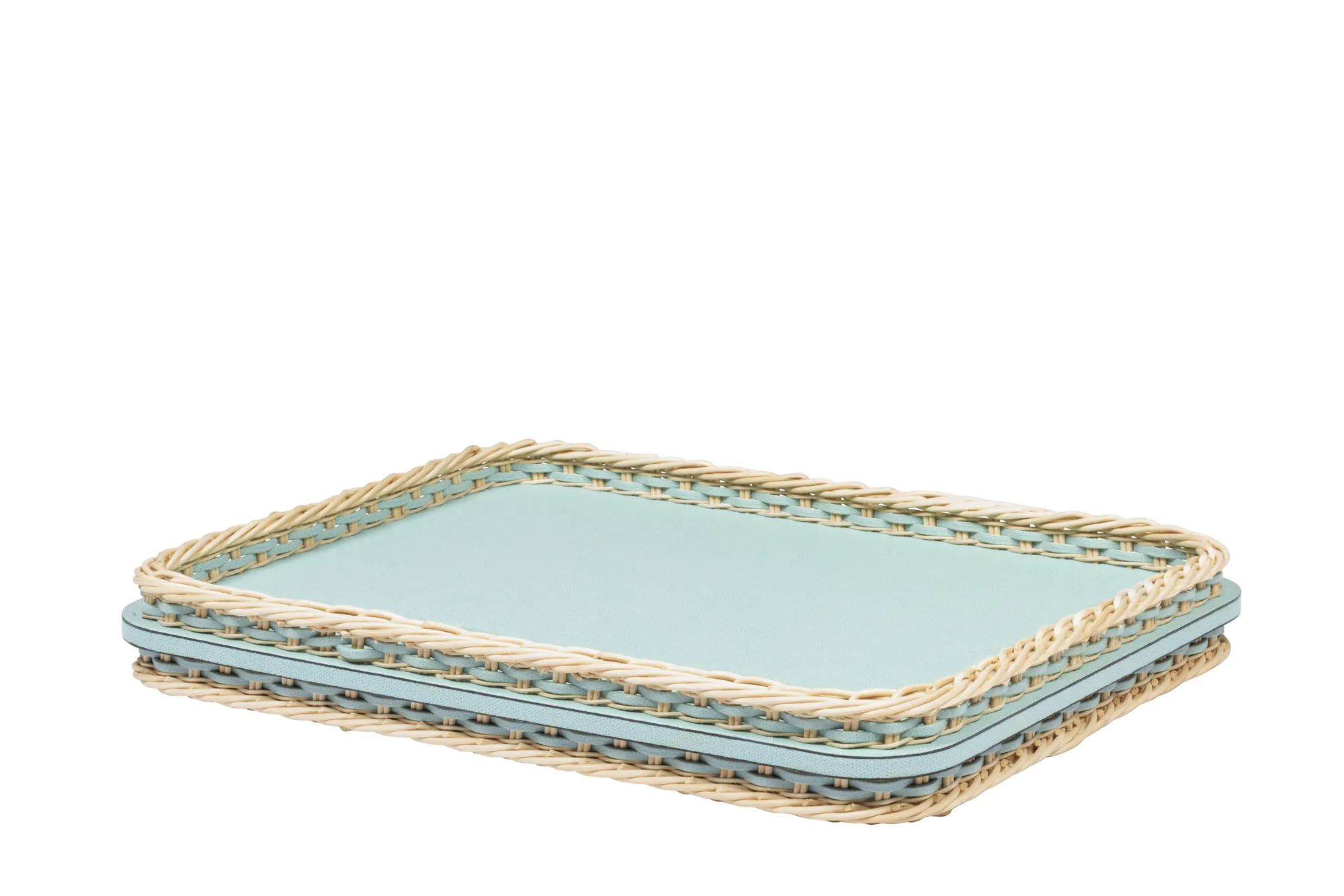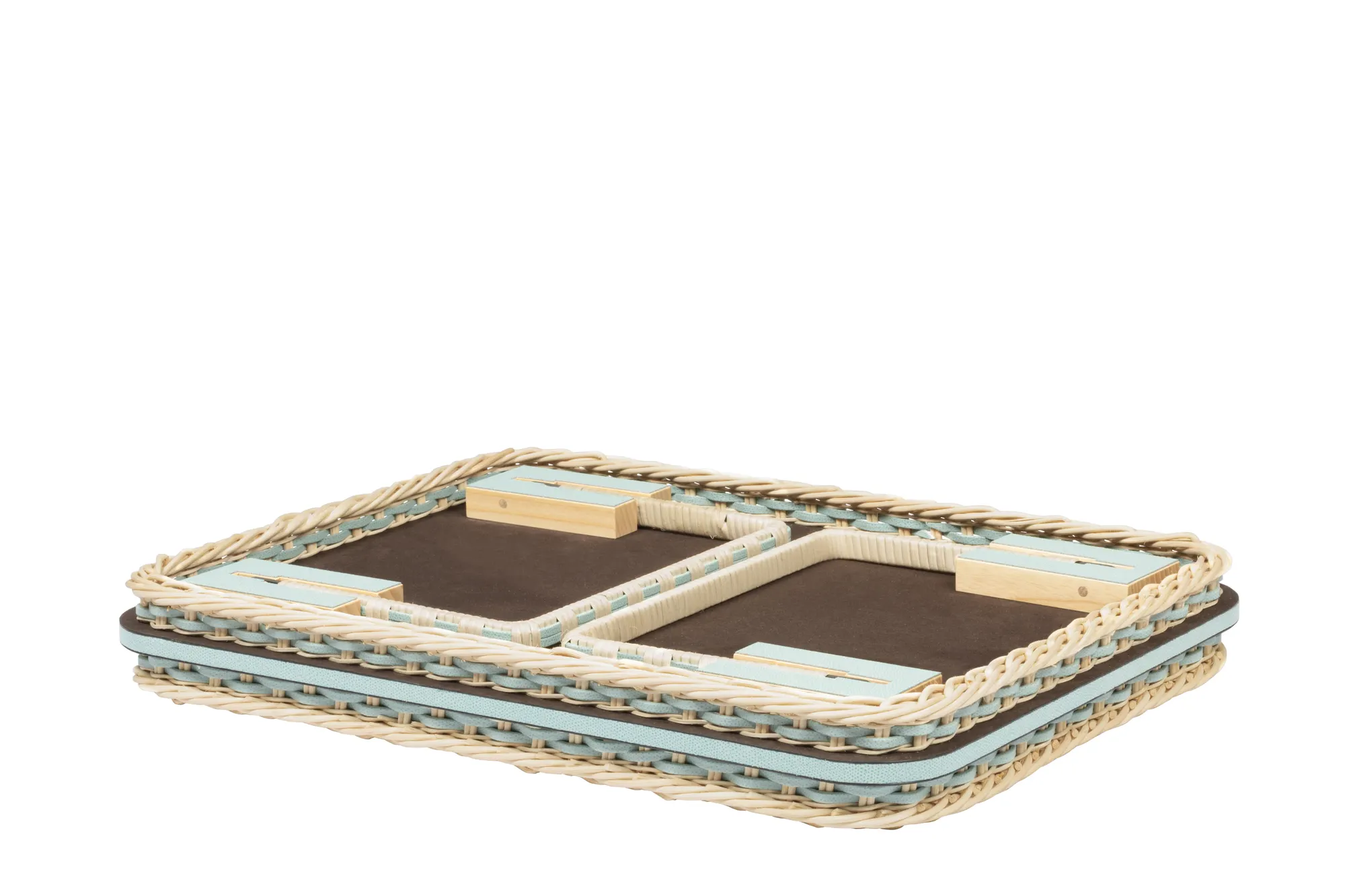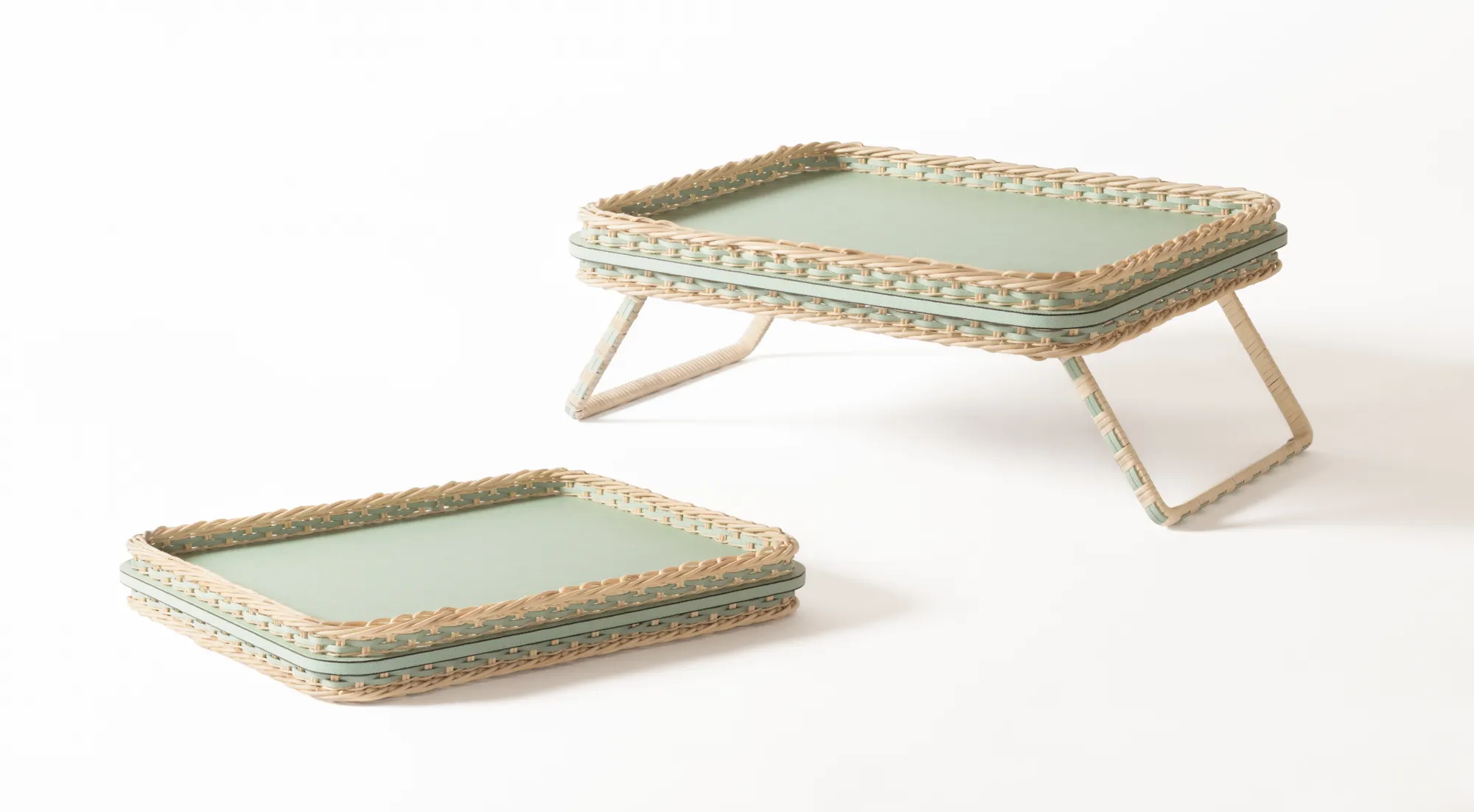 Leather-covered wood structure featuring a woven leather and rattan frame with leather top and folding woven leather and rattan legs. Ideal for breakfast in bed.