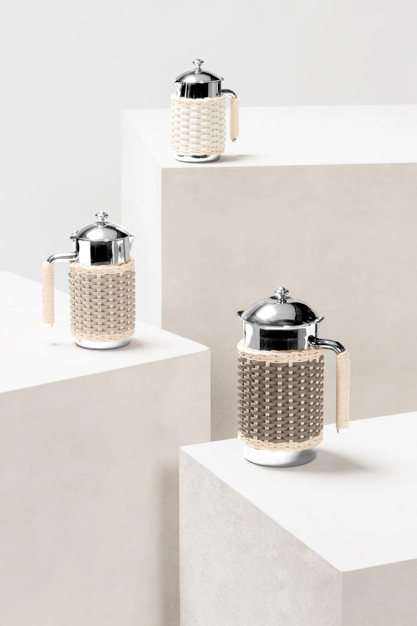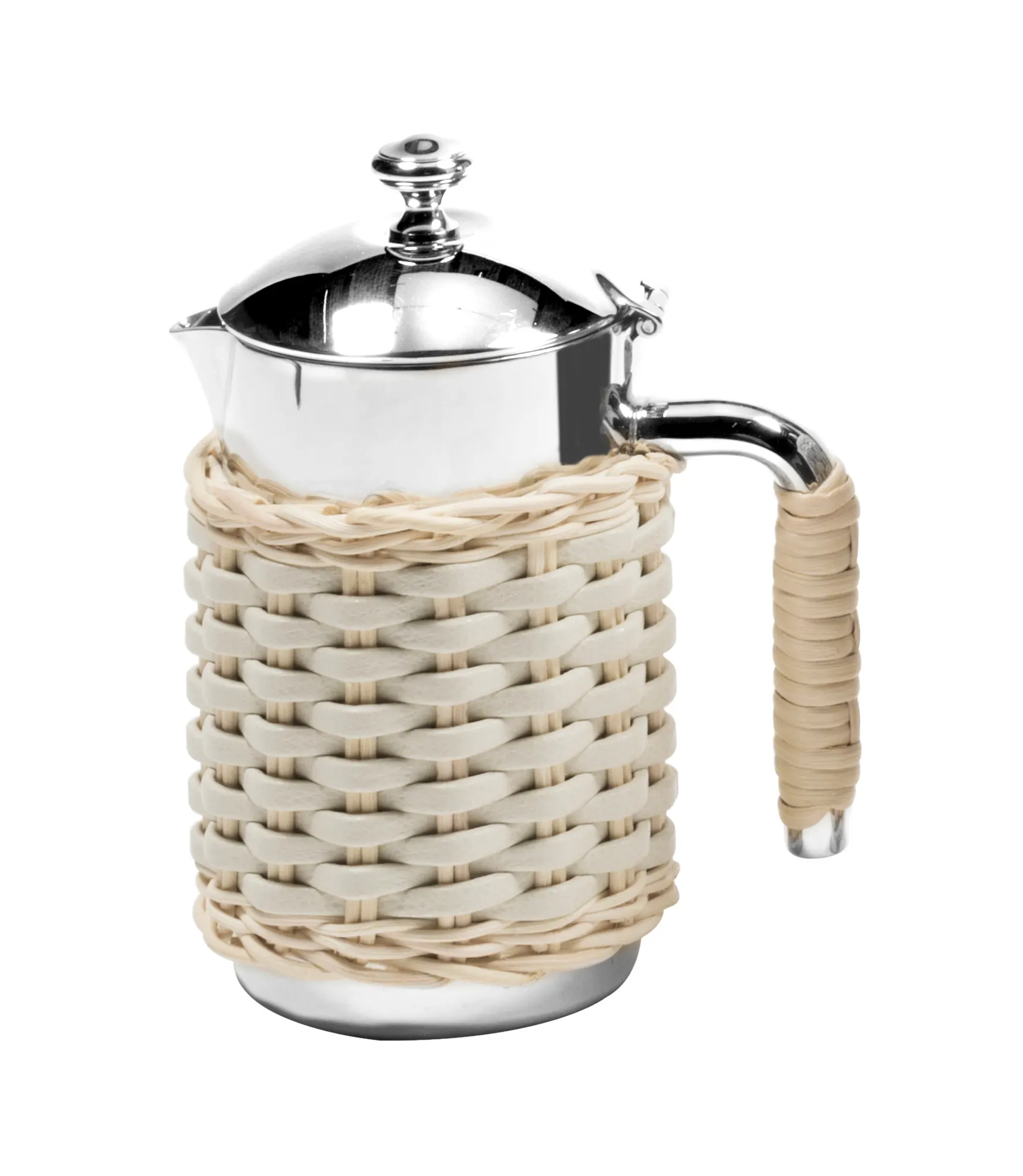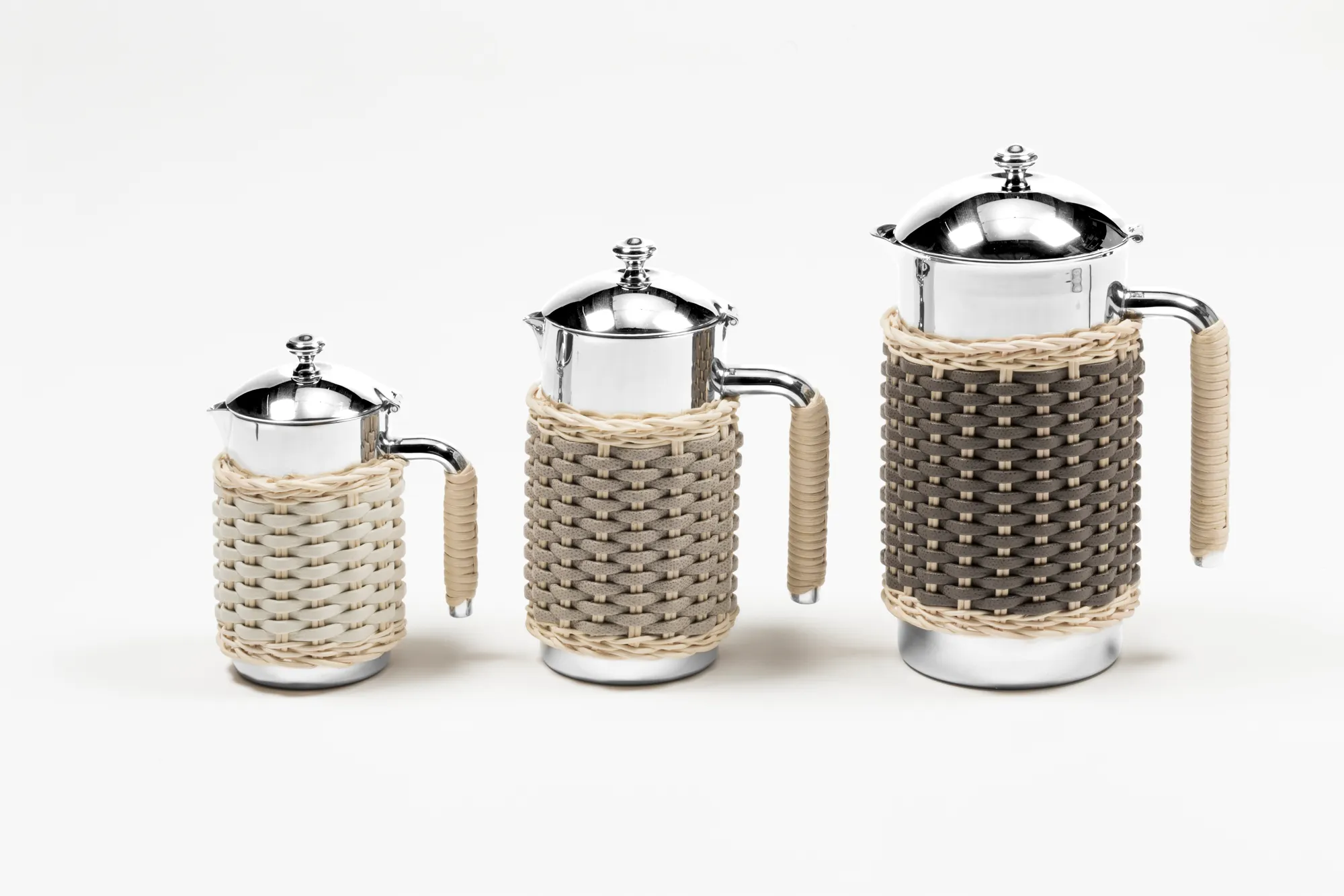 Insulated stainless steel carafes with chrome-plated finish and partially covered in woven leather and rattan. Two-chamber structure able to maintain the liquid’s temperatures. Only available with natural rattan (RT06) combined with golf or nappa leather.