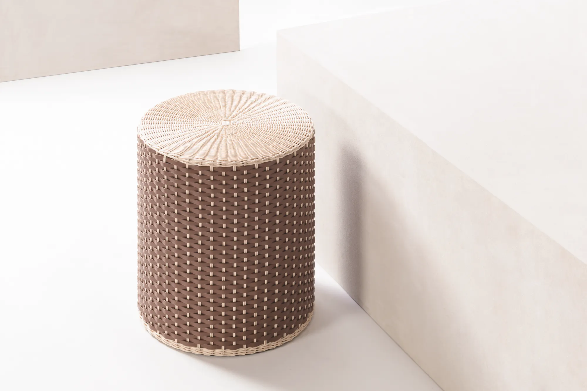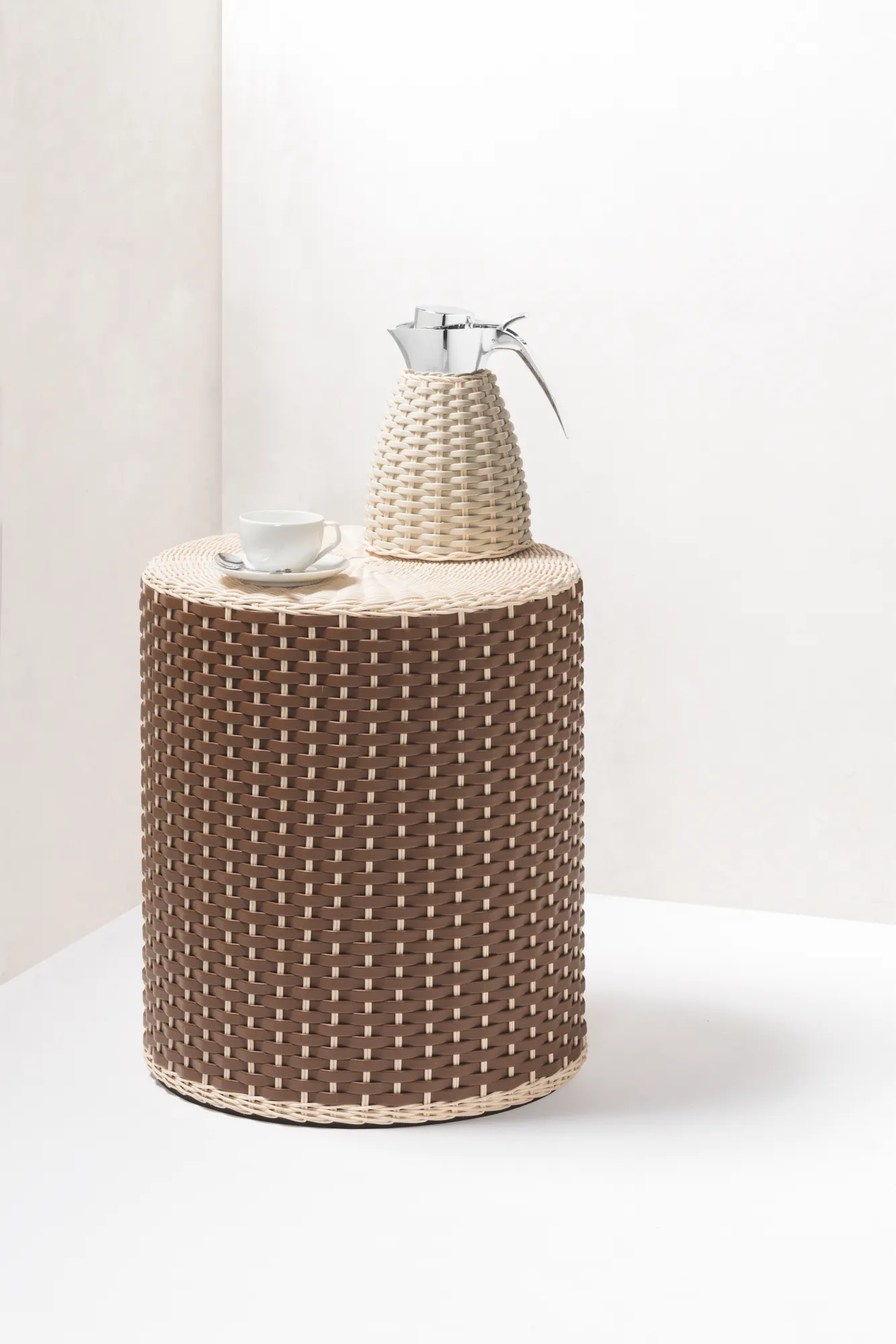 Wood structure covered in woven leather and rattan. Only available with natural rattan (RT06) combined with golf or nappa leather.