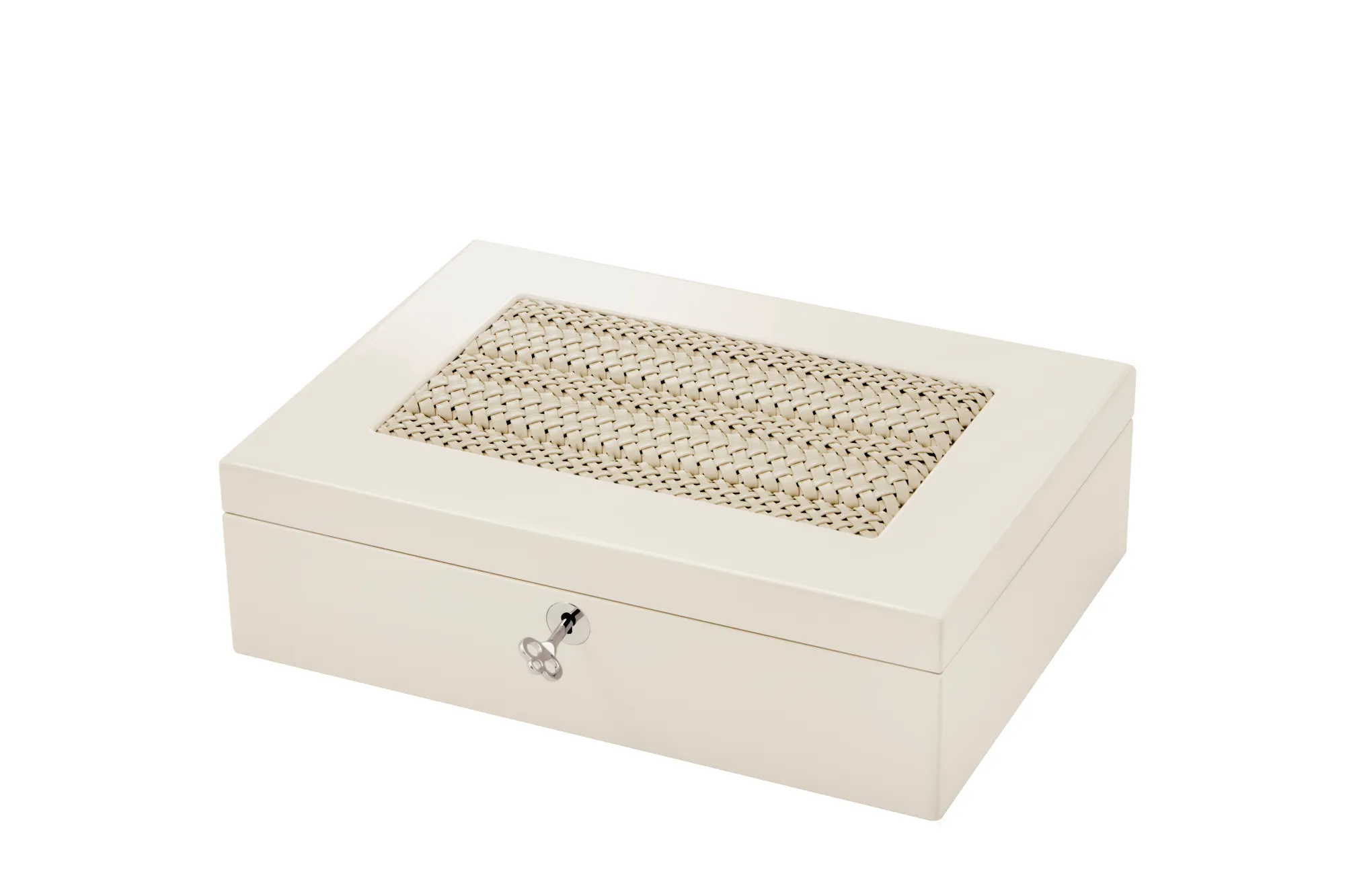 Lacquered wood box with hand-braided leather inlay, suede lining. Jewellery box with removable tray, lacquered wood with hand-braided leather inlay, suede lining.