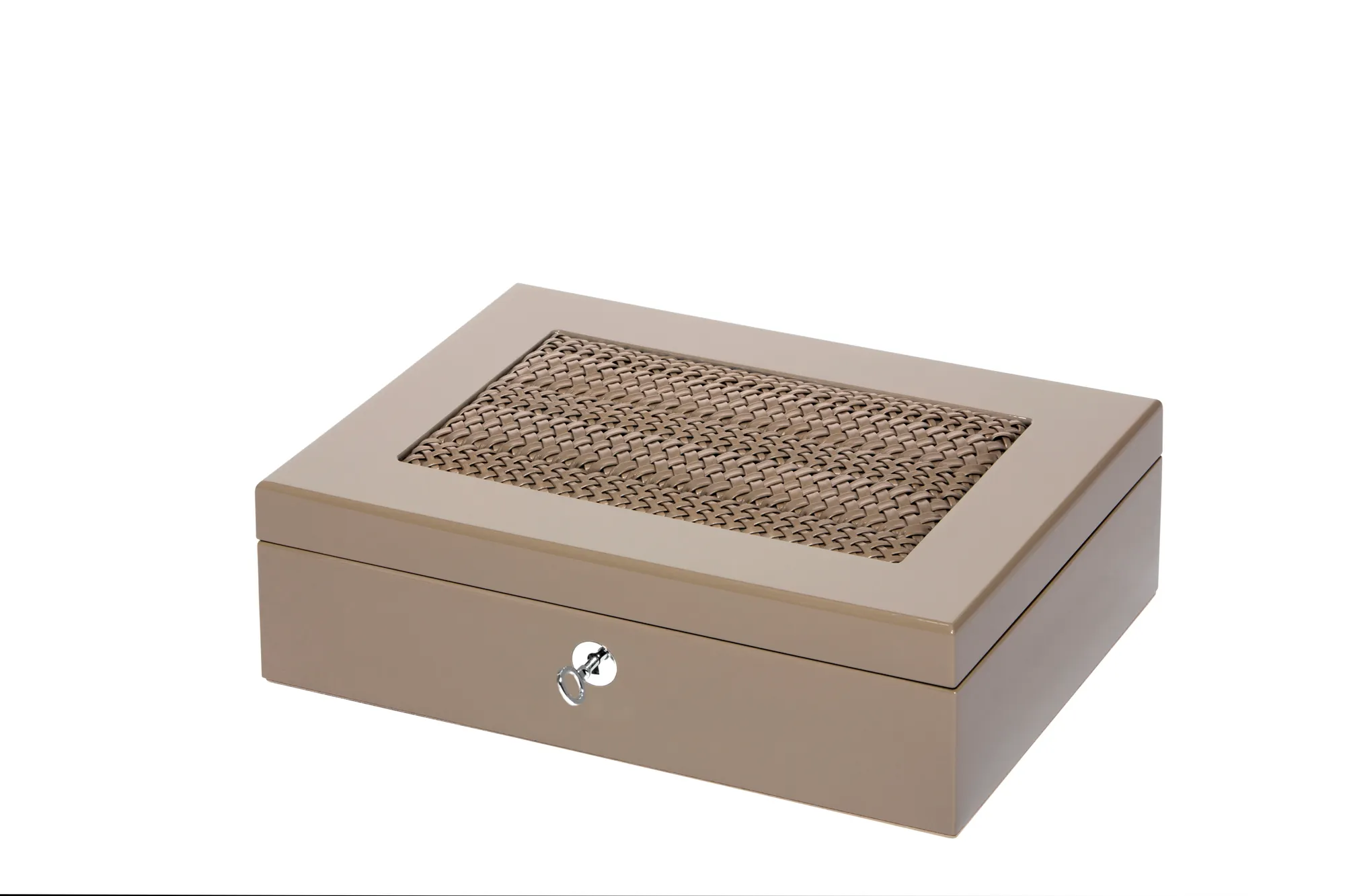 Lacquered wood box with hand-braided leather inlay, suede lining. Jewellery box with removable tray, lacquered wood with hand-braided leather inlay, suede lining.
