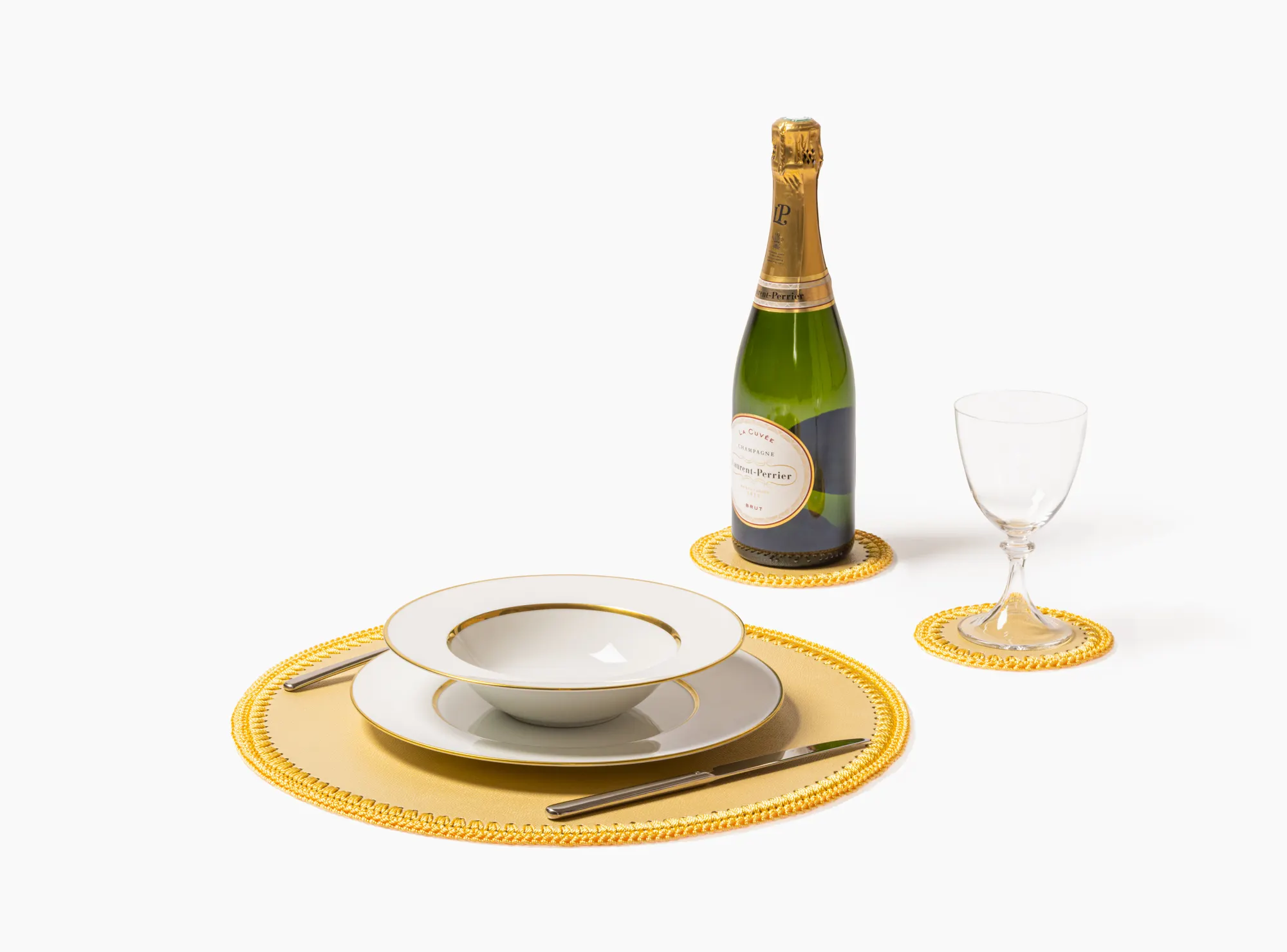 The Rochelle collection of coasters and placemats features the vibrant combination of a fine leather center and a refined hand-woven trimming (passementerie) edge. This collection is ideal for year-round dining indoors or outdoors and requires simple care: wipe clean with a sponge or cloth. Choose the trimming color by checking the Printed Calfskin Golf color chart at the end of the catalogue. The thread that will be applied will be the one that best matches the selected nuance.