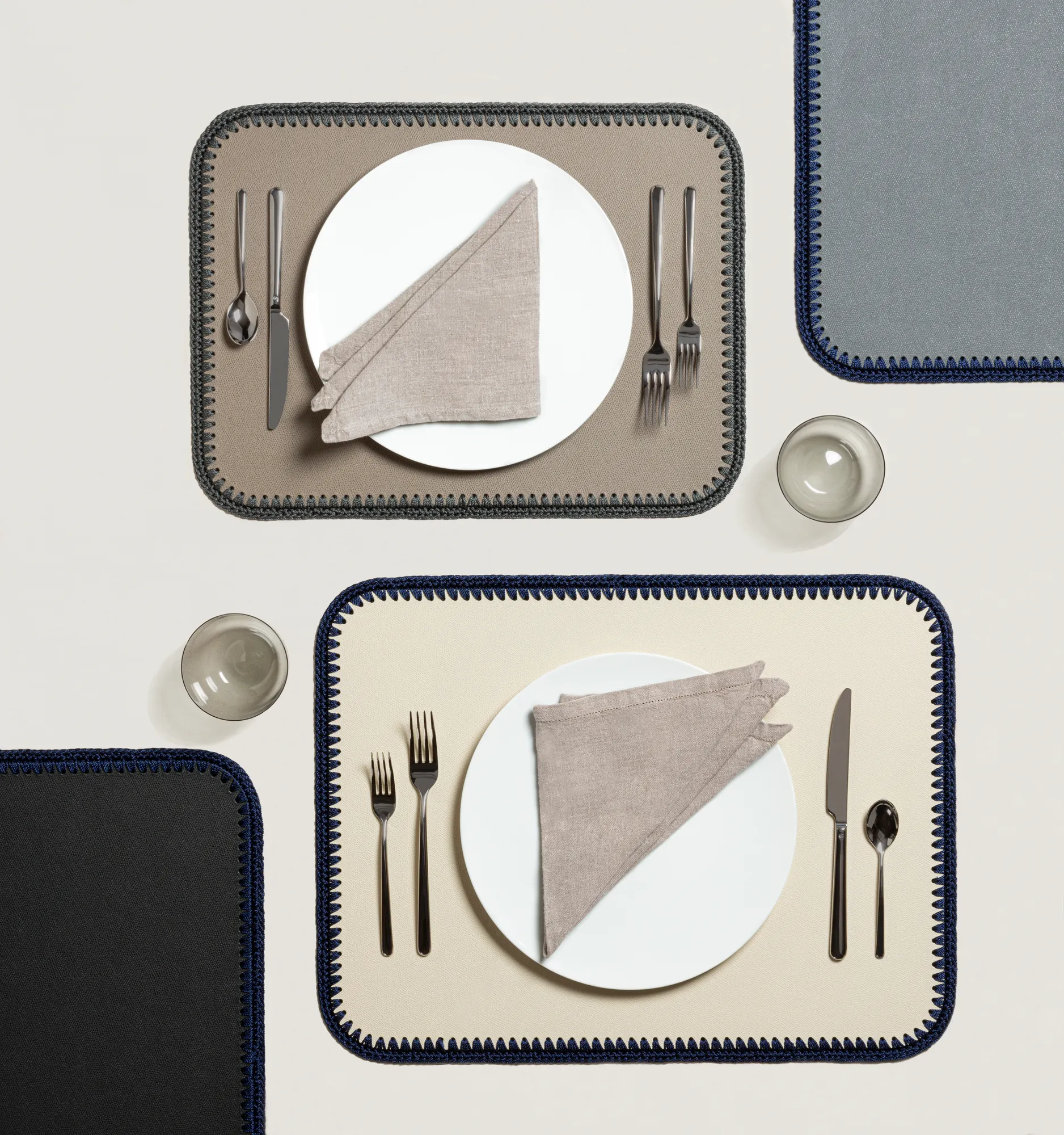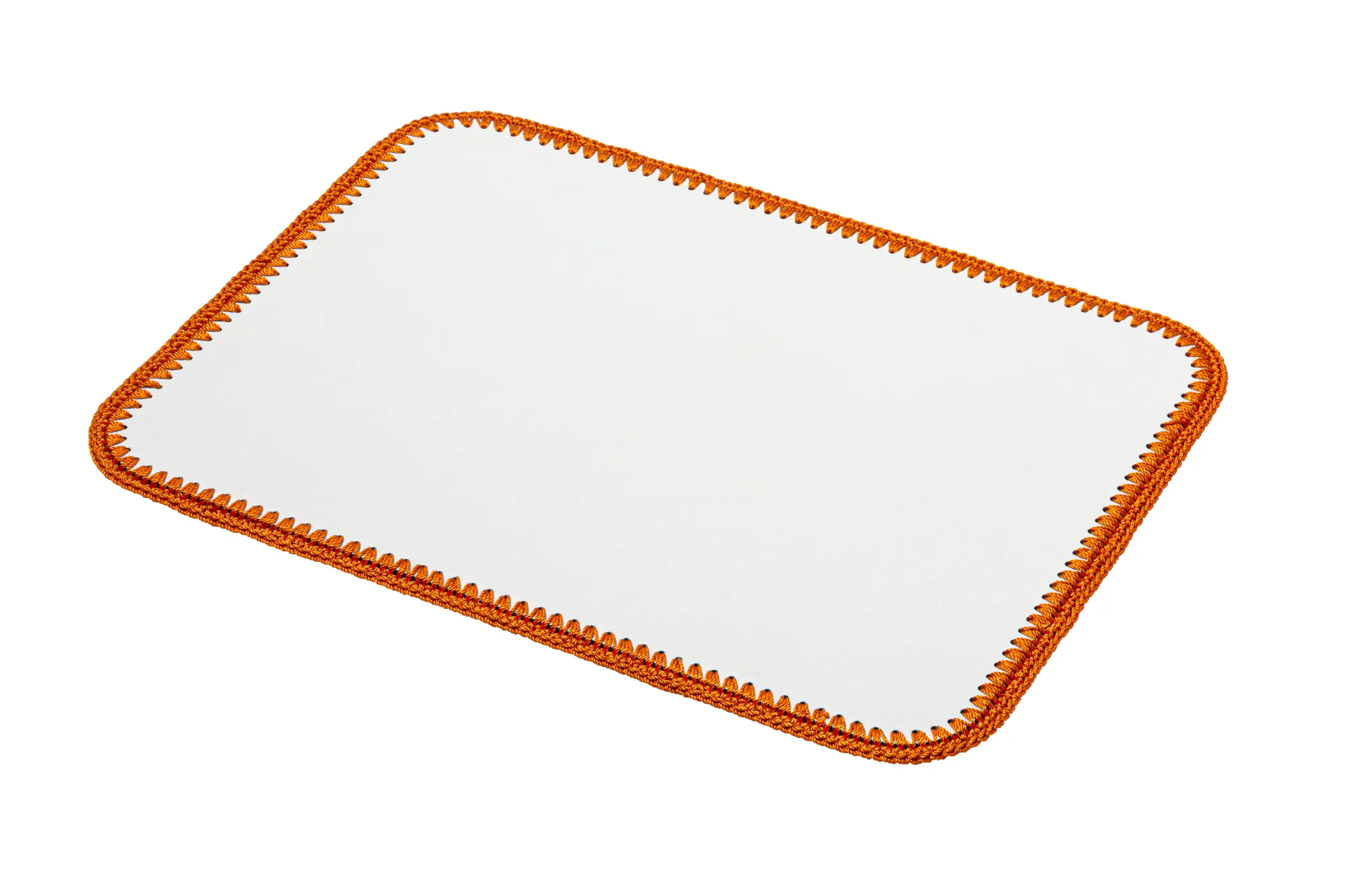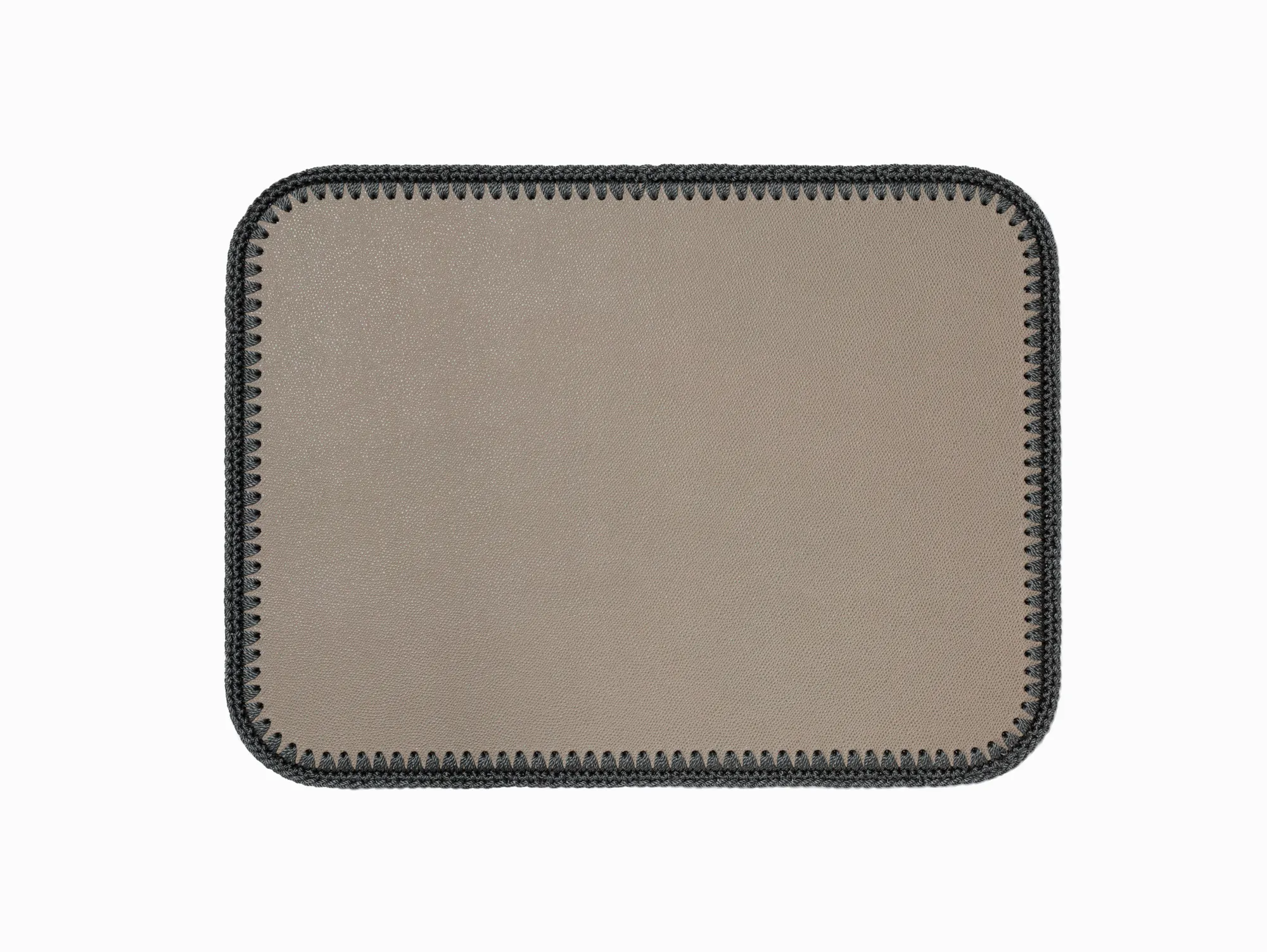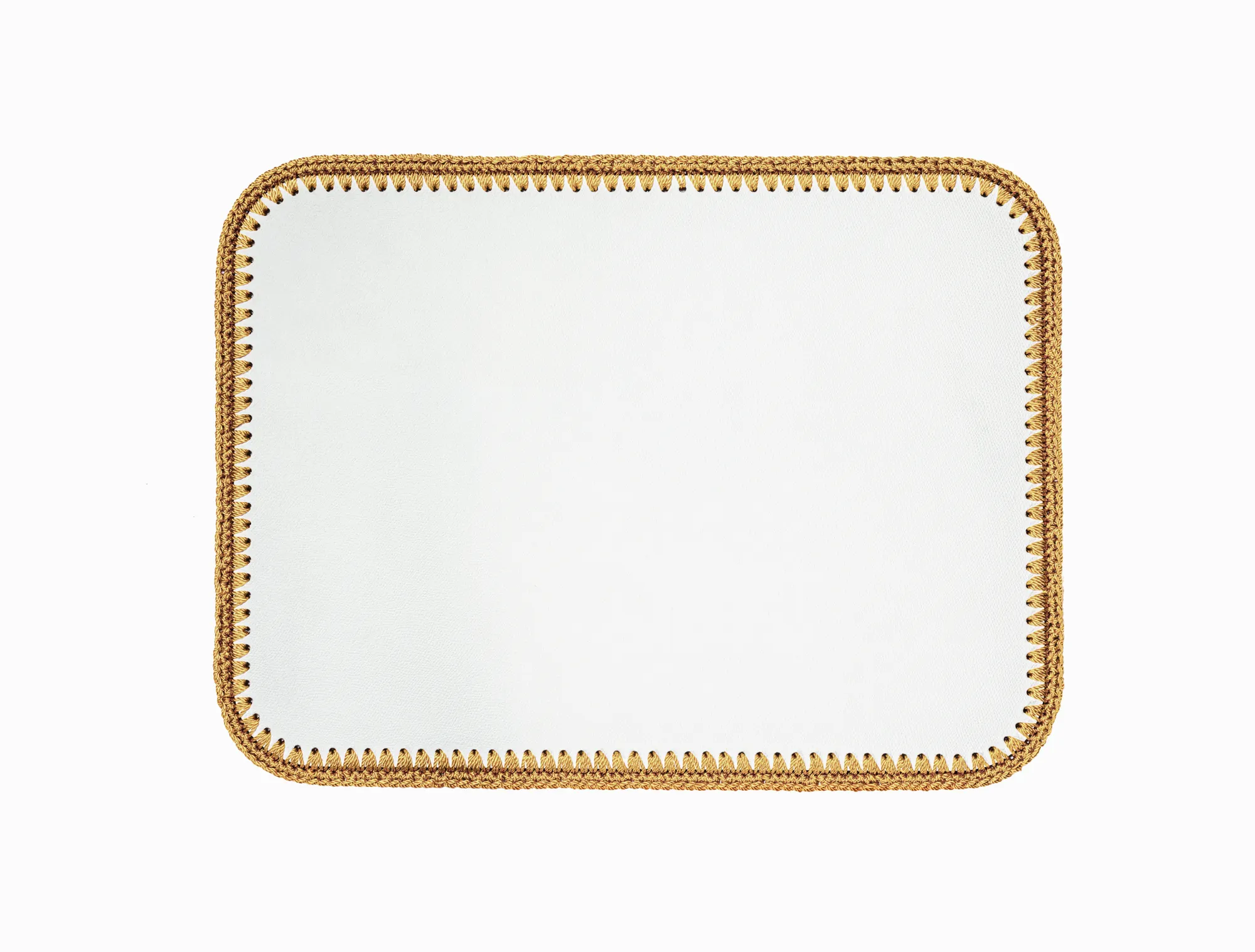 The Rochelle collection of coasters and placemats features the vibrant combination of a fine leather center and a refined hand-woven trimming (passementerie) edge. This collection is ideal for year-round dining indoors or outdoors and requires simple care: wipe clean with a sponge or cloth. Choose the trimming color by checking the Printed Calfskin Golf color chart at the end of the catalogue. The thread that will be applied will be the one that best matches the selected nuance.