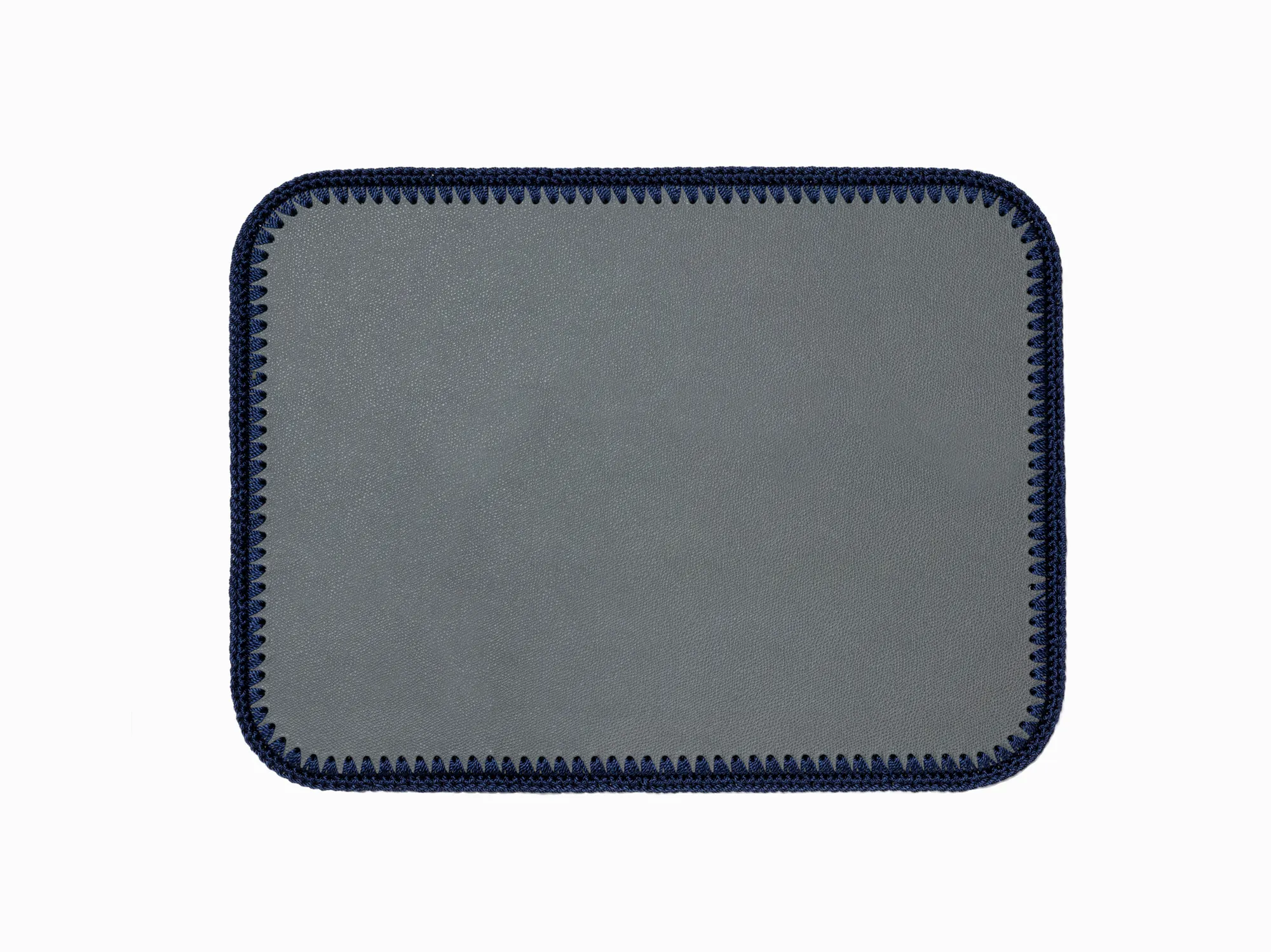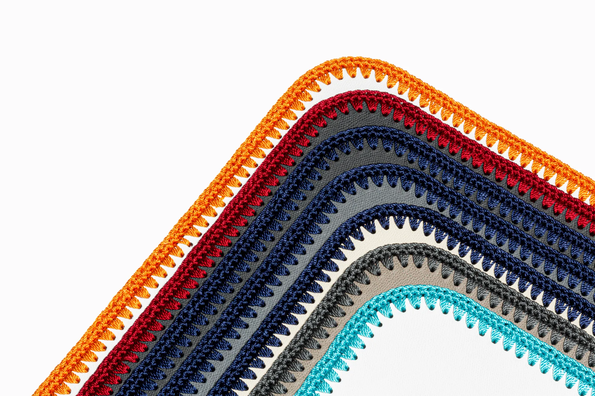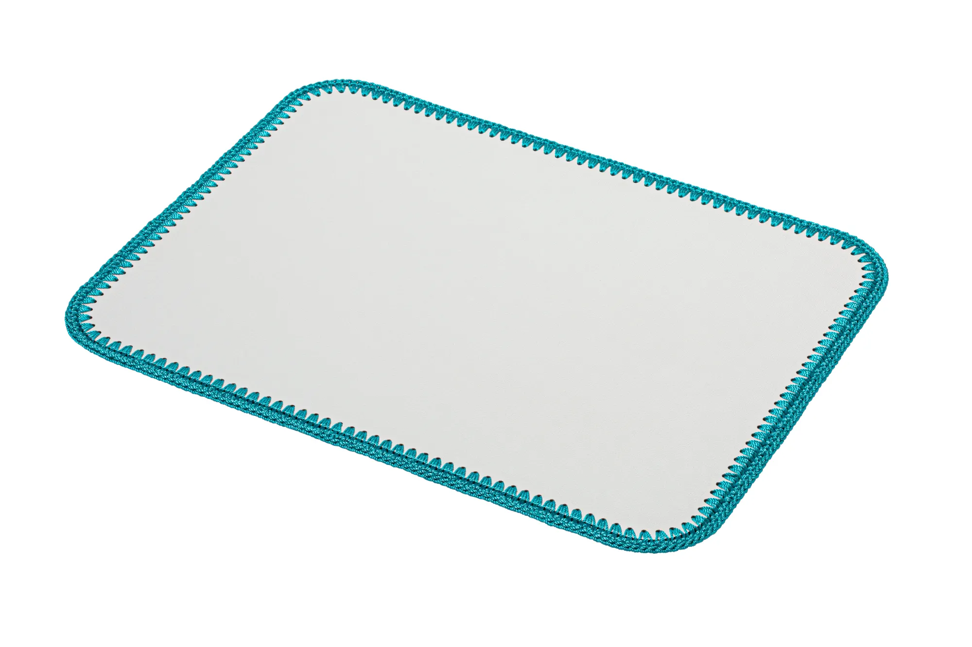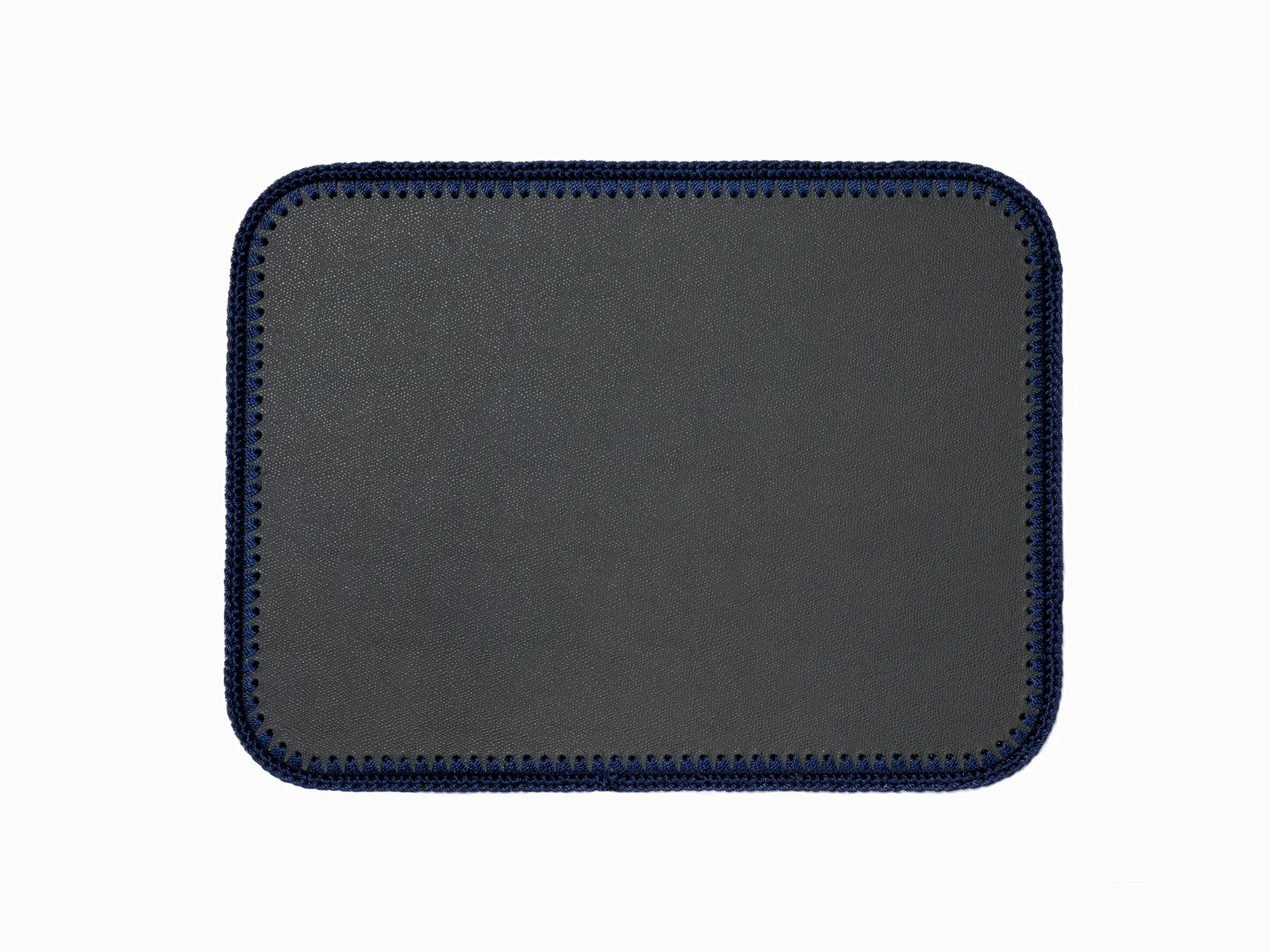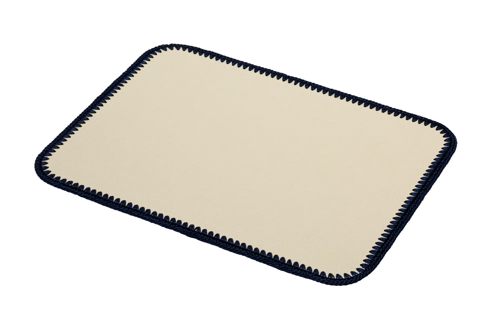 The Rochelle collection of coasters and placemats features the vibrant combination of a fine leather center and a refined hand-woven trimming (passementerie) edge. This collection is ideal for year-round dining indoors or outdoors and requires simple care: wipe clean with a sponge or cloth. Choose the trimming color by checking the Printed Calfskin Golf color chart at the end of the catalogue. The thread that will be applied will be the one that best matches the selected nuance.