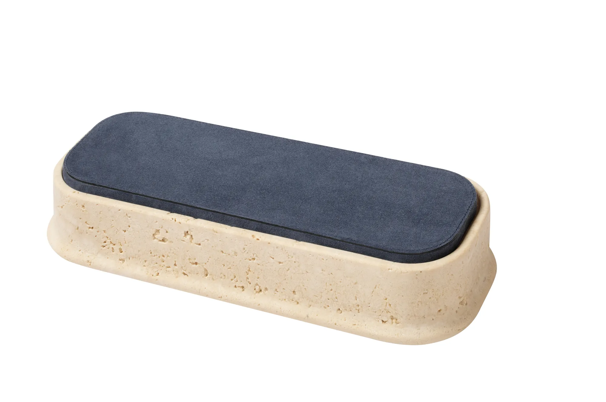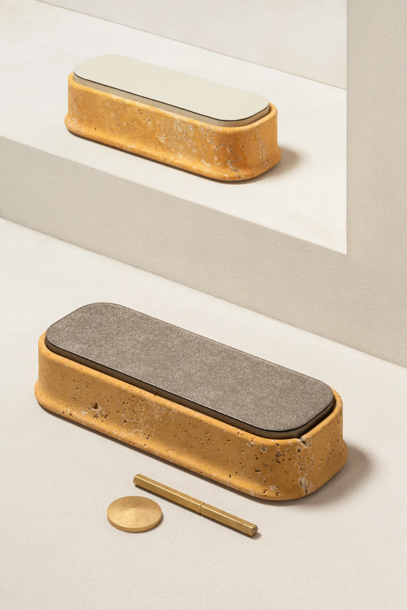 The essential lines and soft volumes of this collection fully enhances the beauty of travertine. Available in several nuances of choice, and provided with removable leather placemats, the Rodi boxes play with solids and voids, light contrasts and color matches. Custom sizes available on request.