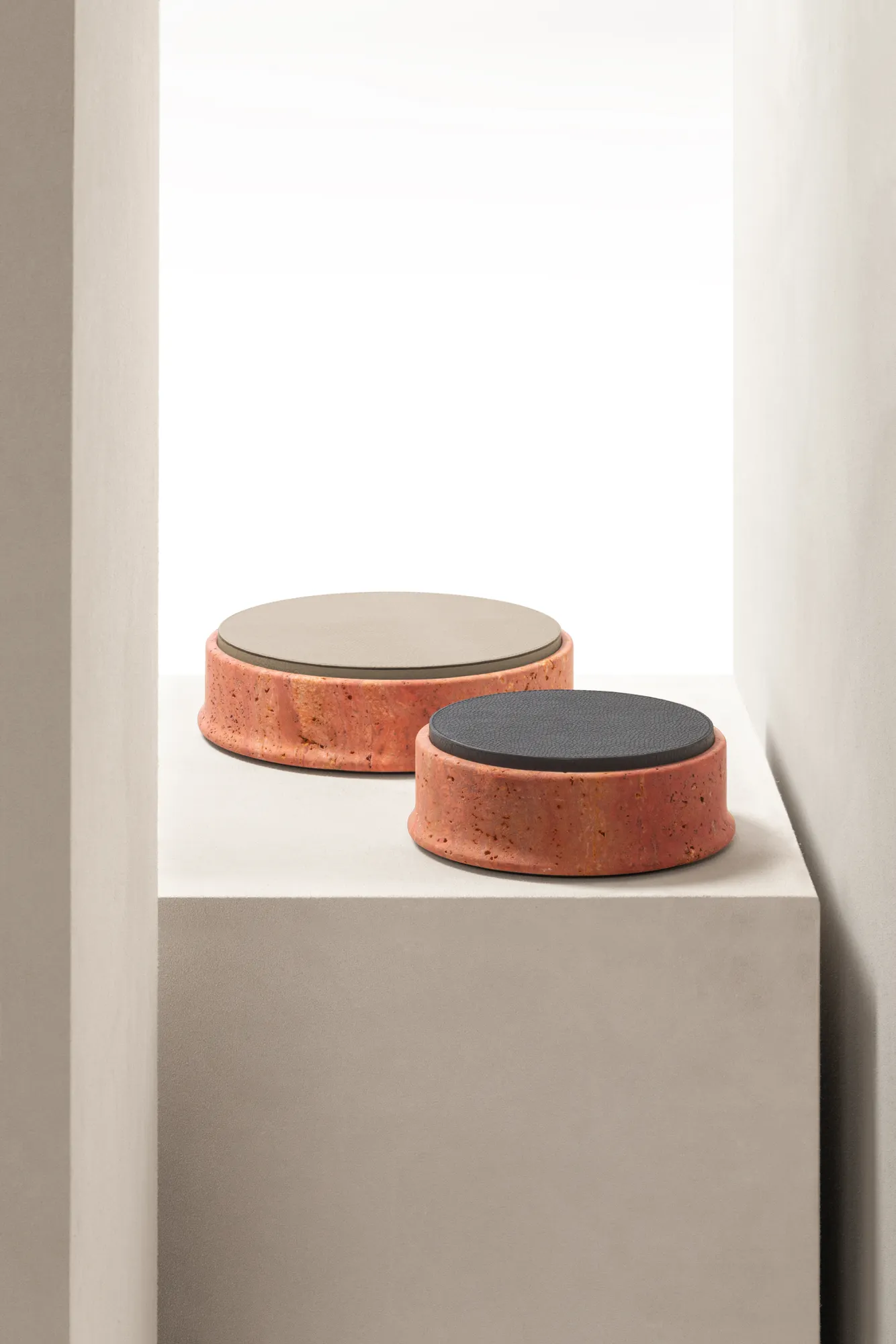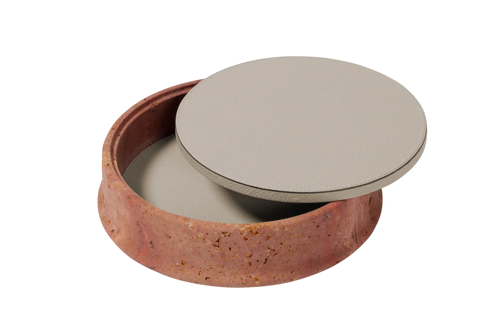 The essential lines and soft volumes of this collection fully enhances the beauty of travertine. Available in several nuances of choice, and provided with removable leather placemats, the Rodi boxes play with solids and voids, light contrasts and color matches. Custom sizes available on request.