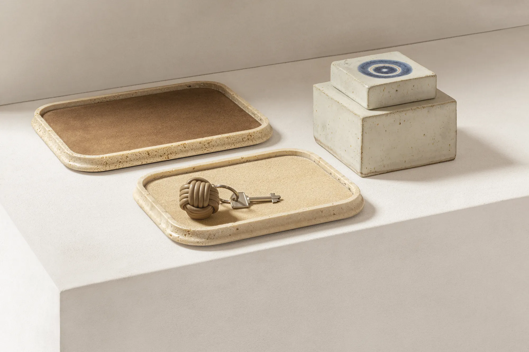 The essential lines and soft volumes of this collection fully enhances the beauty of travertine. Available in several nuances of choice, and provided with removable leather placemats, the Rodi valet trays play with solids and voids, light contrasts and color matches. Custom sizes available on request.