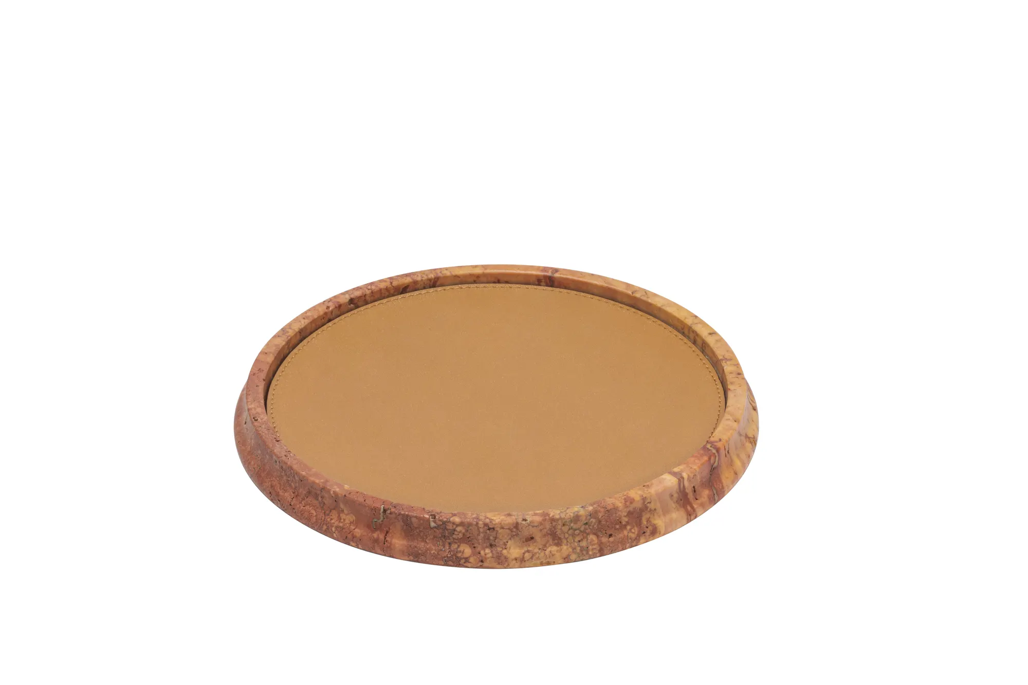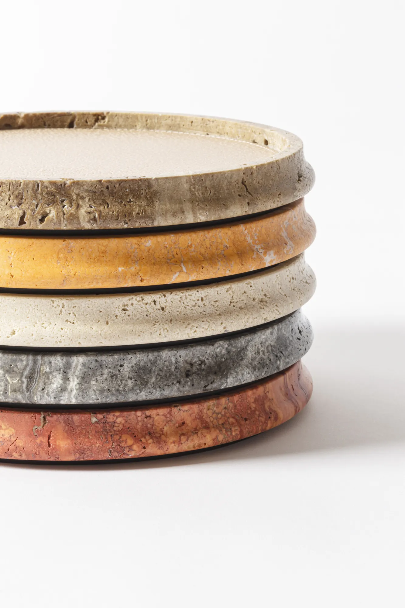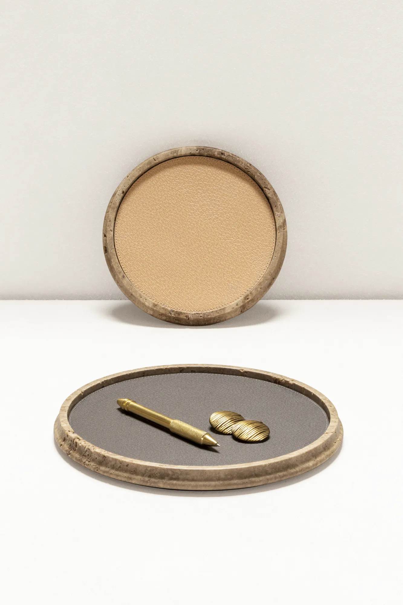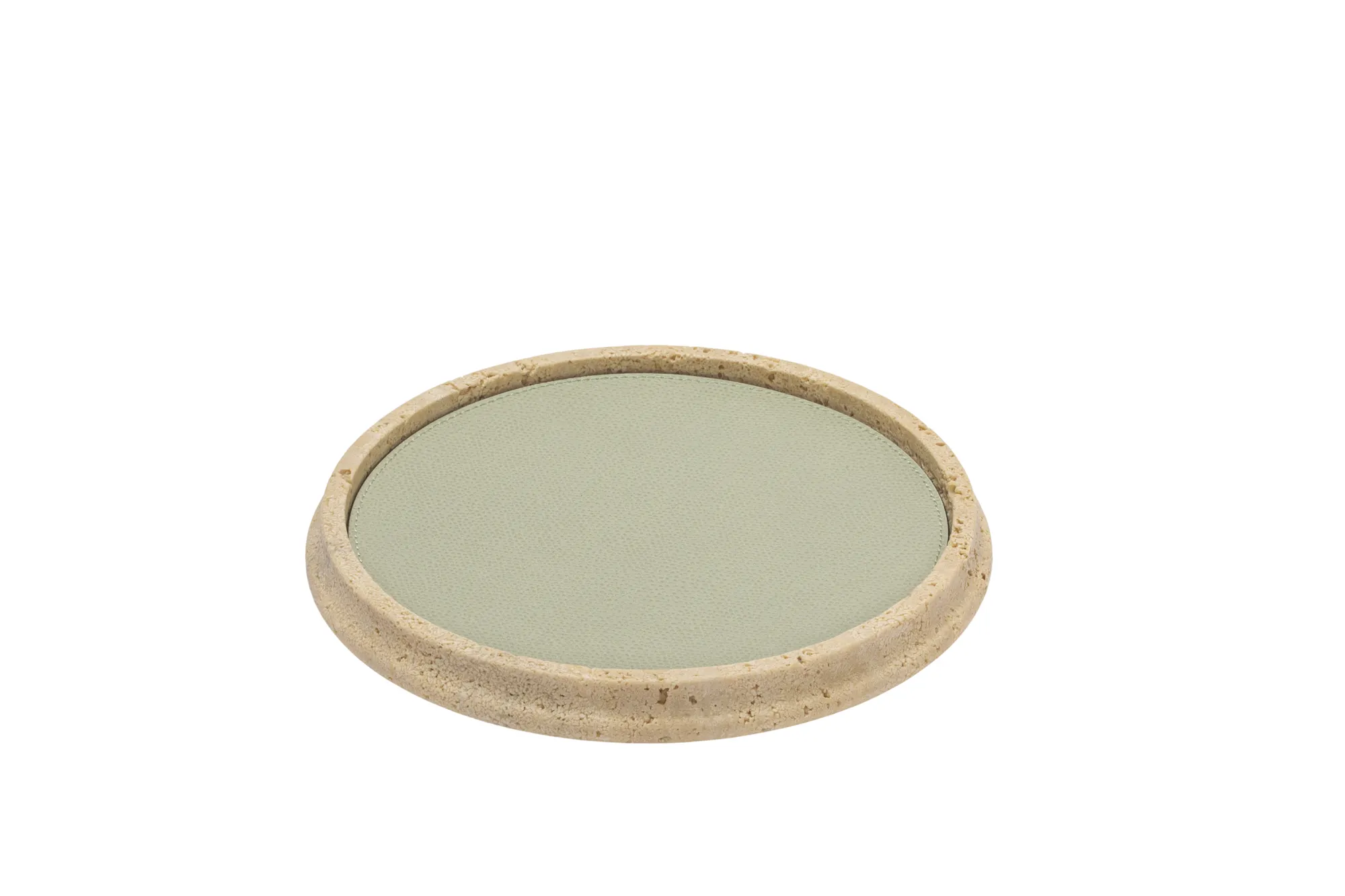 The essential lines and soft volumes of this collection fully enhances the beauty of travertine. Available in several nuances of choice, and provided with removable leather placemats, the Rodi valet trays play with solids and voids, light contrasts and color matches. Custom sizes available on request.