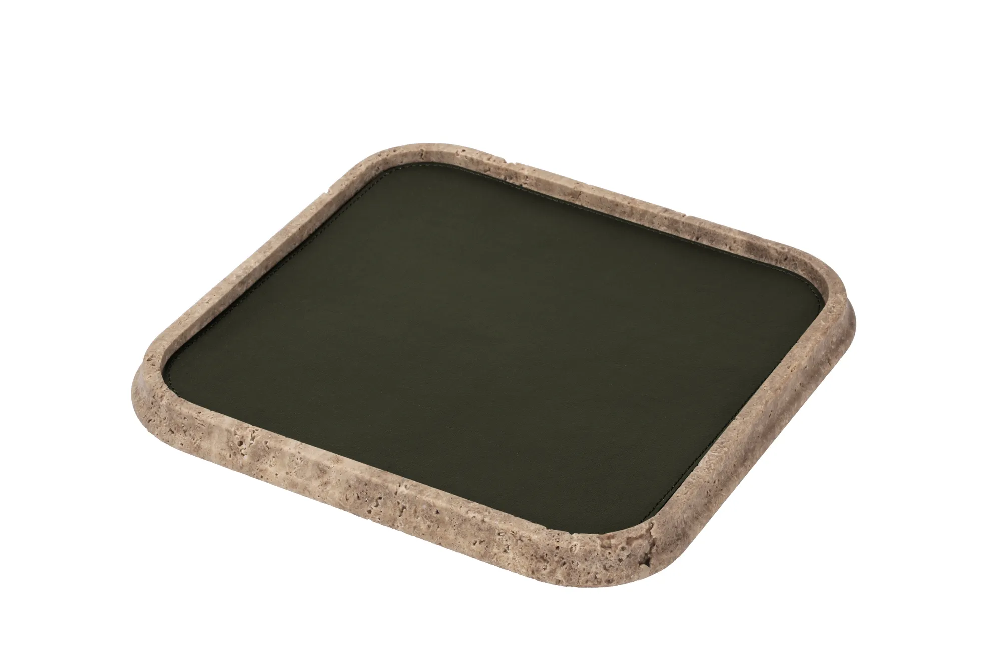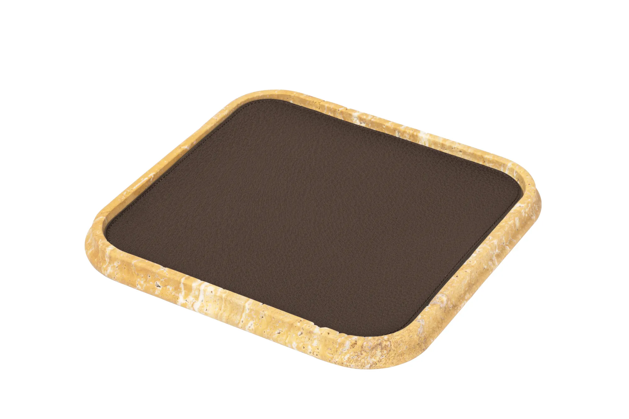 The essential lines and soft volumes of this collection fully enhances the beauty of travertine. Available in several nuances of choice, and provided with removable leather placemats, the Rodi valet trays play with solids and voids, light contrasts and color matches. Custom sizes available on request.