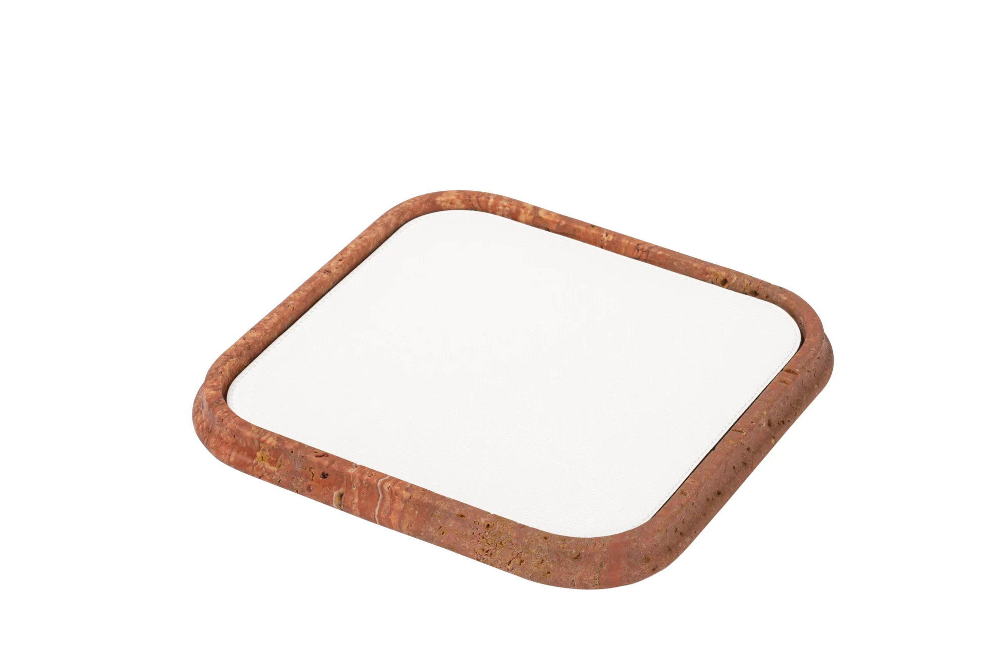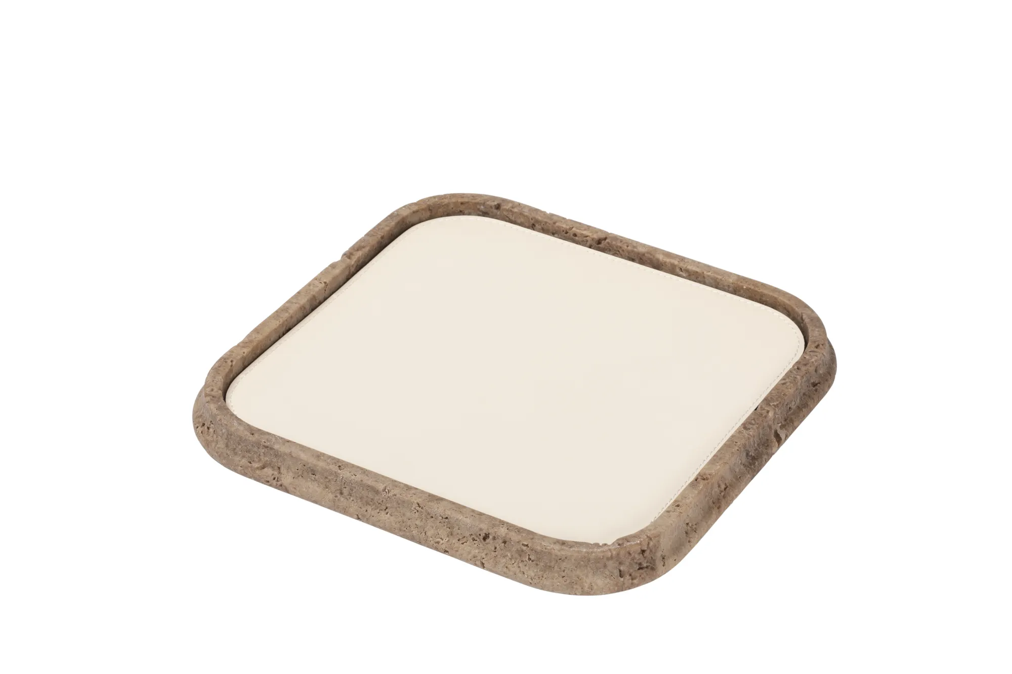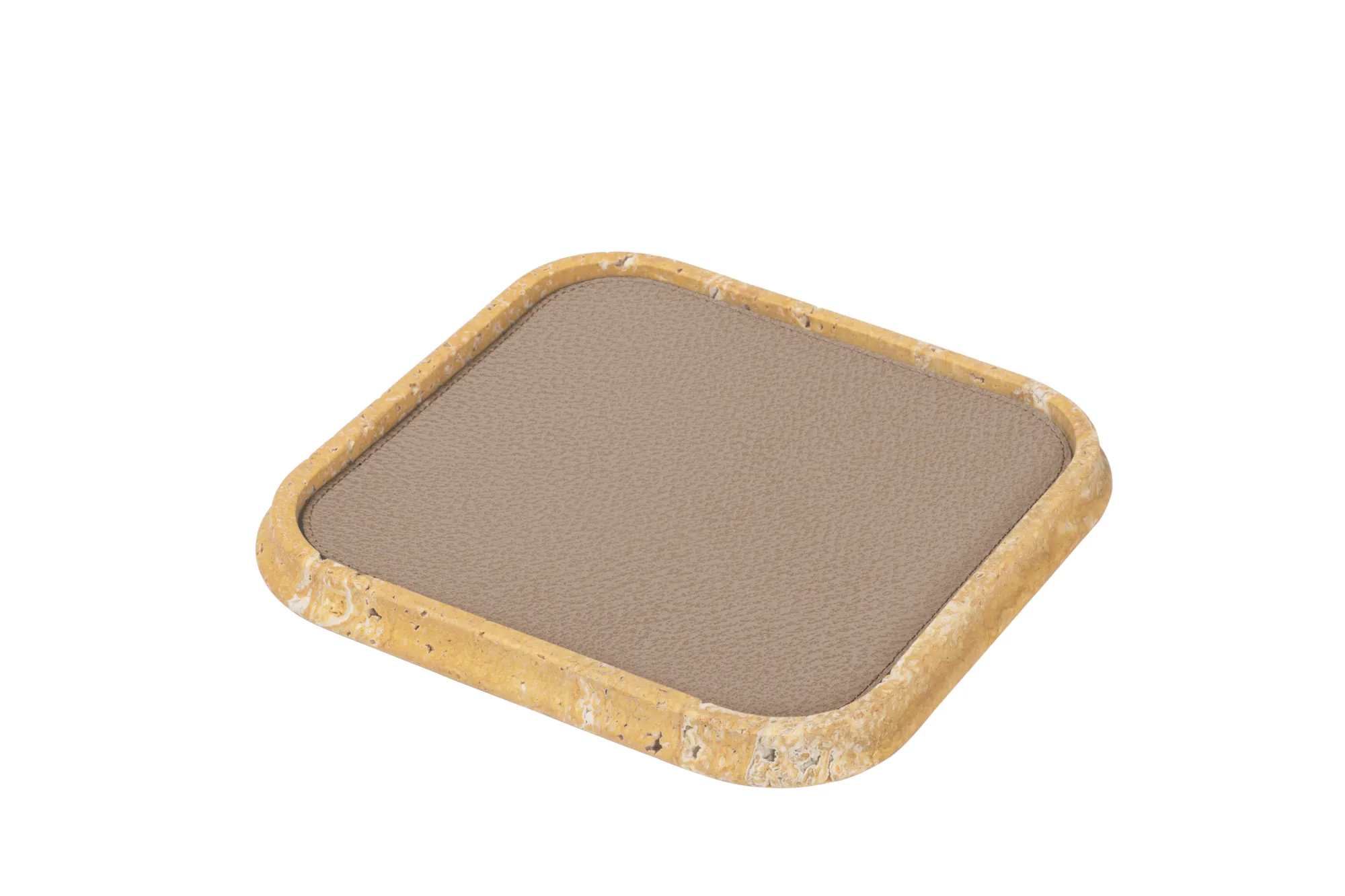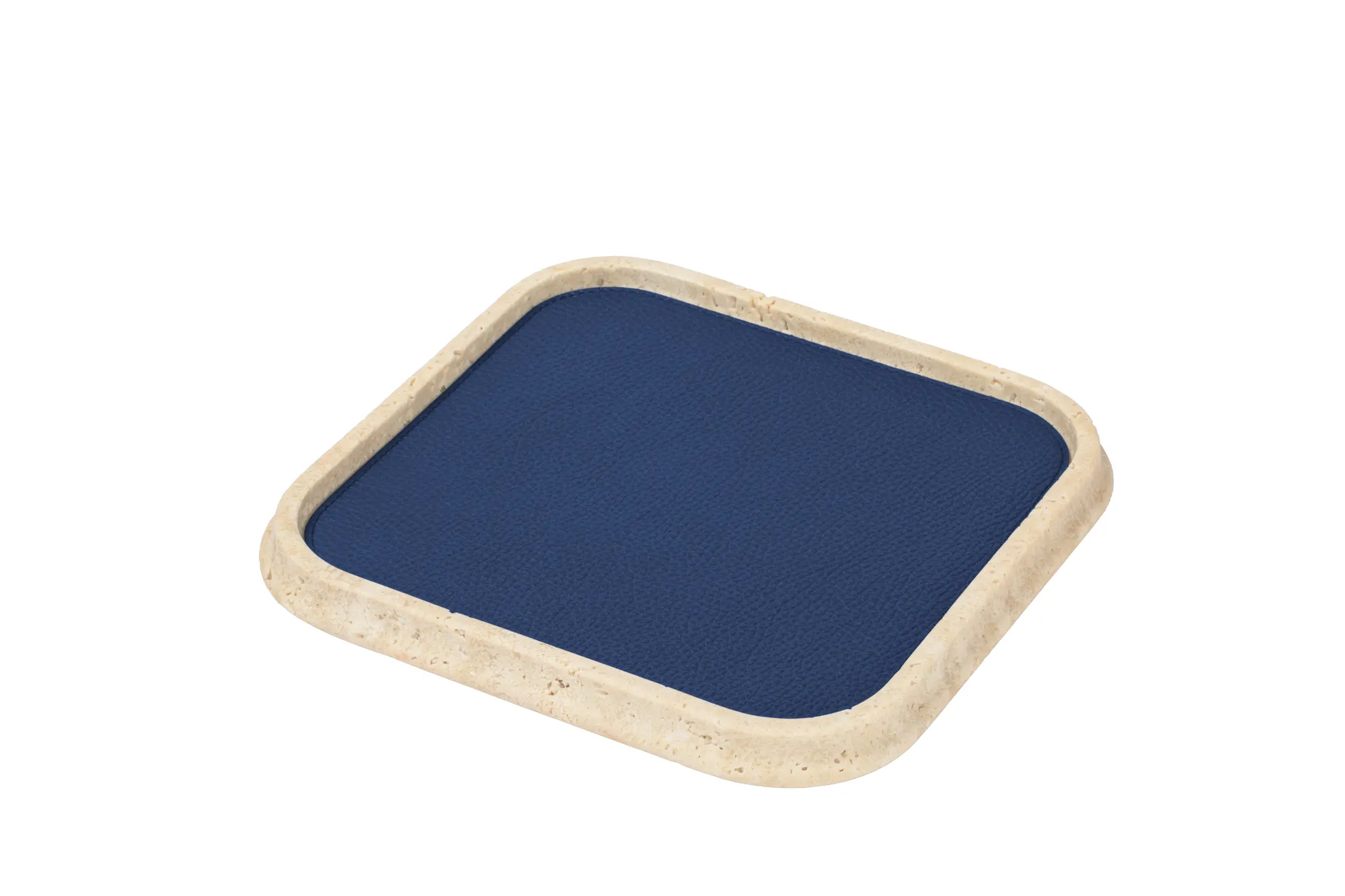 The essential lines and soft volumes of this collection fully enhances the beauty of travertine. Available in several nuances of choice, and provided with removable leather placemats, the Rodi valet trays play with solids and voids, light contrasts and color matches. Custom sizes available on request.