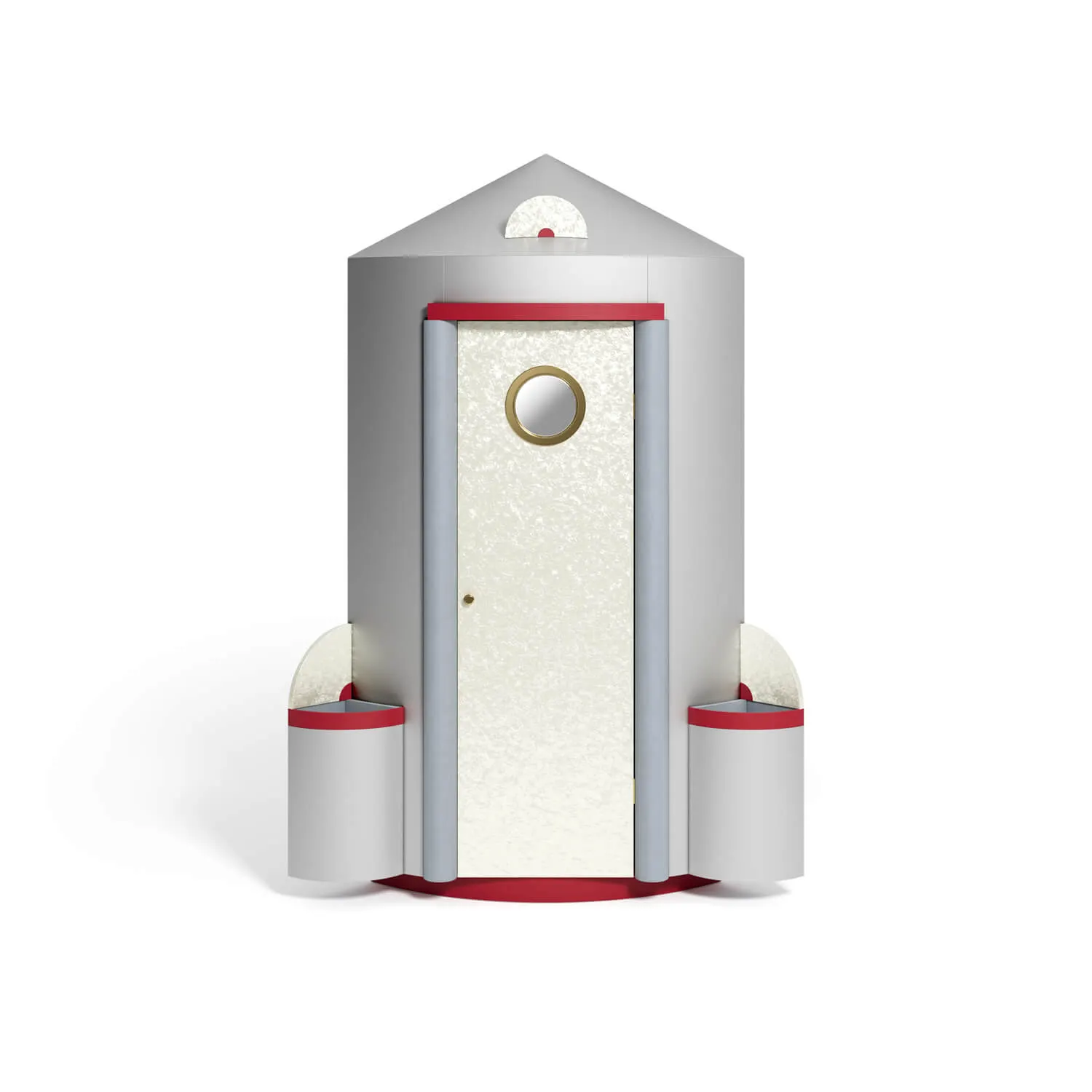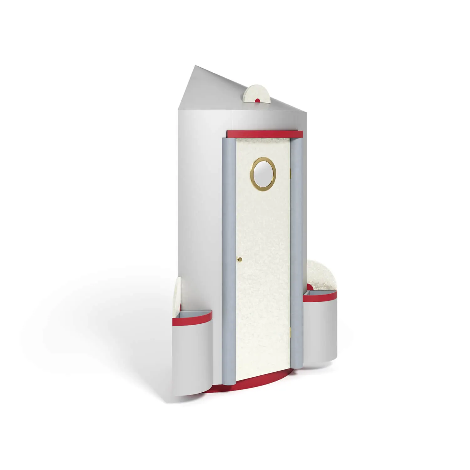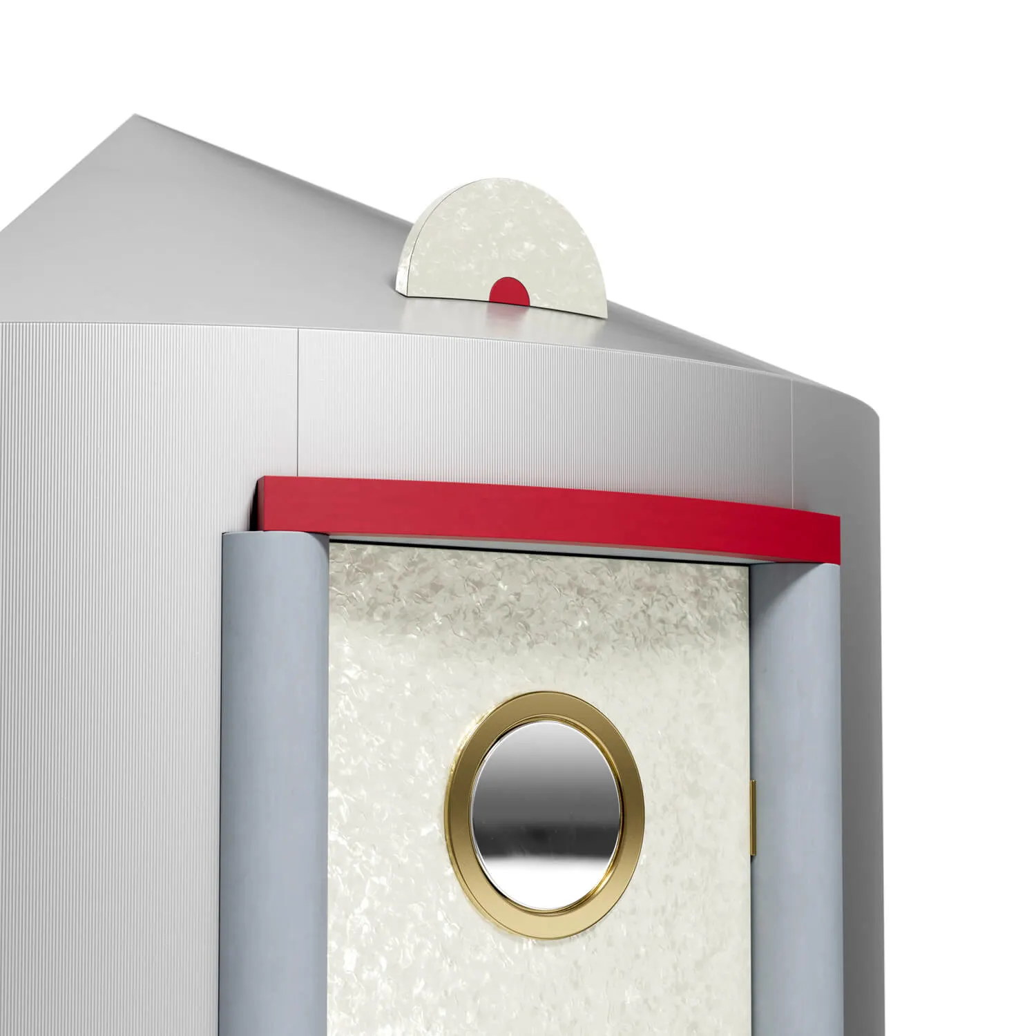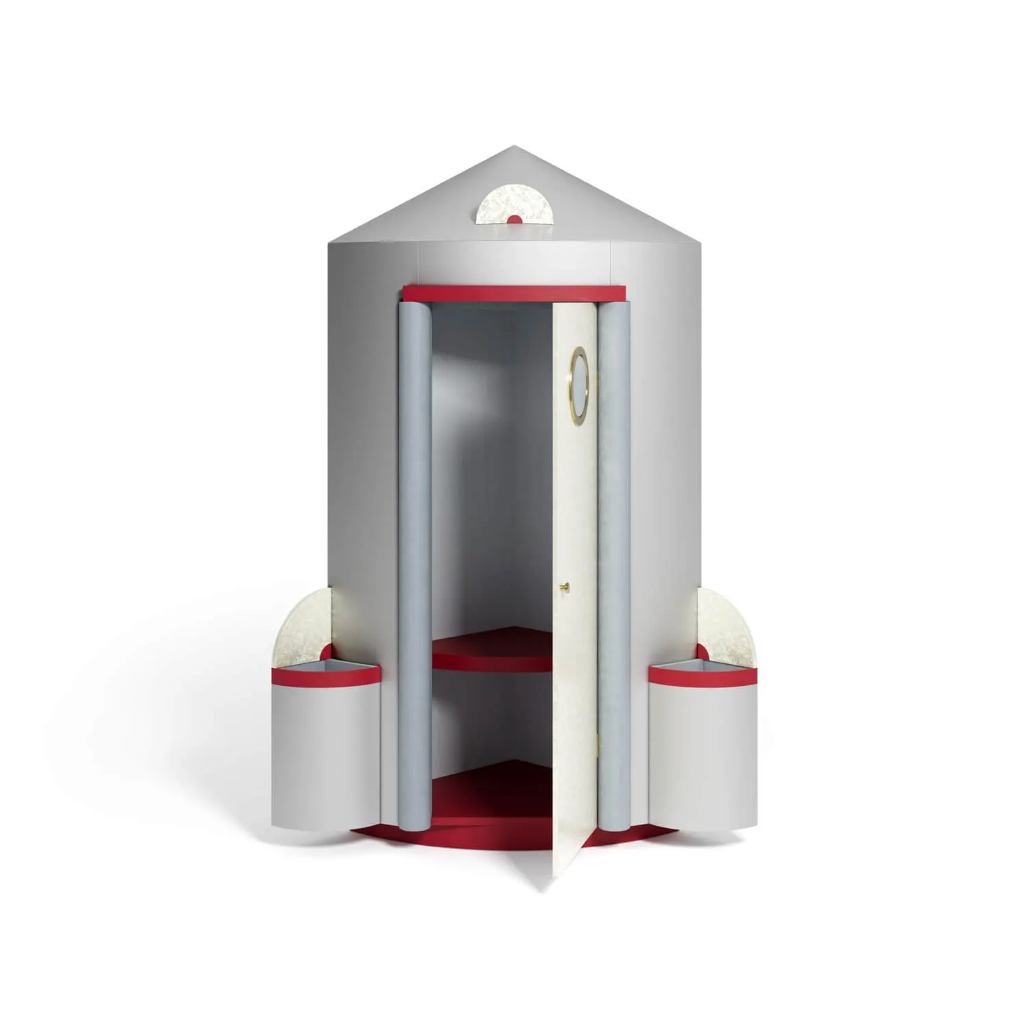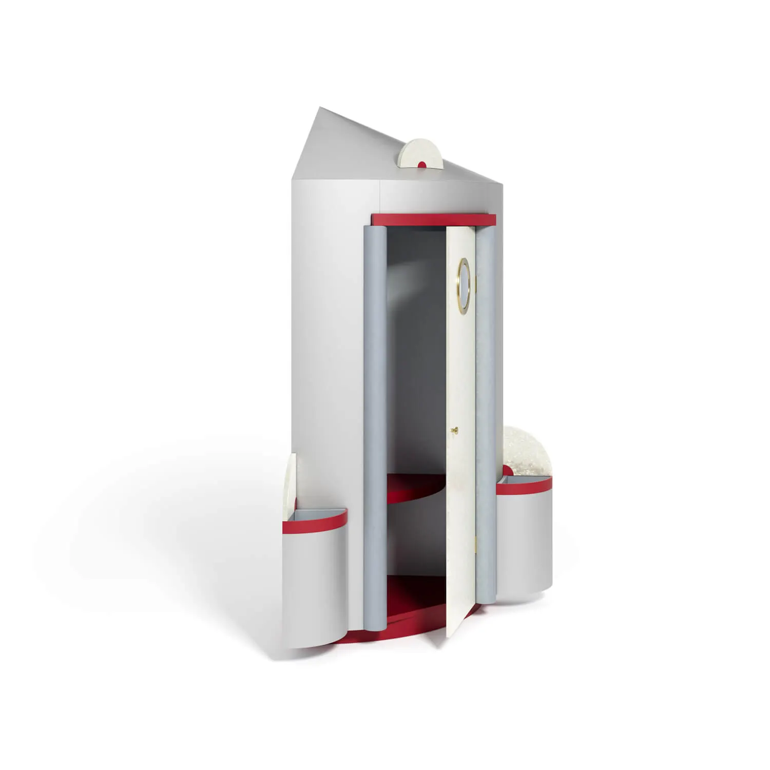 Who knows why Matteo Thun chose the name Sacher, like the famous Viennese chocolate cake, for a corner cabinet whose curious form and colors remind us of a rocket on its way into space? Sacher is a metaphysical cabin reaching upward, composed of three containers of different sizes: at the center, the larger panel opens like a door topped by a tympanum, through which to peer into the inner chamber through a porthole. Irony, spatial metaphor, Sacher never ceases to amaze with its mysterious form and a few touches of red. Hallway cabinet in wood covered with decorative laminate. Limited edition of 10 pieces. Mobile da ingresso rivestito in laminato decorativo. Edizione limitata di 10 pezzi.