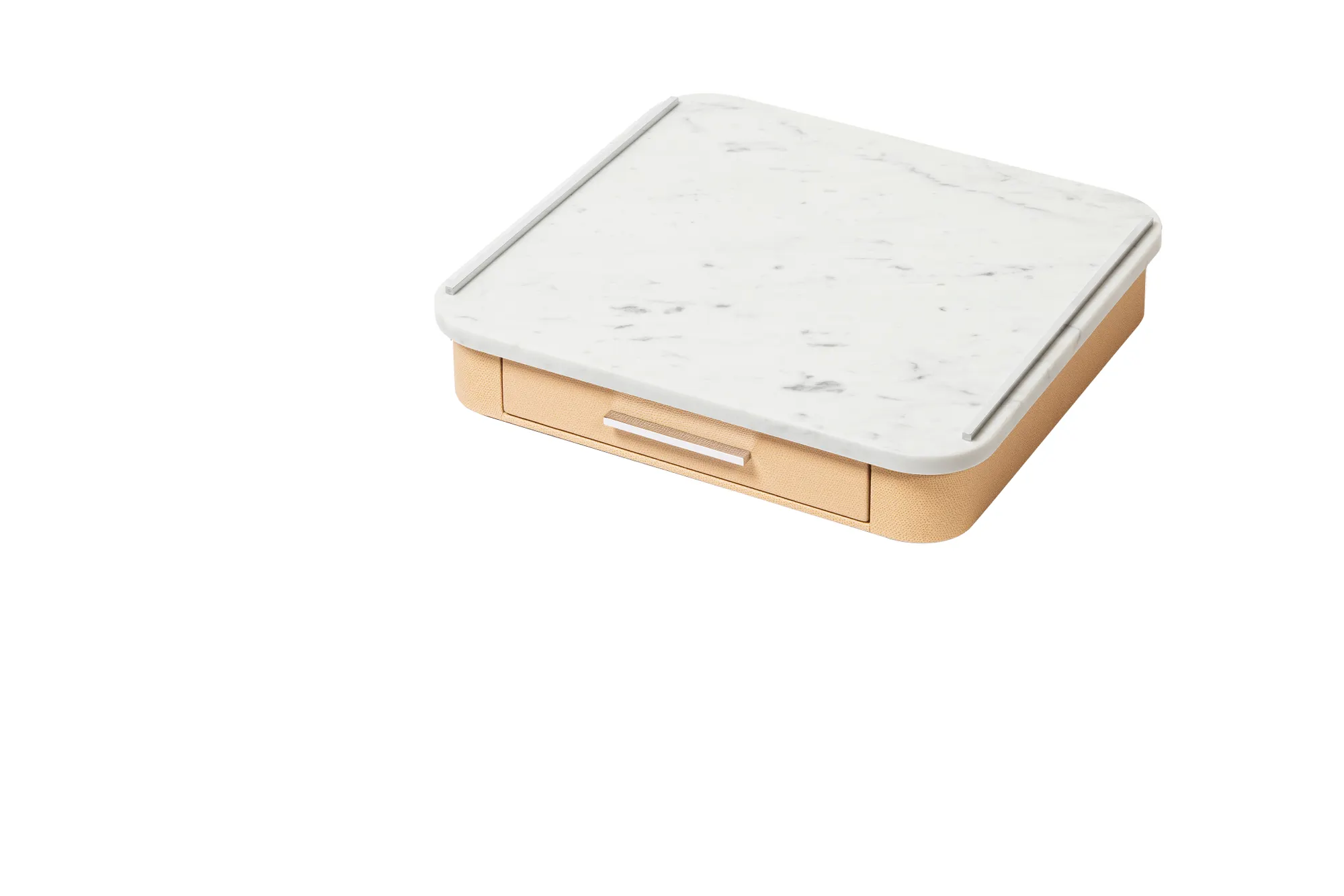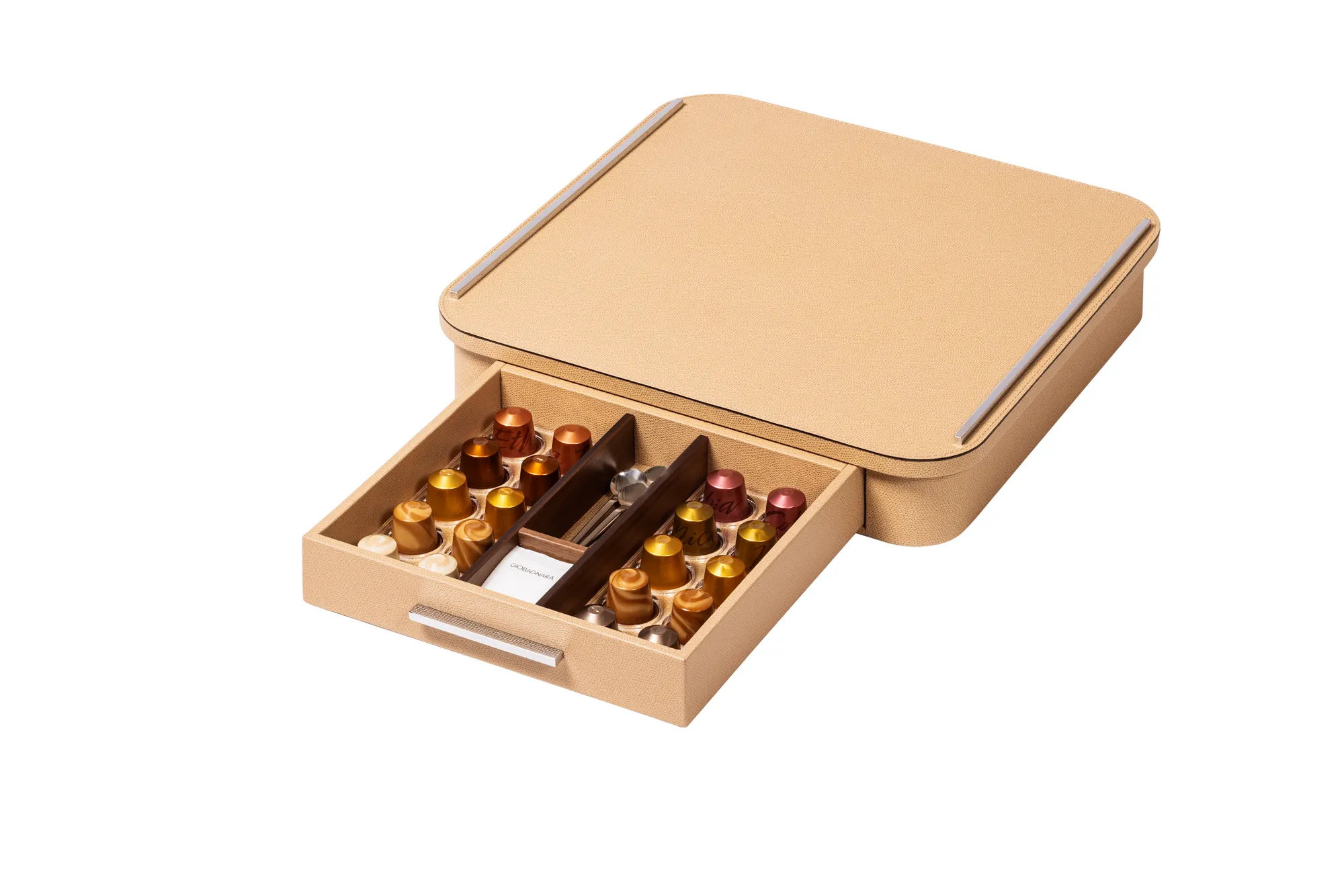 Leather-covered wood structure with metal inserts available in three finishes. The top can be customized in a refined selection of materials: leather, Corian®, or marble (available either in classic travertine or arabescato white). The drawer features inner walnut wood partitions to host coffee spoons, sugar and 20 Nespresso classic capsules.