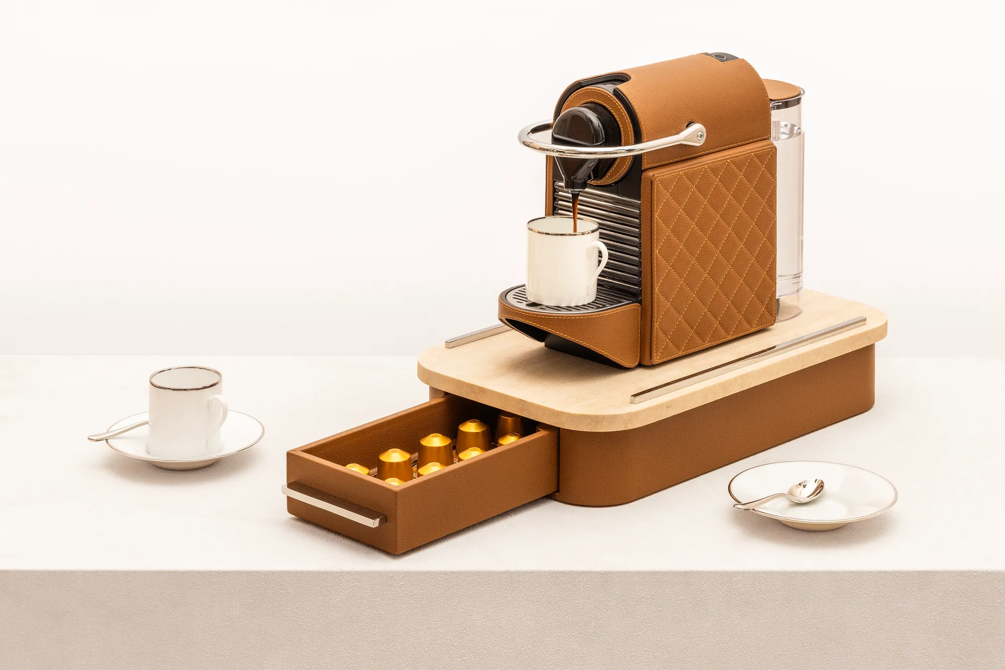 Leather-covered wood structure with metal inserts available in three finishes. The top can be customized in a refined selection of materials: leather, Corian®, or marble (available either in classic travertine or arabescato white). The drawer features inner walnut wood partitions to host 10 Nespresso classic capsules.