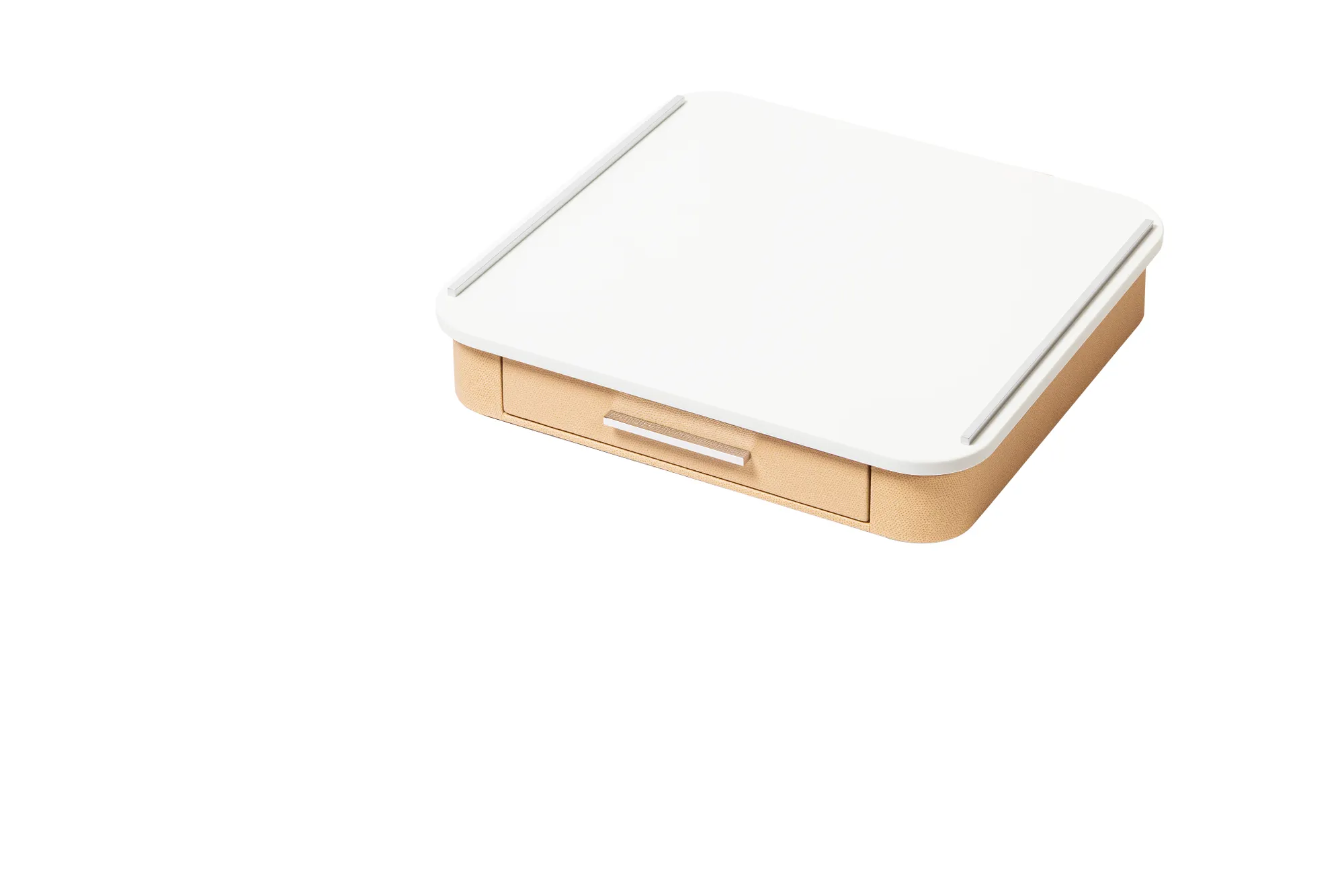 Leather-covered wood structure with metal inserts available in three finishes. The top can be customized in a refined selection of materials: leather, Corian®, or marble (available either in classic travertine or arabescato white). The drawer features inner walnut wood partitions to host coffee spoons, sugar and 20 Nespresso classic capsules.