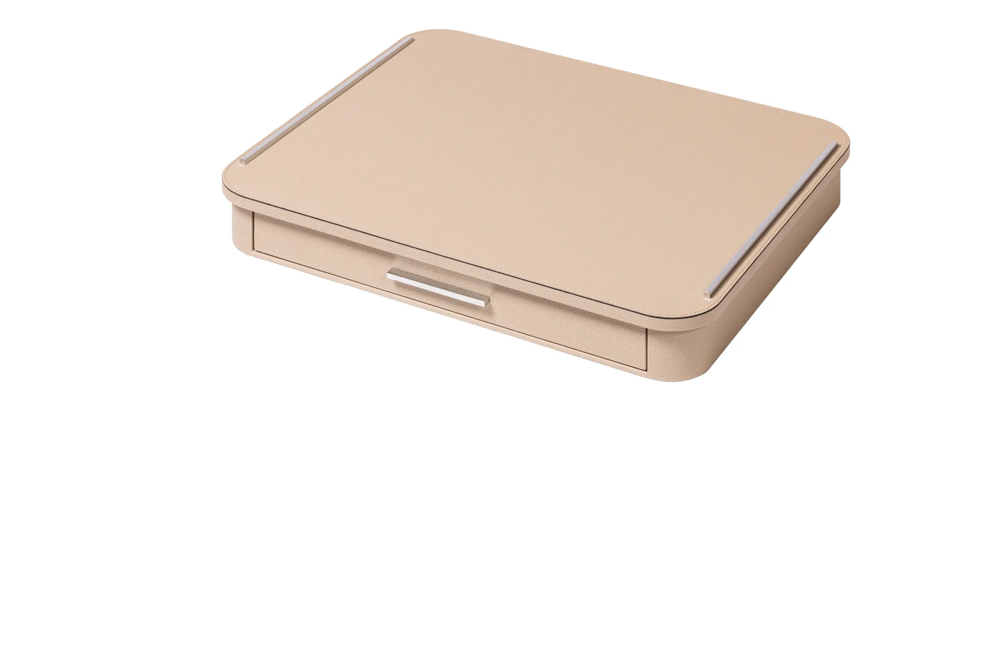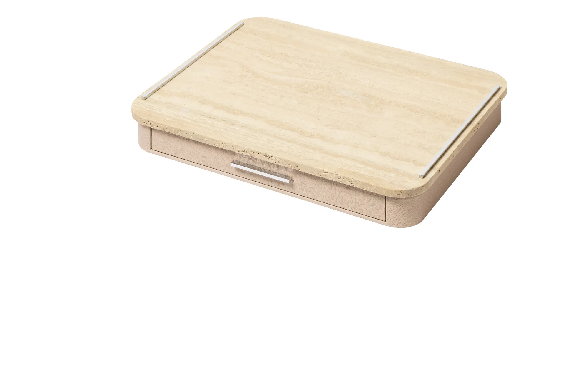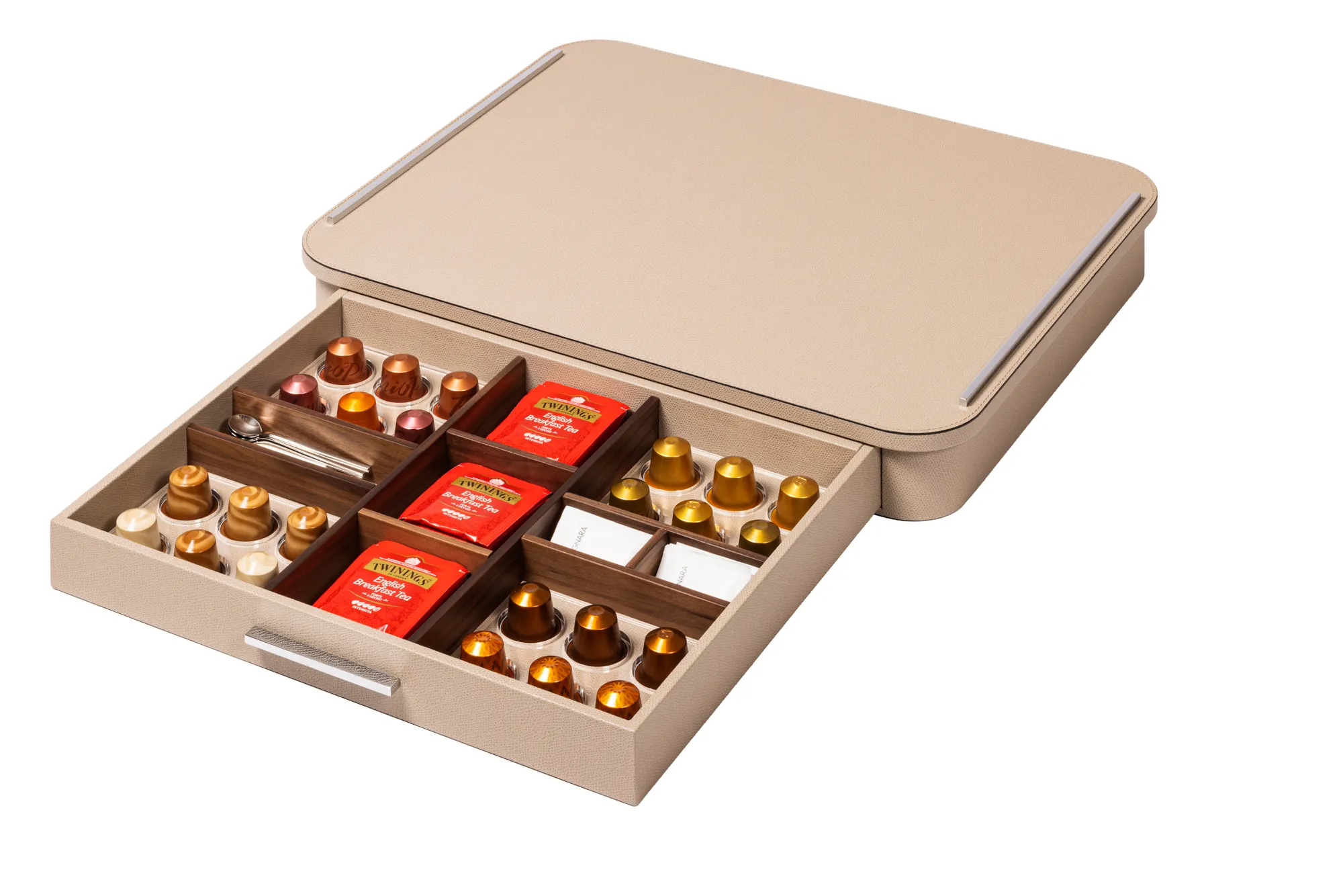 Leather-covered wood structure with metal inserts available in three finishes. The top can be customized in a refined selection of materials: leather, Corian®, or marble (available either in classic travertine or arabescato white). The drawer features inner walnut wood partitions to host coffee spoons, sugar, 24 Nespresso classic capsules and tea bags.