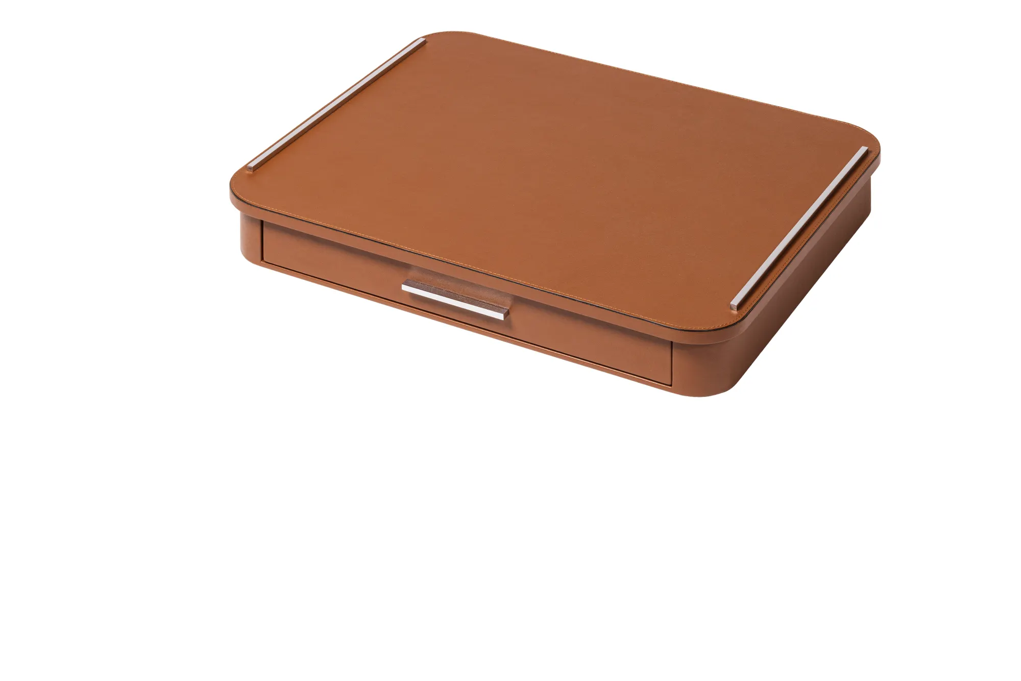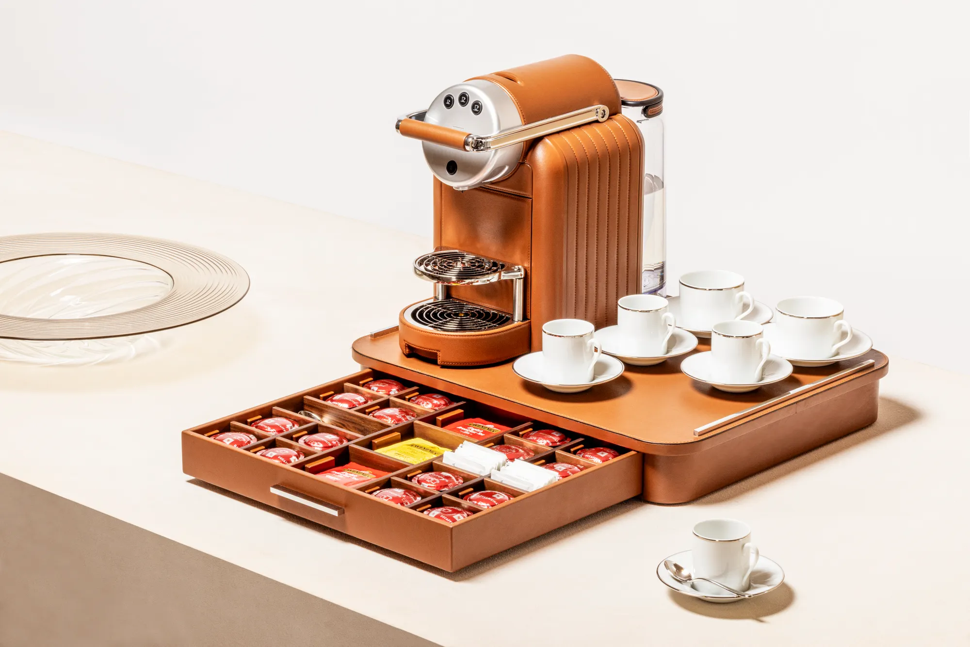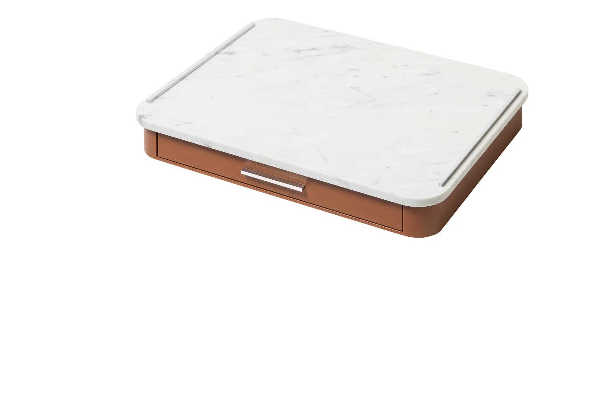Leather-covered wood structure with metal inserts available in three finishes. The top can be customized in a refined selection of materials: leather, Corian®, or marble (available either in classic travertine or arabescato white). The drawer features inner walnut wood partitions to host coffee spoons, sugar, 48 Nespresso professional capsules and tea bags.
