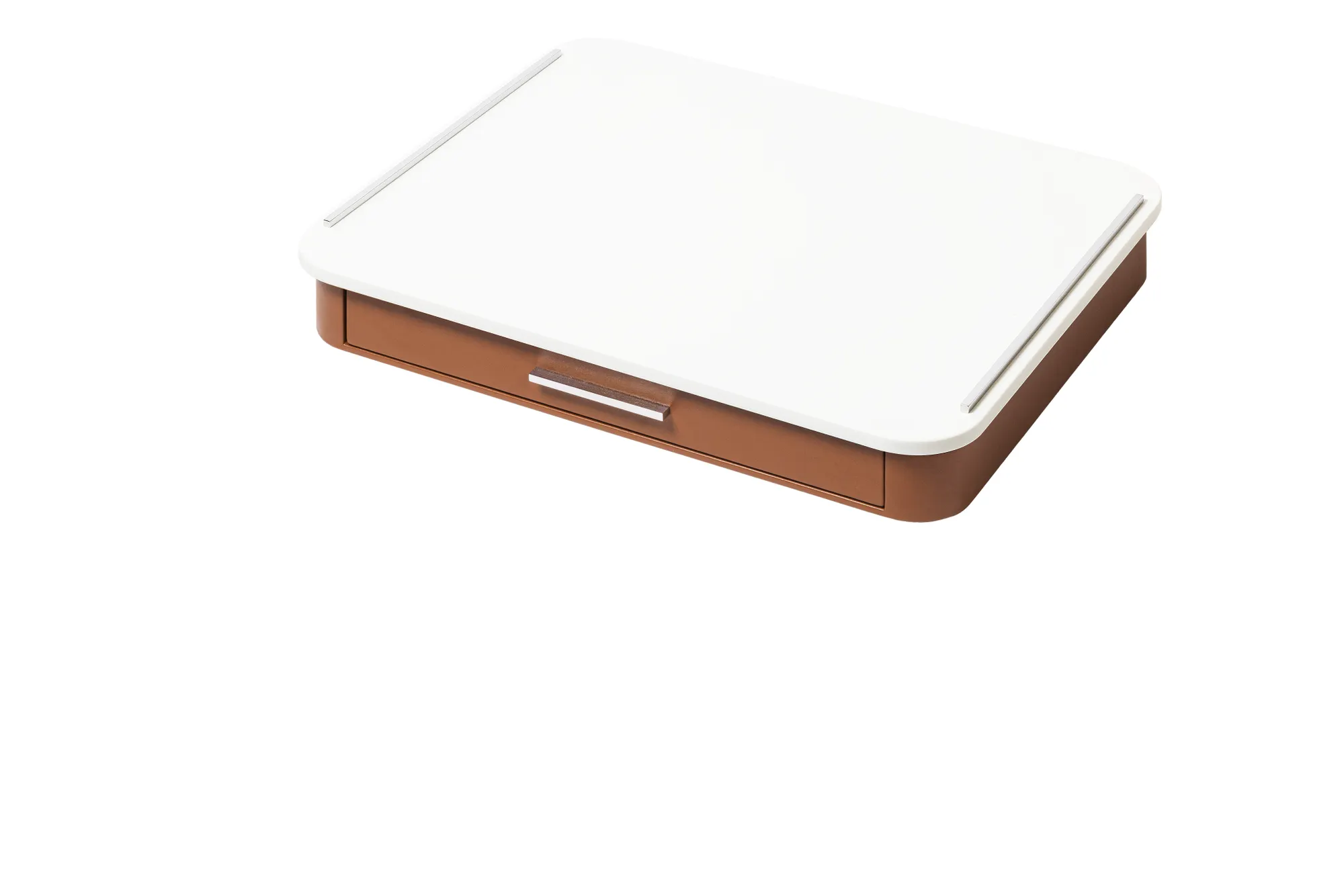 Leather-covered wood structure with metal inserts available in three finishes. The top can be customized in a refined selection of materials: leather, Corian®, or marble (available either in classic travertine or arabescato white). The drawer features inner walnut wood partitions to host coffee spoons, sugar, 48 Nespresso professional capsules and tea bags.